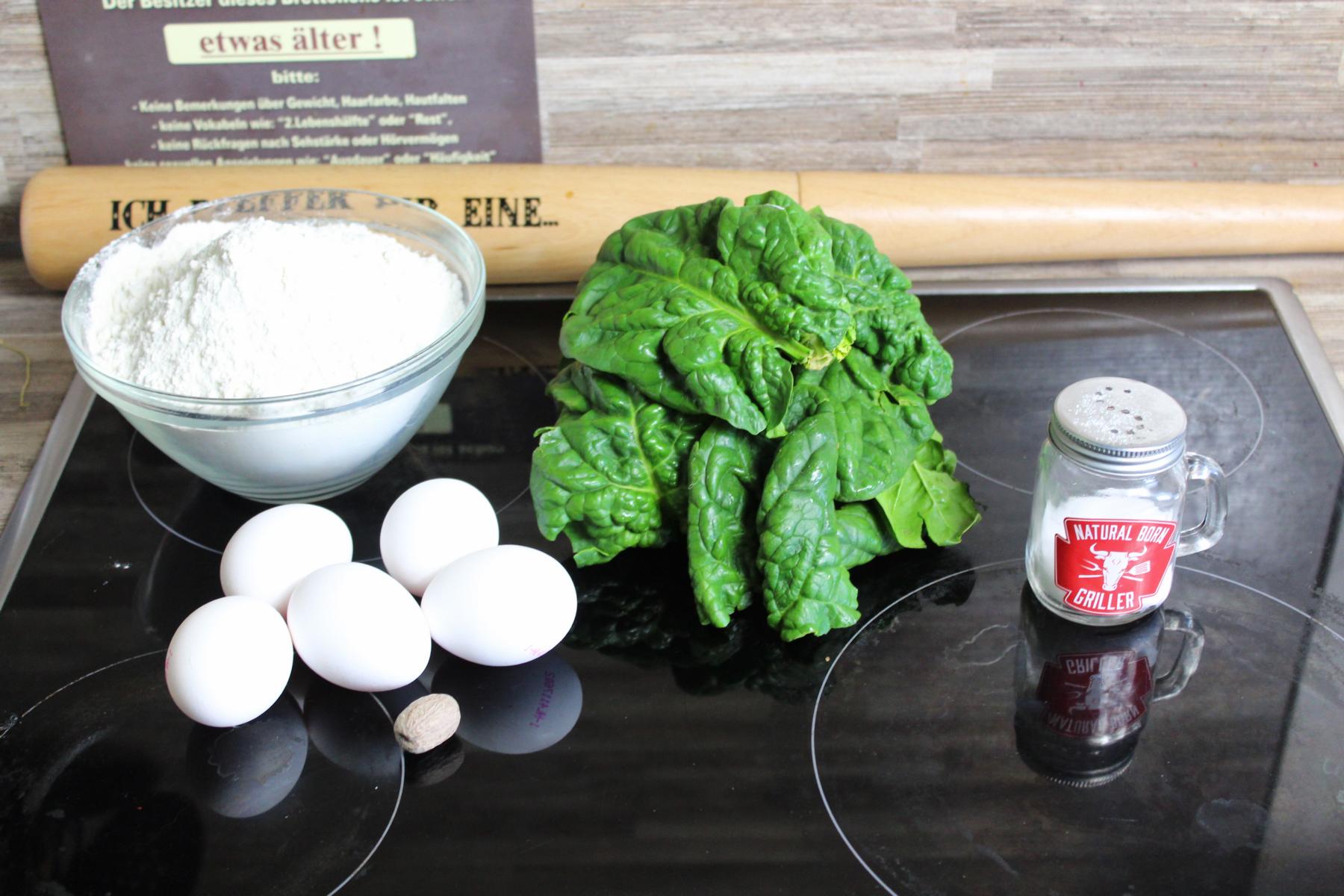 - Als erstes blanchiere ich den Spinat für etwa 5 Minuten in kochendem Wasser, tropfe ihn ab und püriere ihn zu einem Spinatbrei. In einer Schüssel wird nun aus diesem Brei, Mehl, den Eiern, Salz, Pfeffer und Muskat mit Hilfe des Handrührgerätes der Spätzleteig hergestellt.