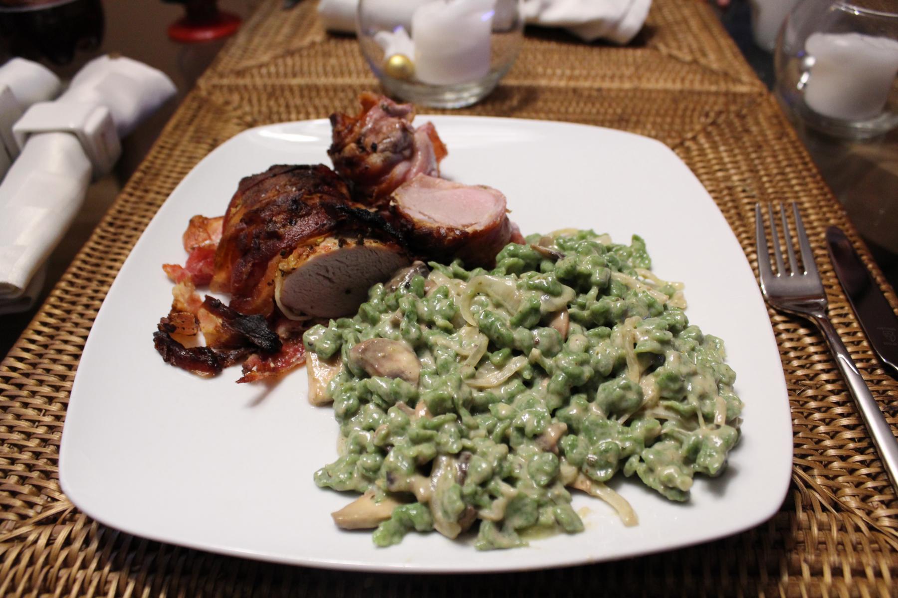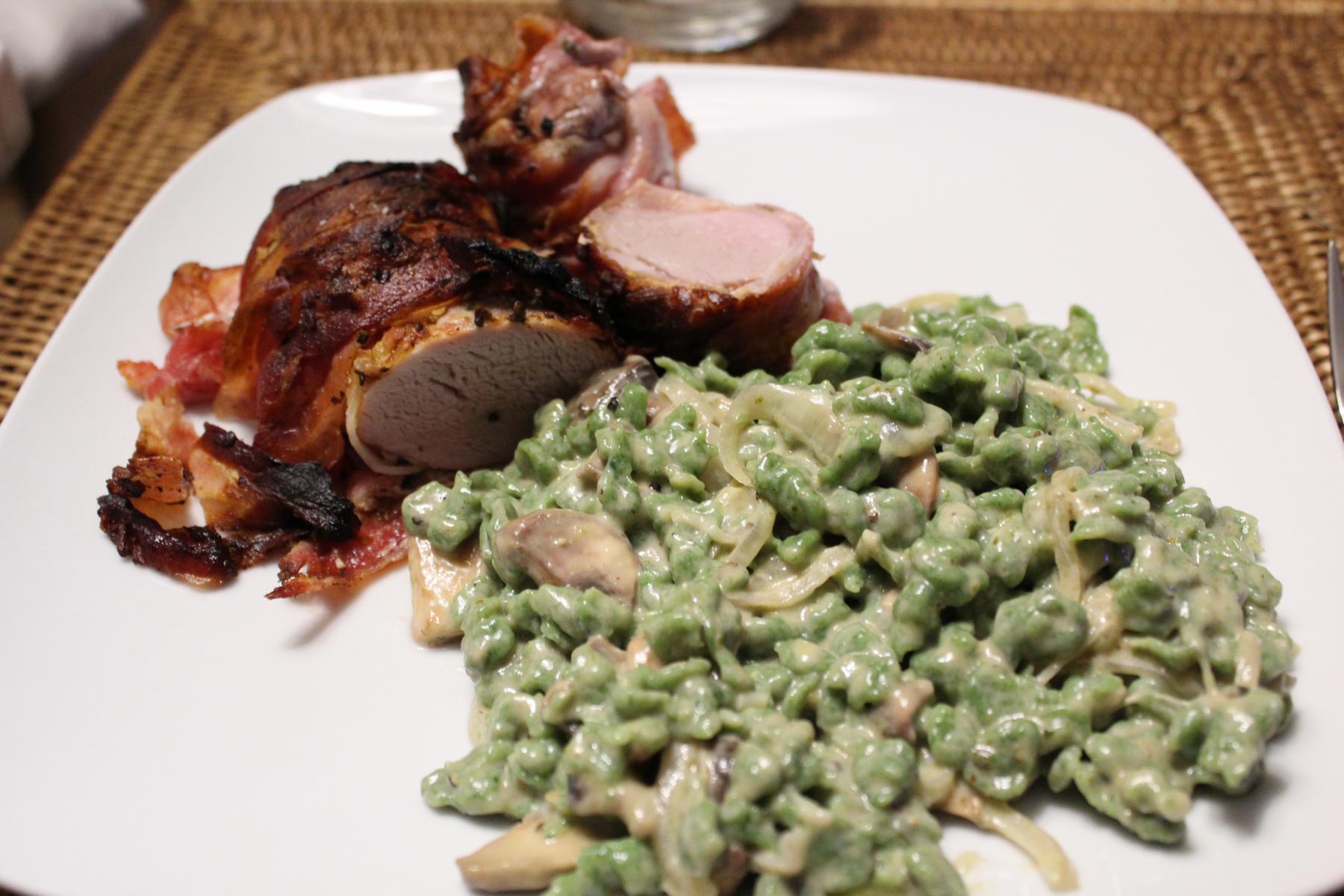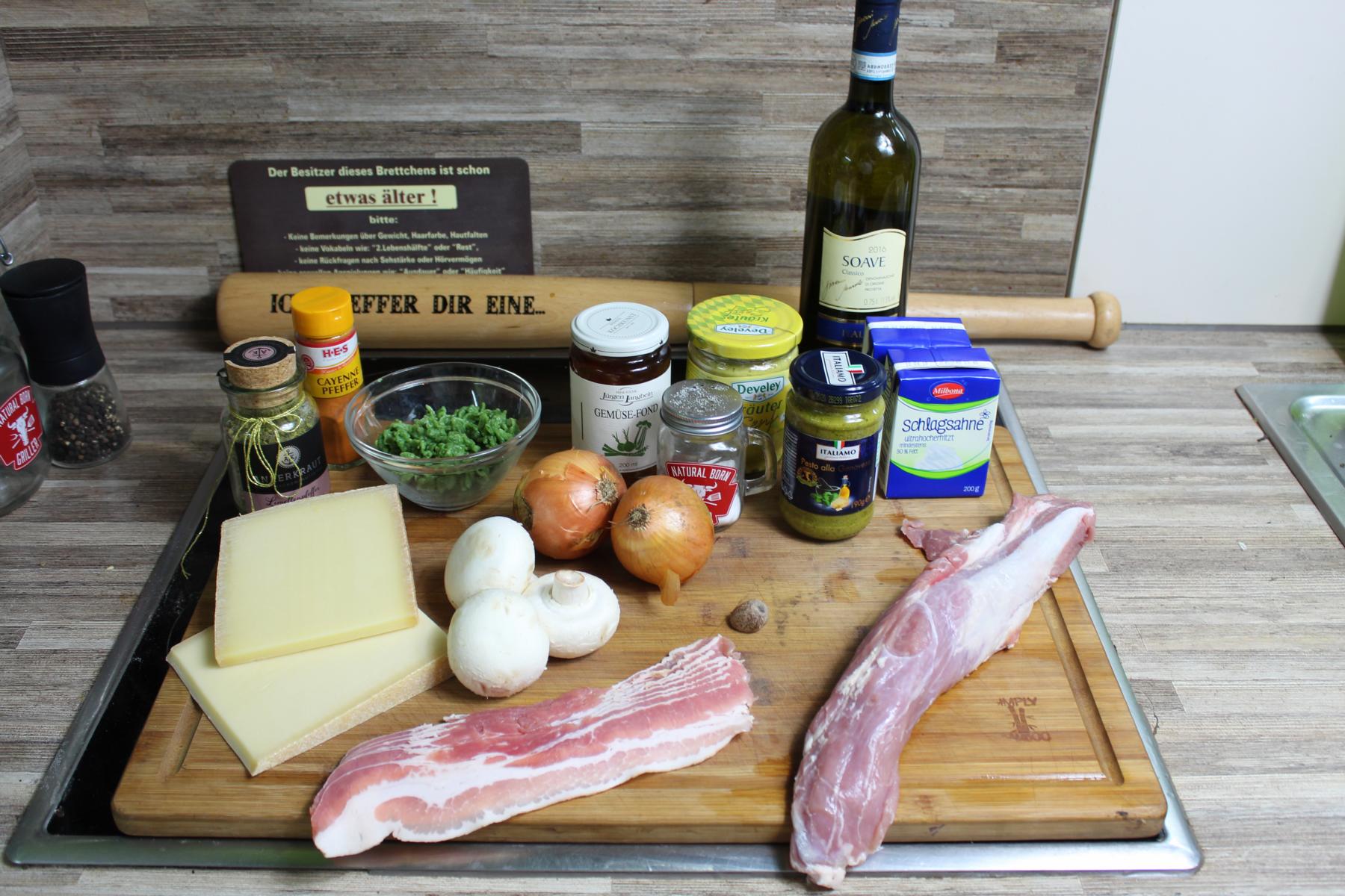 - Als nächstes schneide ich die Zwiebeln in halbe Ringe, die Pilze in Scheiben und reibe den Gruyere Käse. Somit sind die Vorbereitungen für die Spinatspätzle abgeschlossen und ich kann mich noch schnell um das Schweinefilet kümmern.