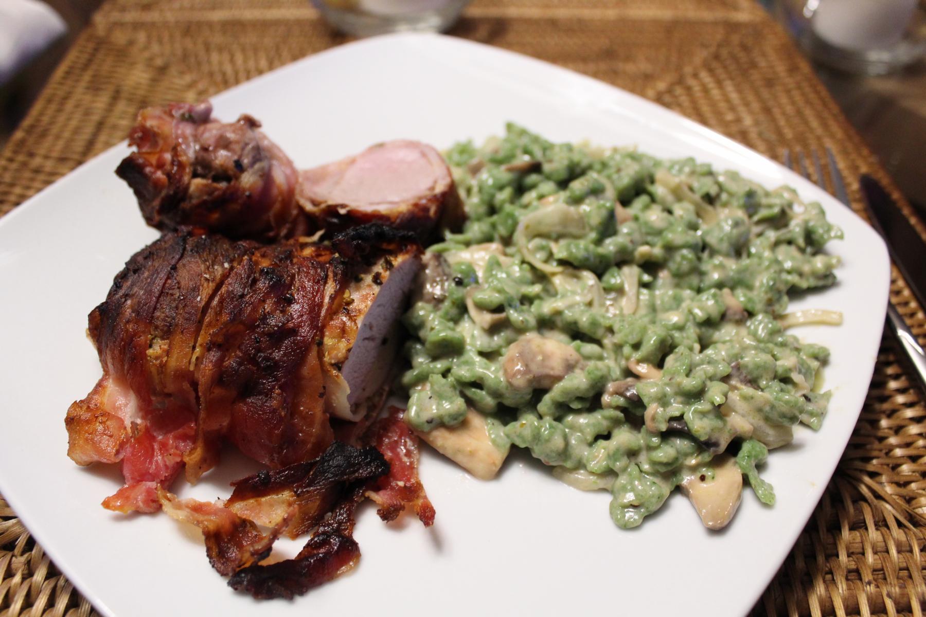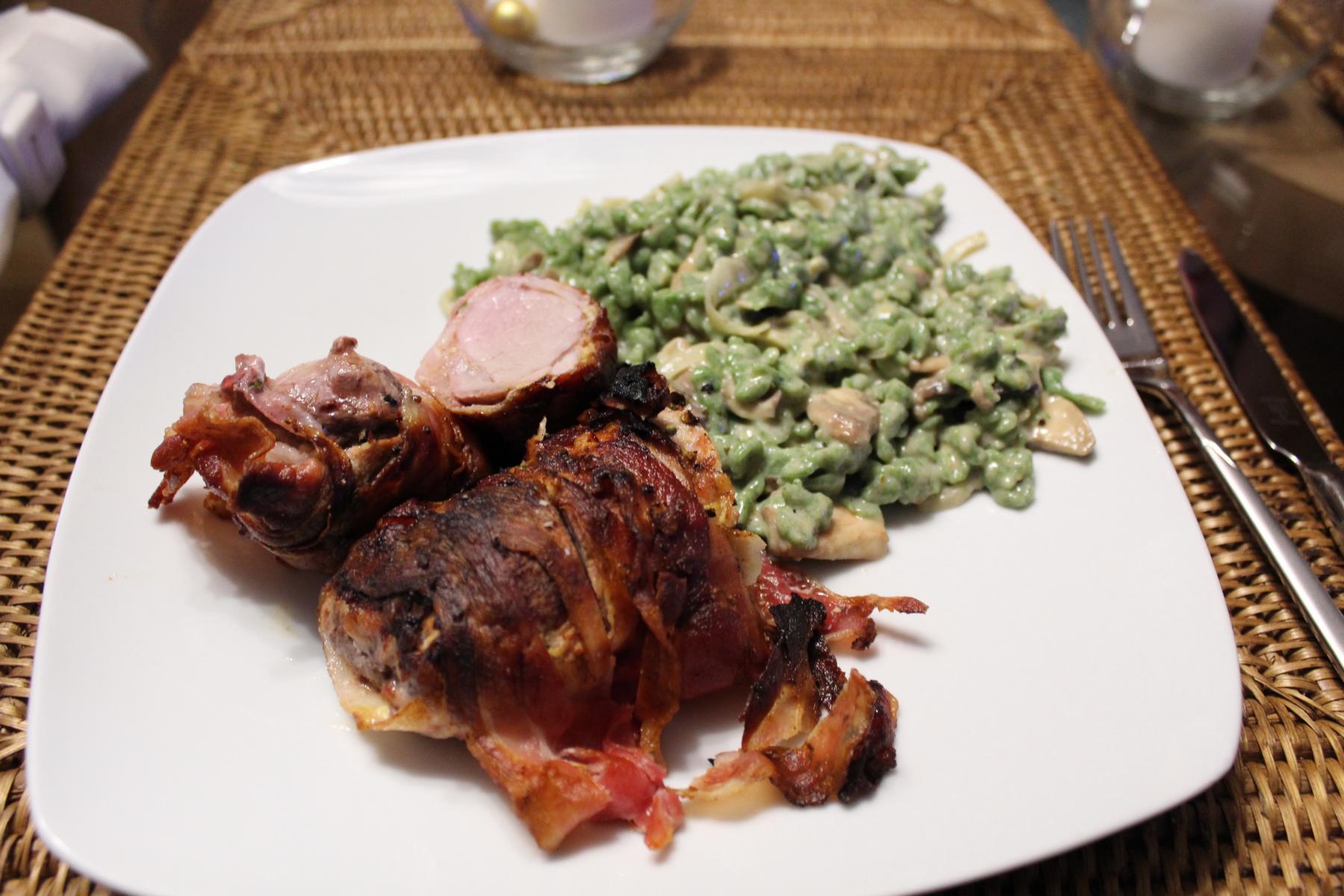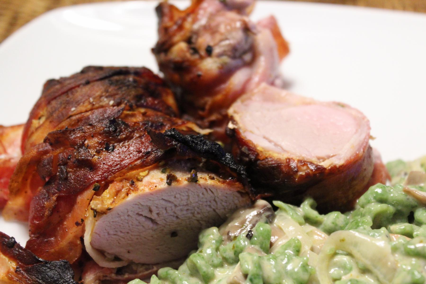 - Nachdem dieses pariert wurde, reibe ich es mit Kräutersenf ringsum ein, würze es mit Salz und Pfeffer und wickle es in die Bacon-Scheiben.