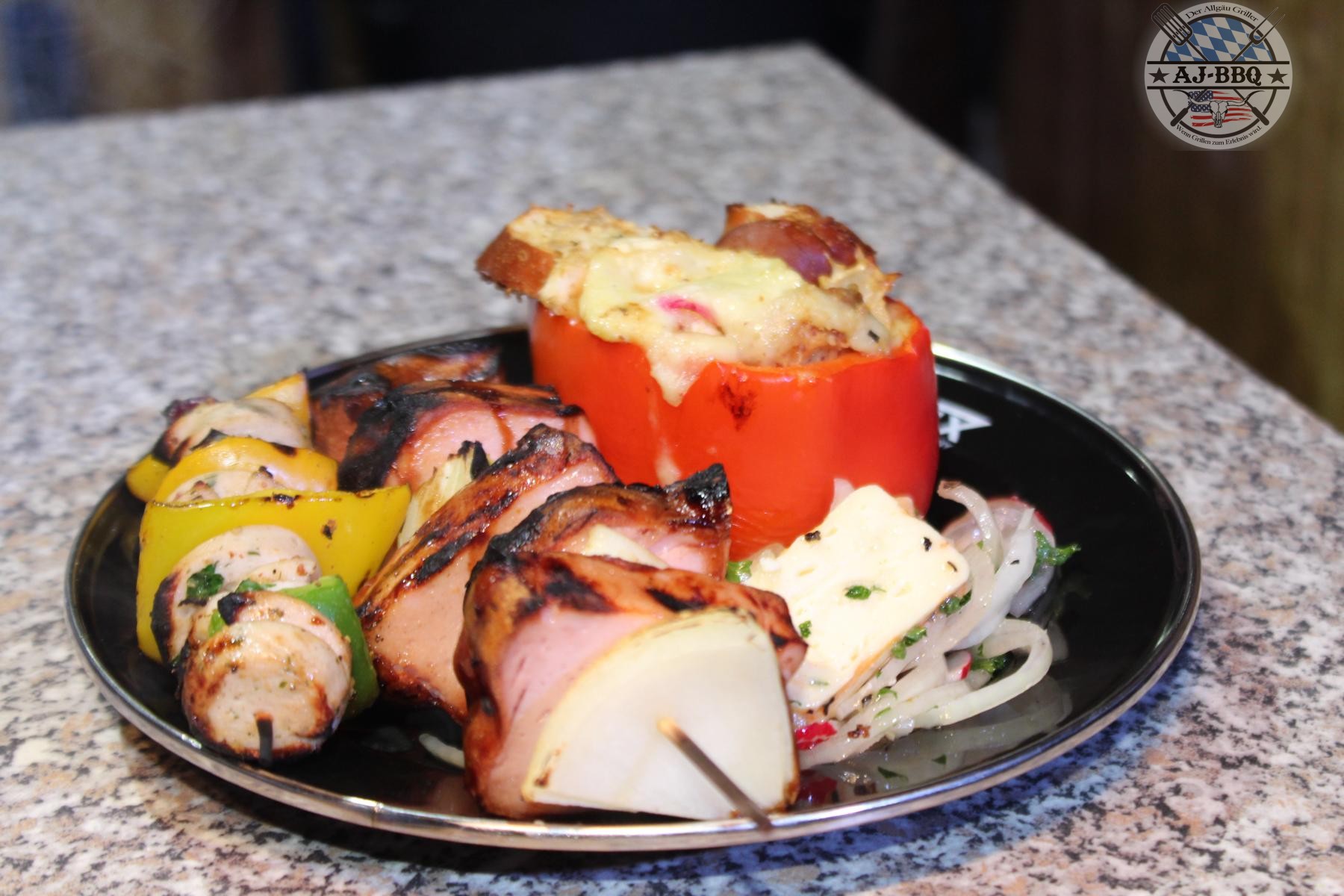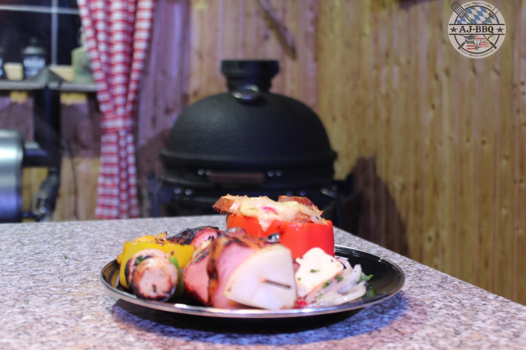 - In diese indirekte Grillzone gebe ich nun die Paprikas. Die brauchen etwa 15 – 20 Minuten bis sie schön weich sind und der Käse der Füllung zart verschmolzen ist. Mir läuft es schon wieder im Mund zusammen wenn ich nur daran denke! In dieser Zeit grille ich die Spieße über der direkten Zone. Bei diesen geht es heute nur darum, dass sie heiß werden und leckere Röstaromen bekommen. Die Weißwurst wird bei der Herstellung gebrüht und der Leberkäse gebacken. Somit ist das verwendete Fleisch schon durchgegart und muss nur noch erhitzt werden.