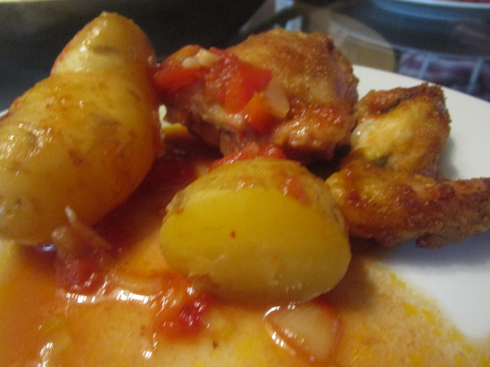 - Ist die Temperatur erreicht und die Pfanne heiß, werden die zwei EL Öl in der Pfanne erhitzt und die Hähnchenteile werden darin rundherum goldbraun angebraten. Dann kommen die Hähnchenteile wieder heraus und werden beiseite gestellt.