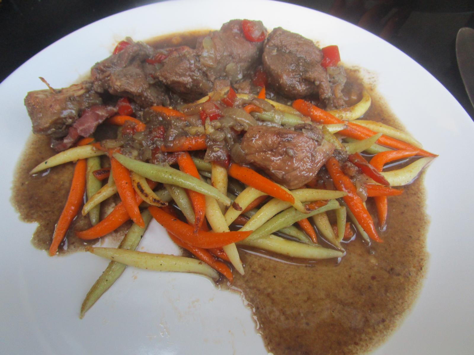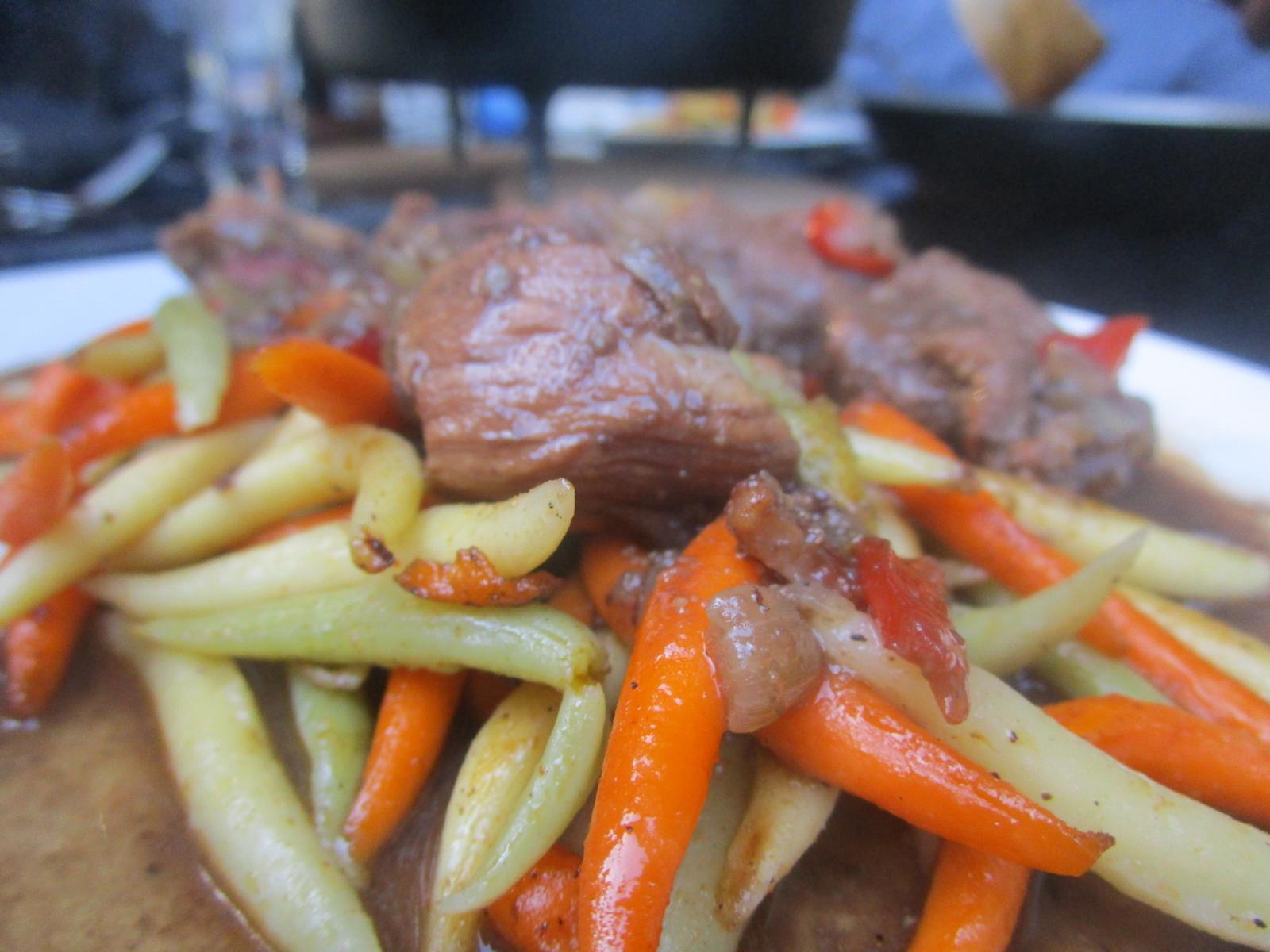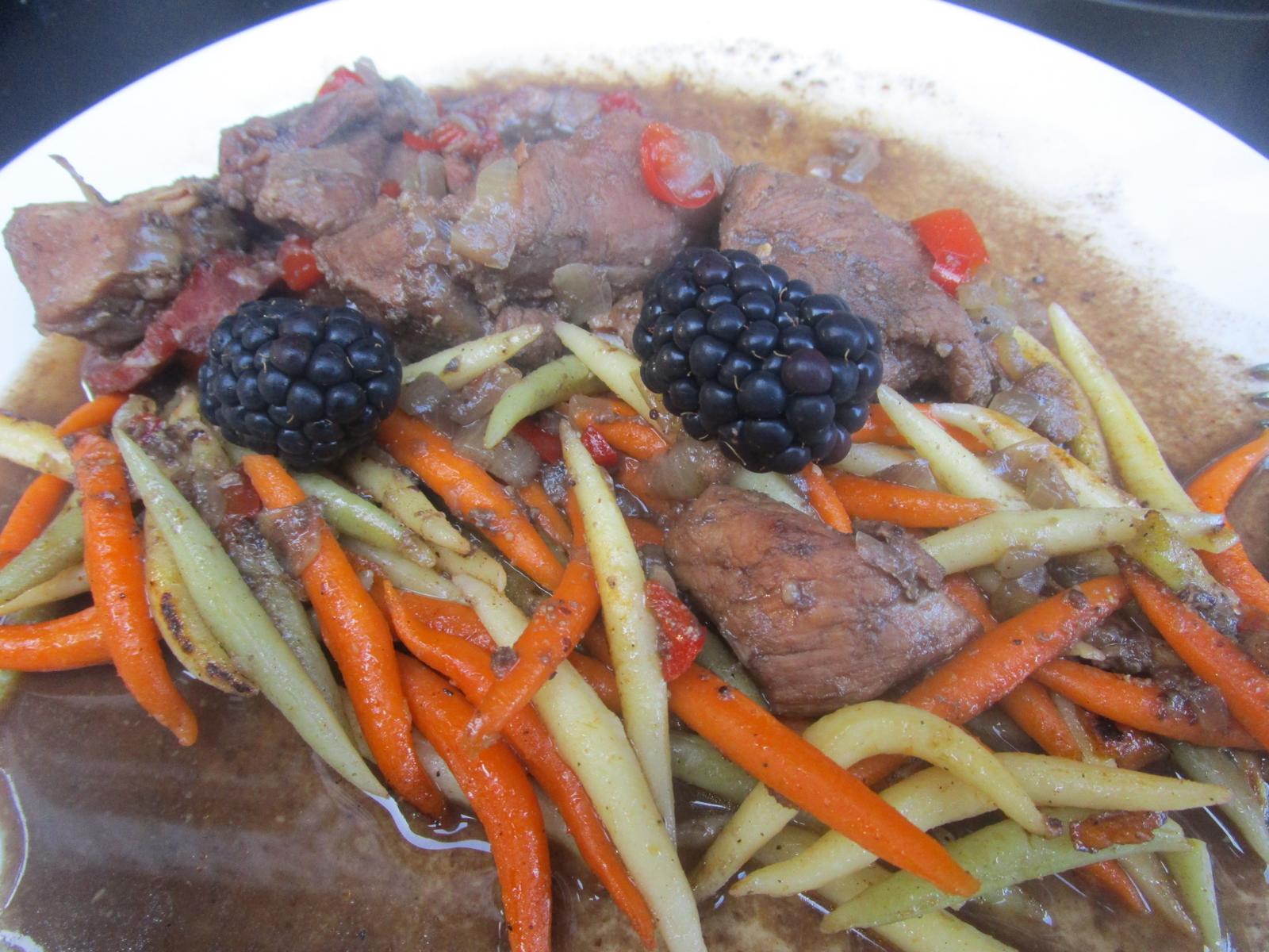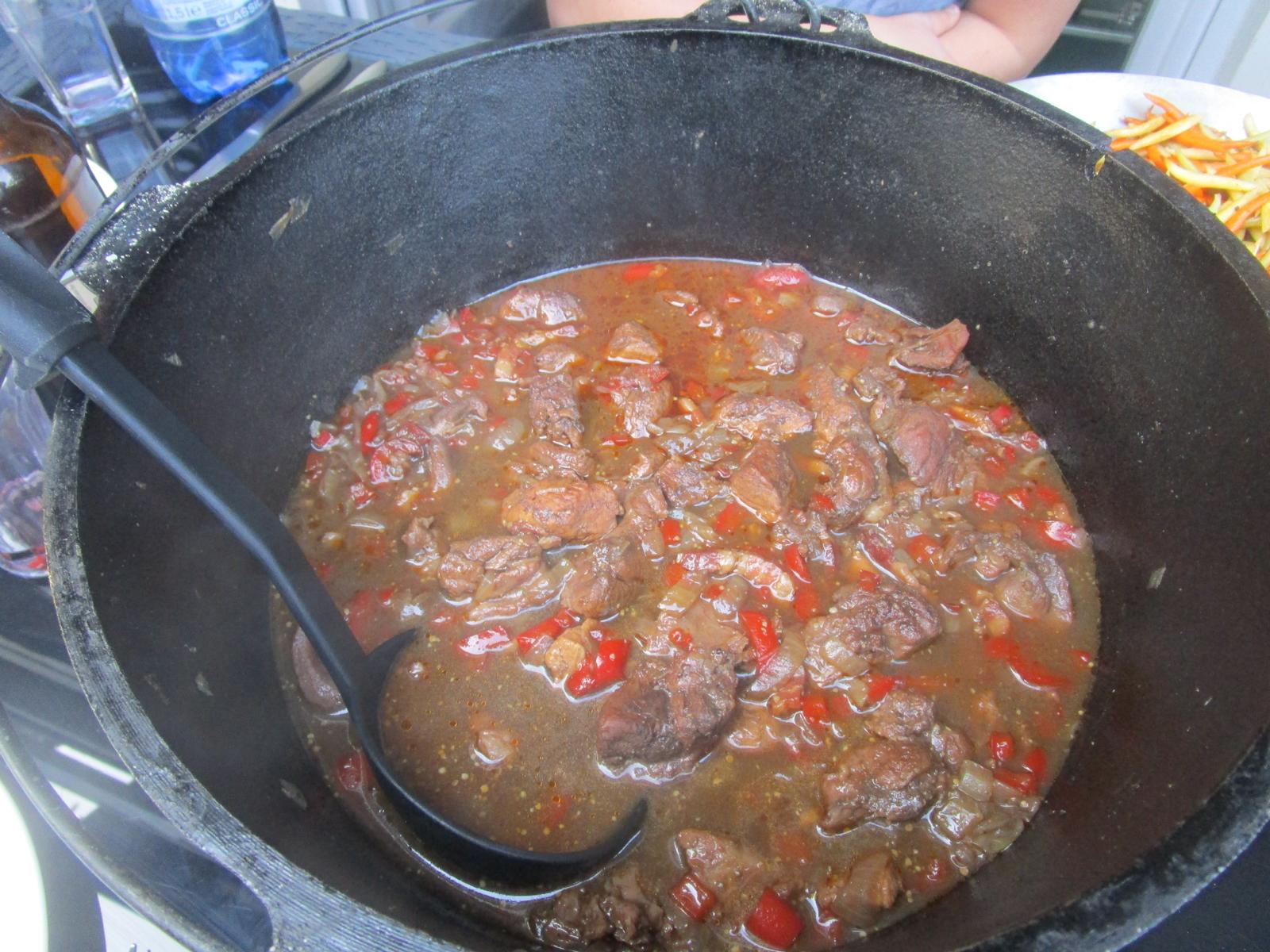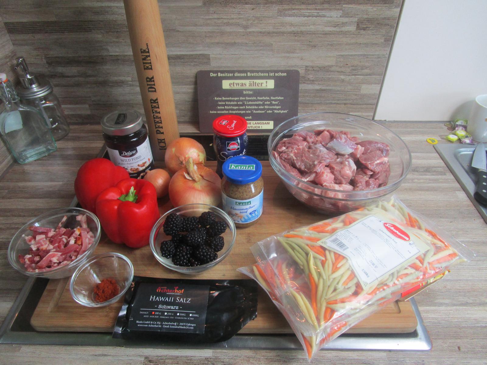 - Nun lösche ich alles mit dem Wildfond und dem Wasser ab, gebe das Brombeergelee in den Dopf und schütte dann meine Paprikawürfel dazu. Jetzt nur noch kräftig vermischen und den Deckel schließen, dann kann alles für 2 – 3 Stunden kochen. Dabei gilt natürlich: Je länger der Kochvorgang, desto zarter wird das Fleisch. Aber Vorsicht, es wird irgendwann verkochen und ihr habt nur noch Mus im Dopf.