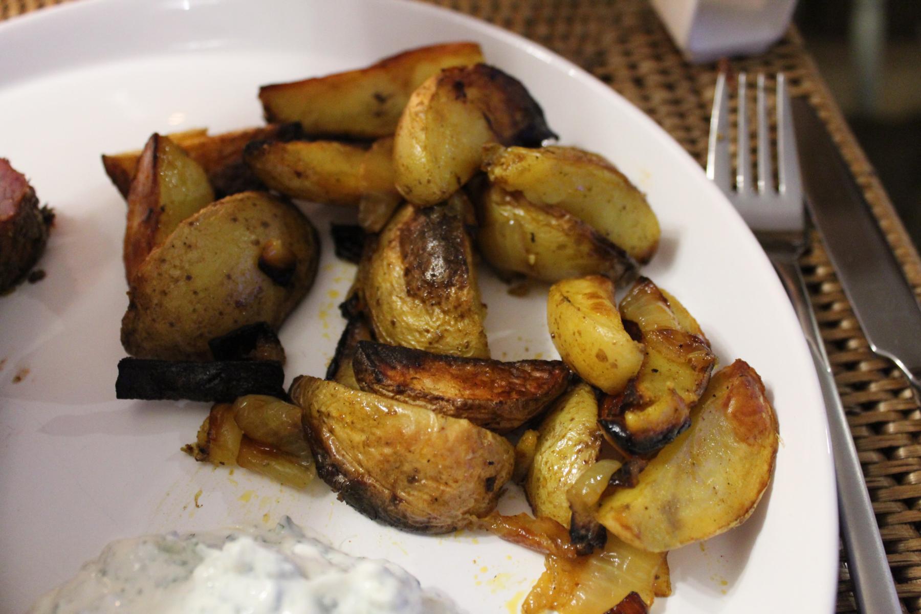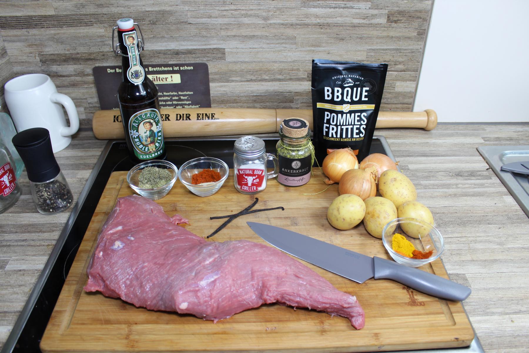 - Jetzt schneide ich noch schnell die Zwiebeln und Kartoffeln. Die Zwiebeln werden nur geviertelt und die Kartoffeln schneide ich in die berühmte Westernstyle Ecken.