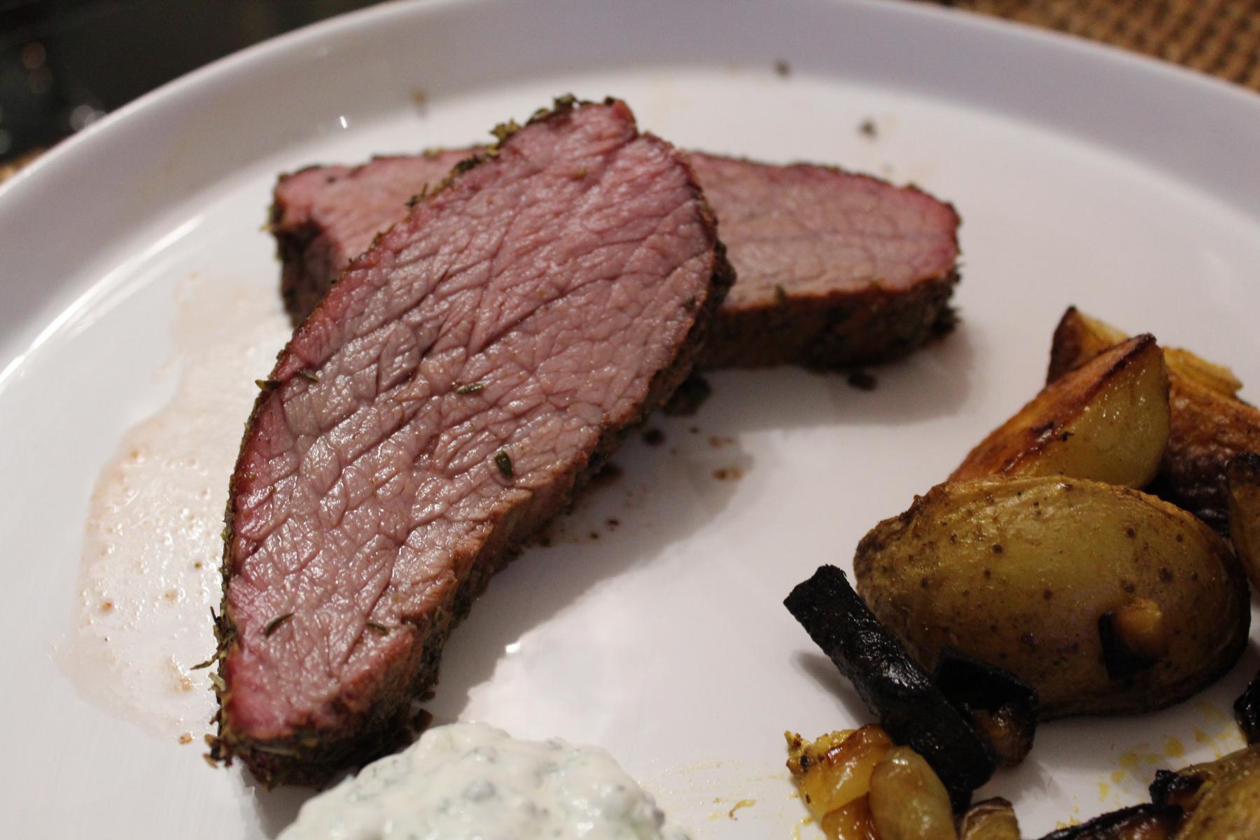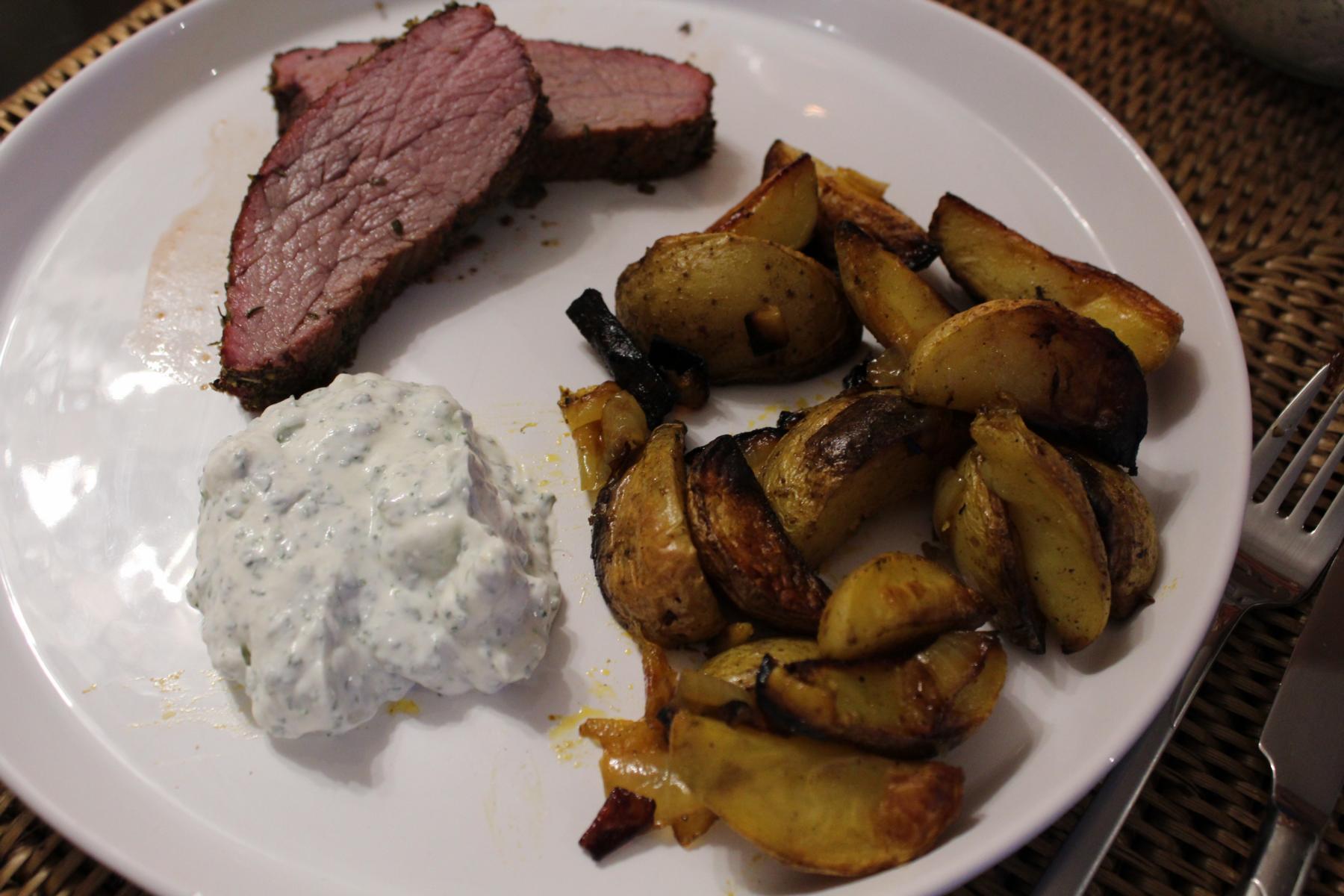 - Nach Ablauf der Grillzeit habt ihr dann wunderbar saftiges Bürgermeisterstück mit phantastisch leckeren Ofenkartoffeln! Dazu reiche ich eine Portion Sour Cream. Natürlich auch selbstgemacht.