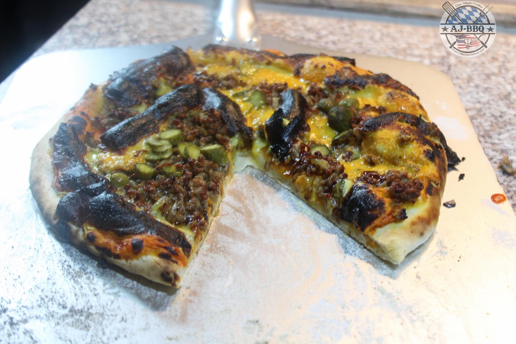 - So geht die Pizza in den Grill/Pizzaofen. In meinem Pizzaofen ist die Pizza dann nach etwa zweieinhalb Minuten fertig, wobei ich sie nach der Hälfte der Zeit um 180° drehe, damit beide Seiten gleich gebräunt werden.