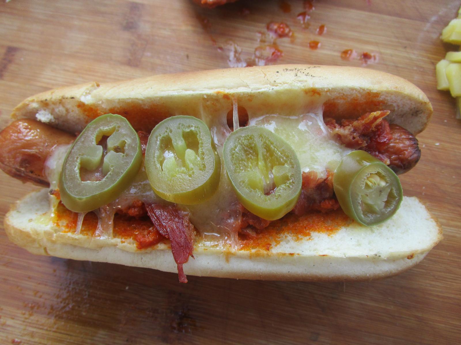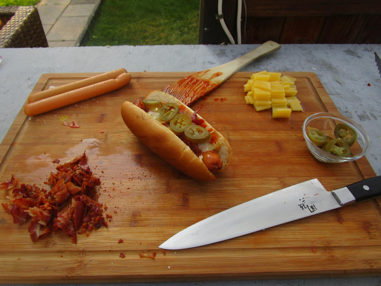 - Jetzt werden die Chili-Cheese-Dogs noch zusammengebaut. Erst das Würstchen in das Brot, dann kommen Bacon, Chilisauce und Käse rein. Das Ganze wird jetzt nur noch kurz im Grill überbacken, kann dann mit Jalapenos belegt werden und schon ist alles fertig.