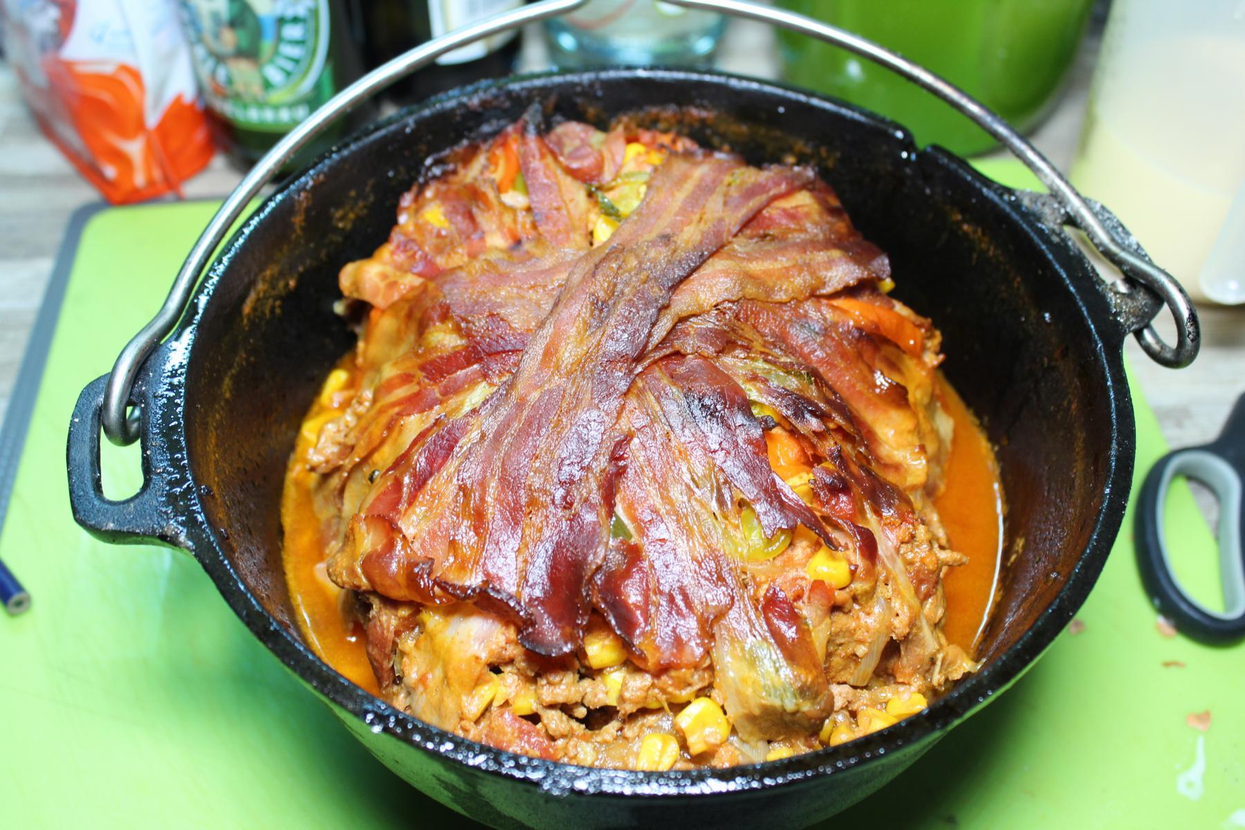 - Als nächstes wird geschichtet. Dafür lege ich die erste Scheibe Fleisch, dann Zwiebeln und Paprika und zu letzt Chili in den Dutch Oven. Das mache ich abwechselnd bis der Dutch Oven gefüllt ist. Nun Belege ich alles noch mit Jalapenos und Bacon und schon kann ich in den Garten um die Kohle zu zünden.