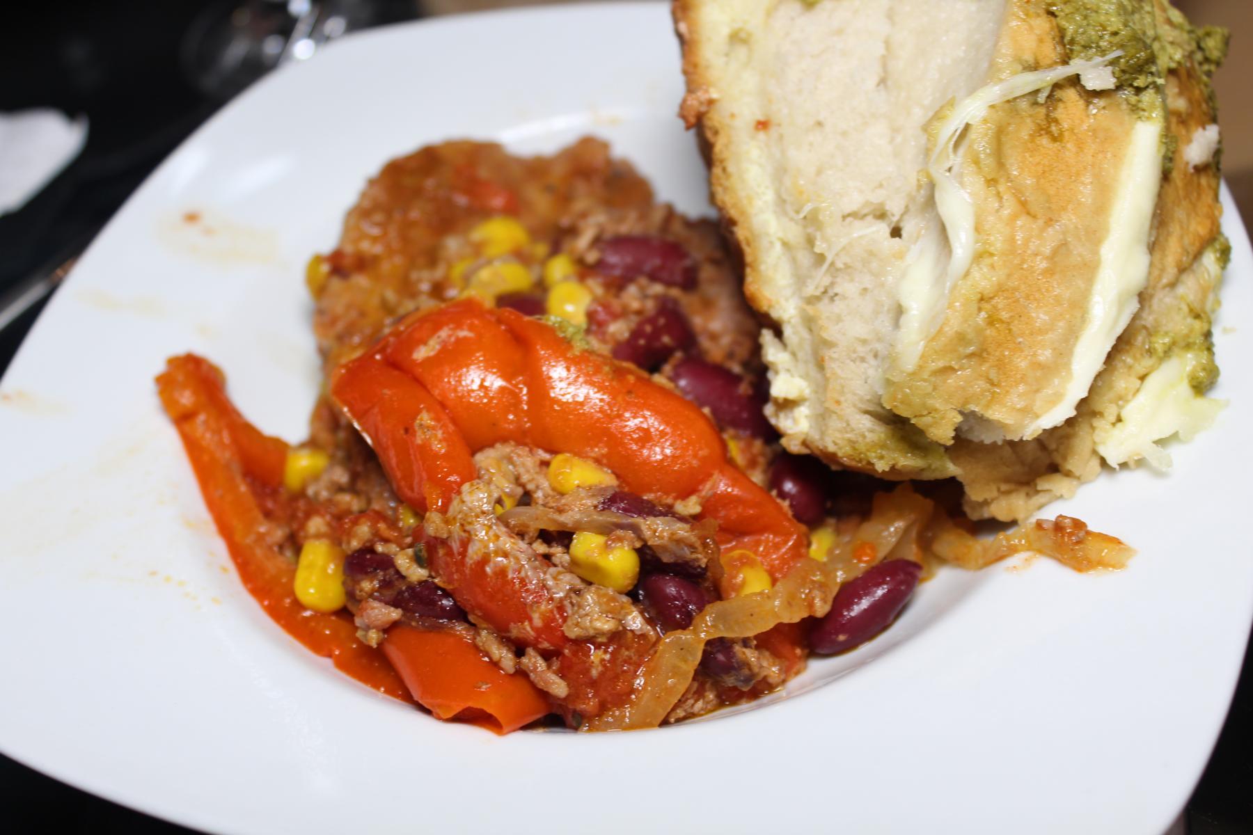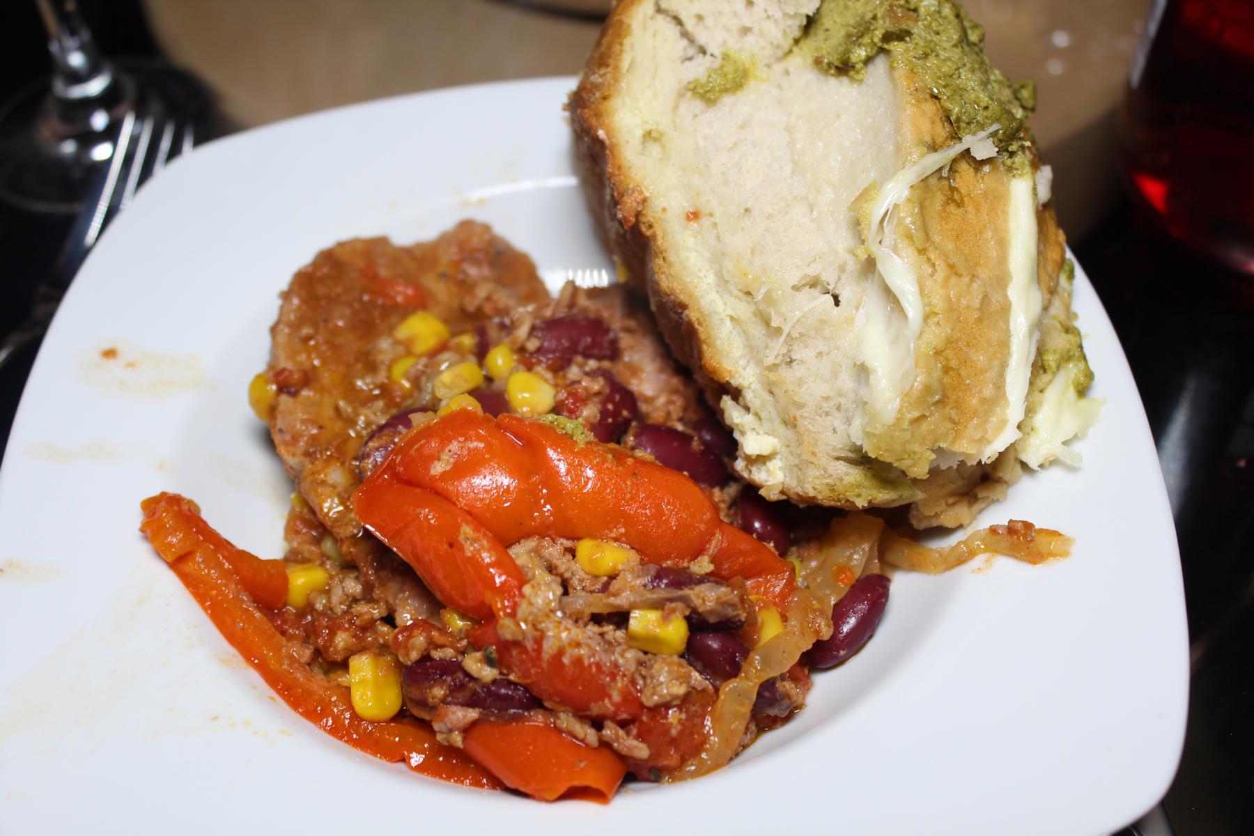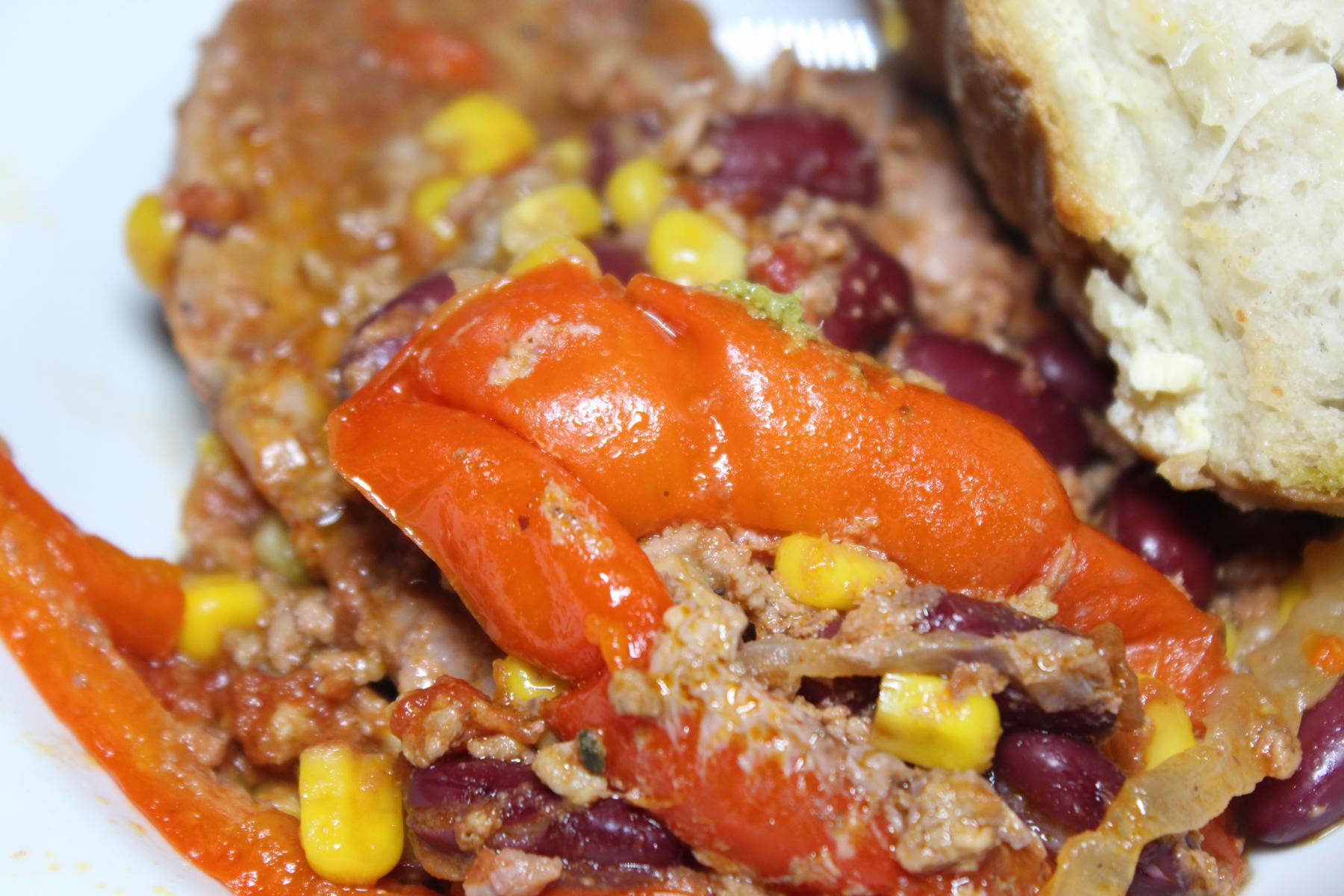 - Sobald diese weich und glasig sind kommen die Tomaten, der Mais und die Bohnen mit dazu. Ich lasse alles aufkochen und würze es mit Salz, Pfeffer, Chili, etc.
