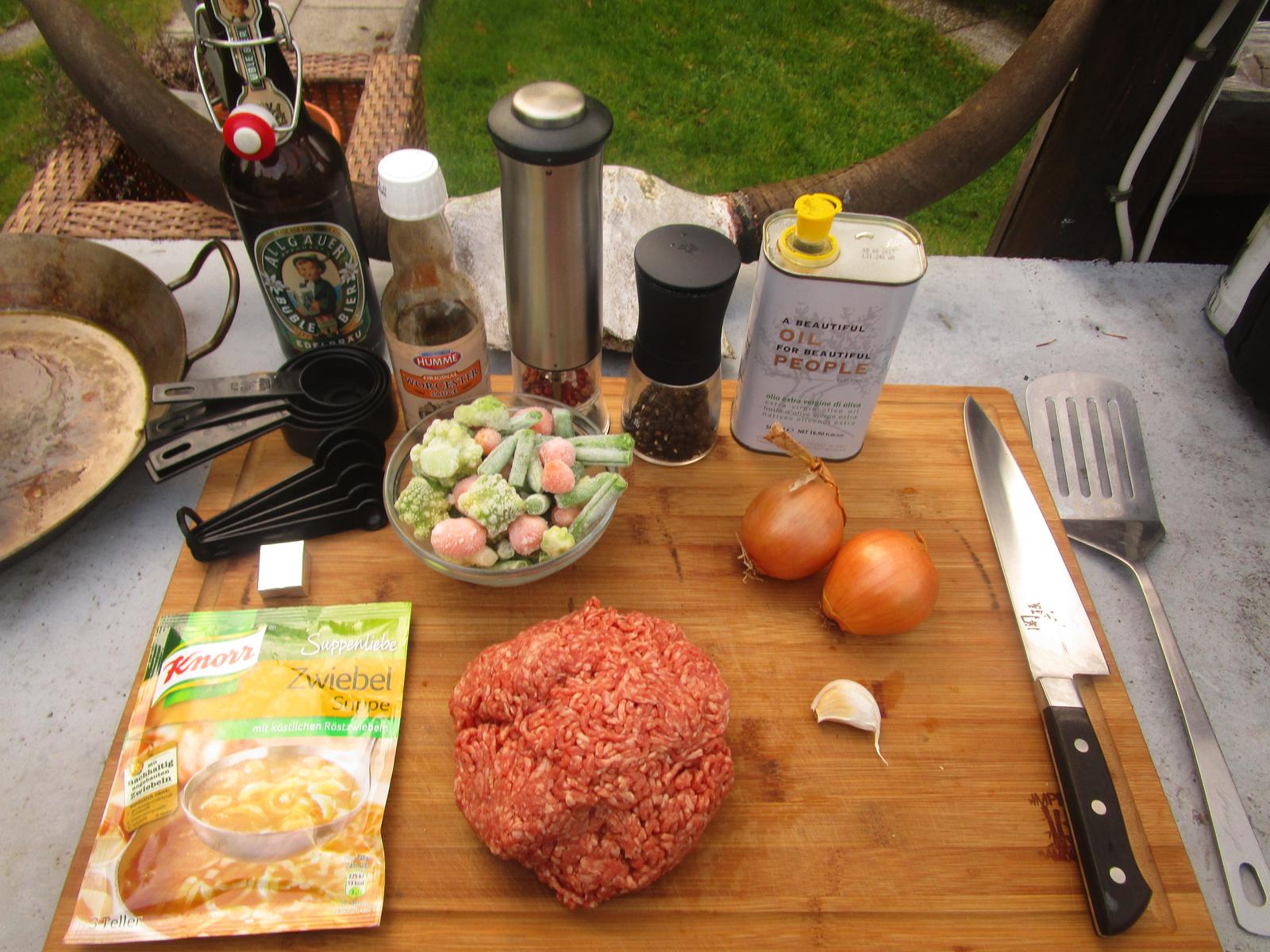 - Jetzt gebe ich die Worcestersoße Sauce, dir Rinderbrühe, das gefrorene Gemüse und den Zwiebelsuppenmix dazu und lasse alles bei geschlossenem Grilldeckel für etwa 10 Minuten kochen.