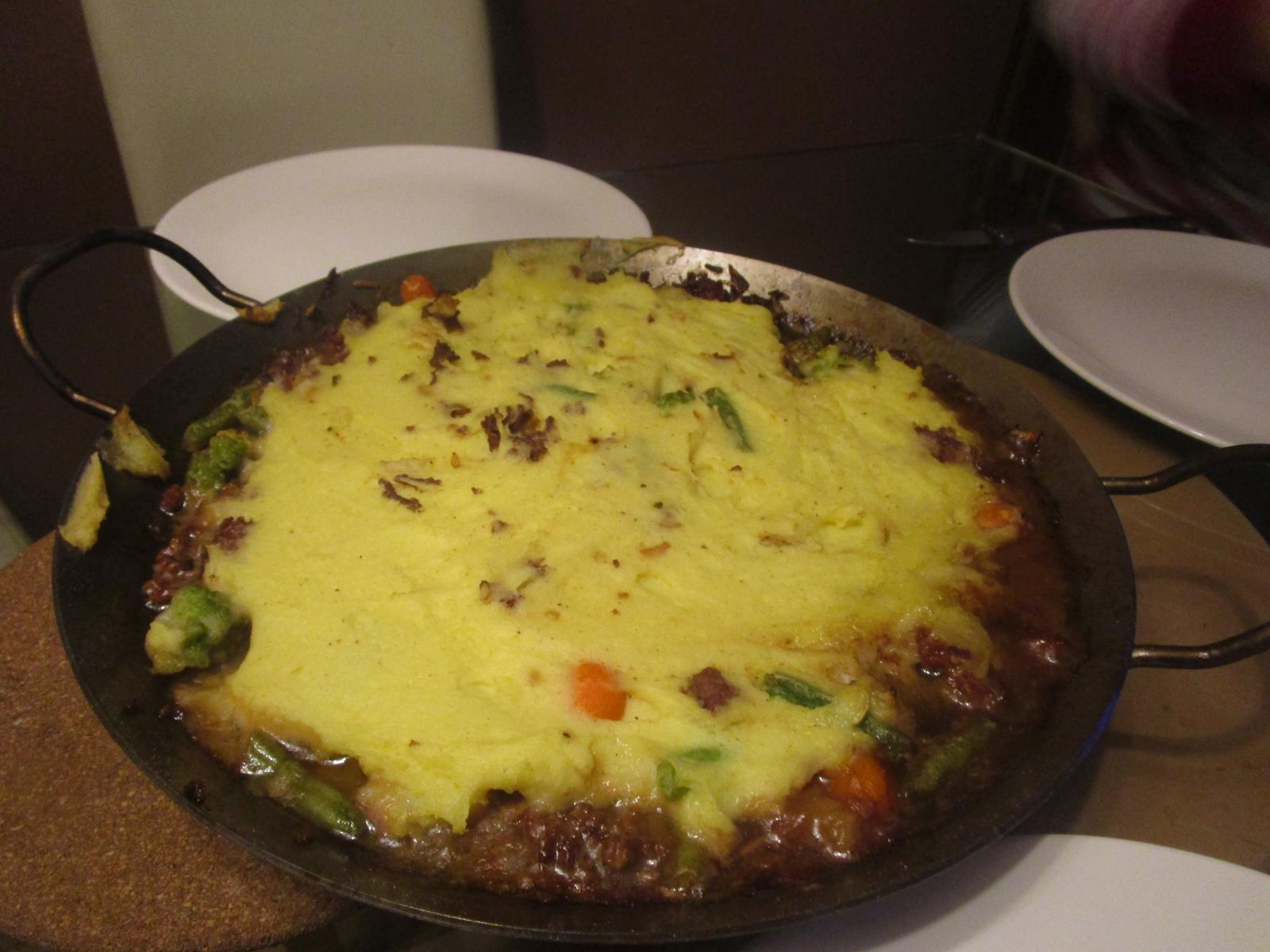 - Jetzt wird die Grilltemperatur auf 170°C – 180°C gesenkt. Wenn das erreicht ist, streiche ich den inzwischen Zubereiteten Kartoffelbrei auf das Fleisch, schließe den Grilldeckel und lasse alles für weitere 45 Minuten vor sich hin schmoren.
