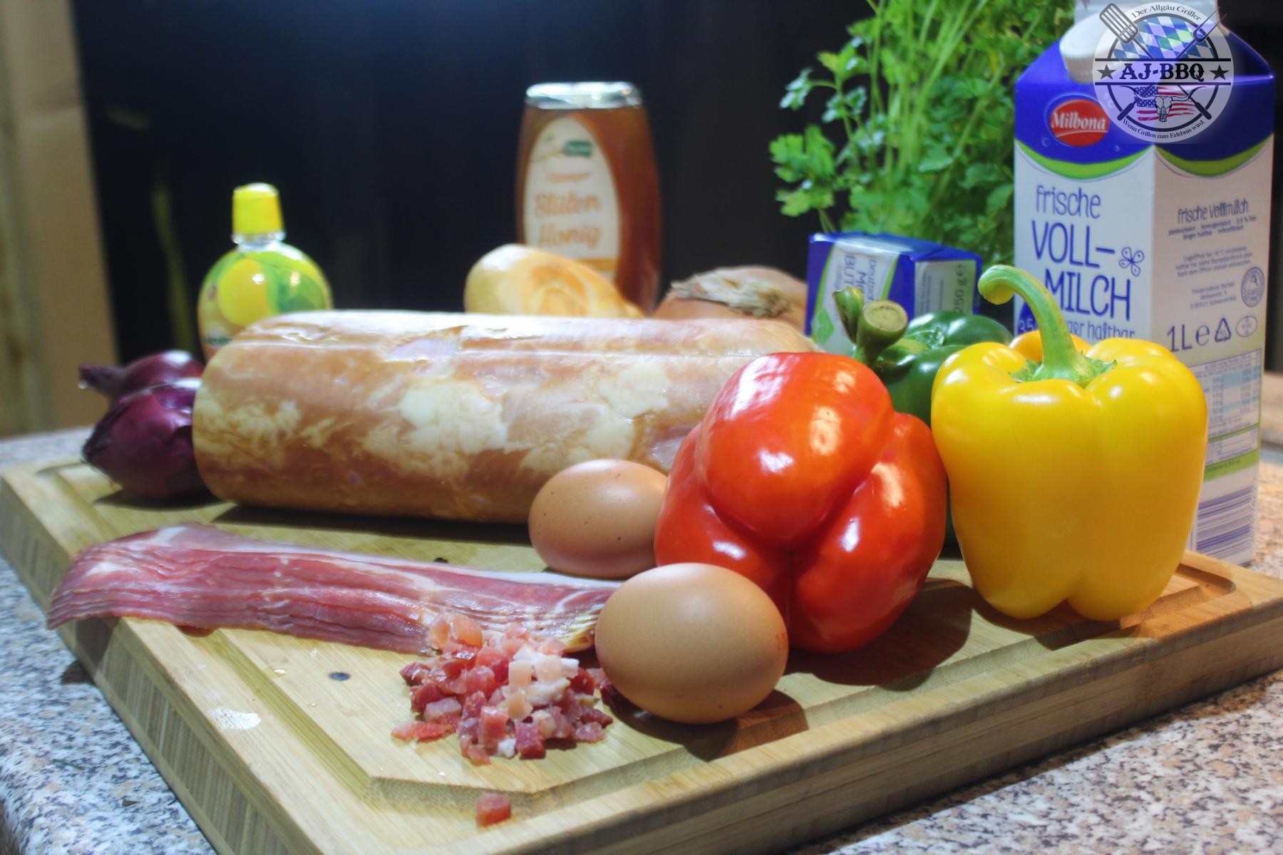 Für mein heutiges Rezept muss ich erst einmal einen Semmelknödelteig herstellen. Dafür schneide ich alle Semmeln in etwa 2 cm große Würfel. Während dieses Vorgangs heize ich neben zu schon mal den Grill auf 160°C vor und schaffe mir einen indirekten Bereich. In meinem Fall verwende ich den, welcher nur indirekt grillen kann. Sind die Semmelwürfel dann alle geschnitten gebe ich sie in eine Schüssel und übergieße sie mit der vorher erwärmten Milch. So lasse ich die Semmelknödelmasse erst einmal für etwa 15 Minuten stehen. In dieser Zeit saugen sich die Semmeln voller Milch und die Milch kühlt wieder etwas ab. Dann gebe ich die Eier, die gewürfelte Gemüsezwiebeln, die Baconwürfel und einen halben Bund Petersilie (gehackt) dazu, schmecke alles mit meiner