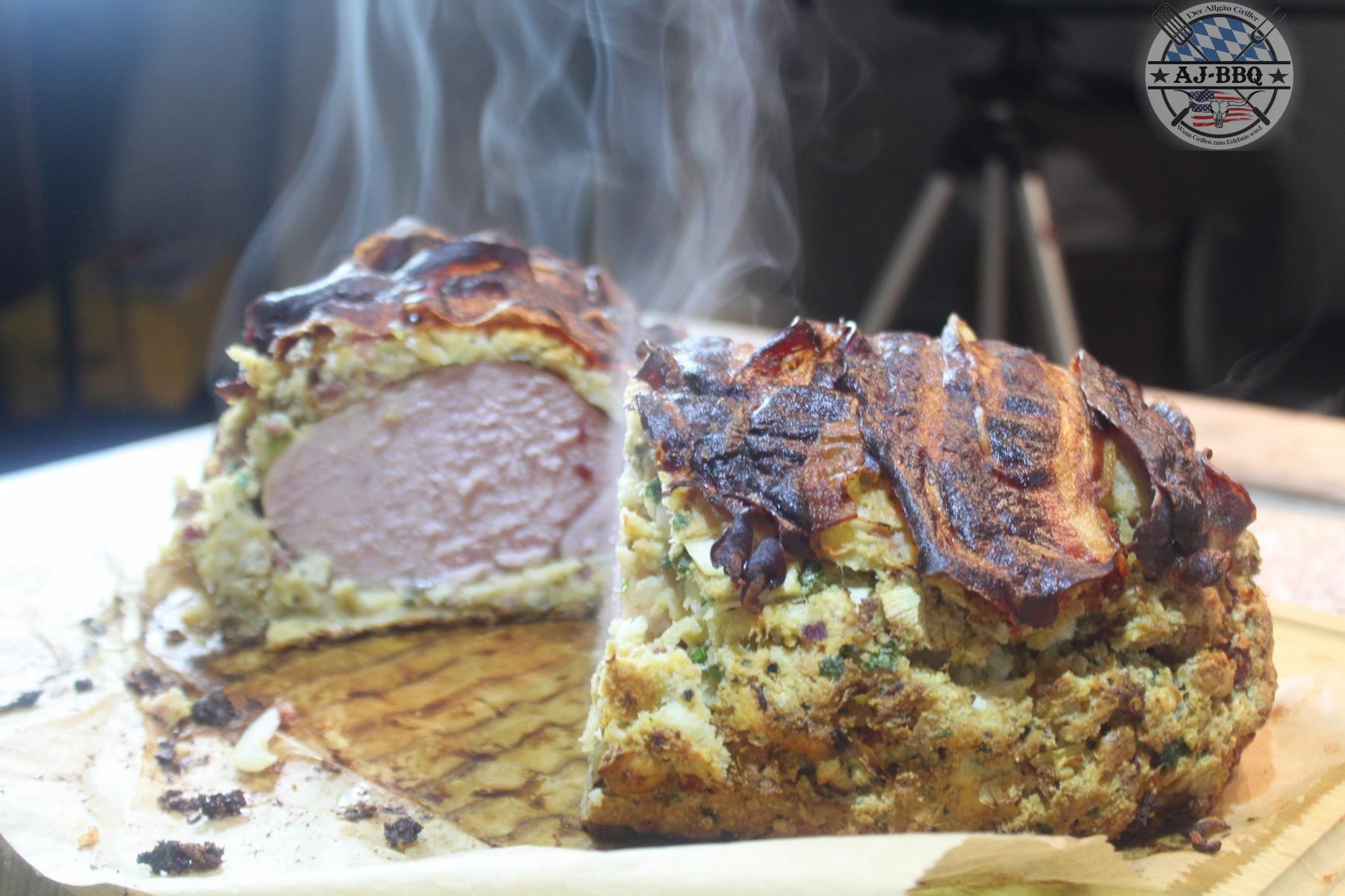 - Wenn der Grill dann stabil bei 160°C steht gebe ich das Kasseler samt dem Backpapier in den indirekten Bereich und grille es für etwa 2 Stunden. In dieser Zeit verlieren das Kasseler und der Bacon natürlich Fett welches von dem Knödel aufgesaugt wird. Dadurch entsteht ein phantastisches Aroma.
