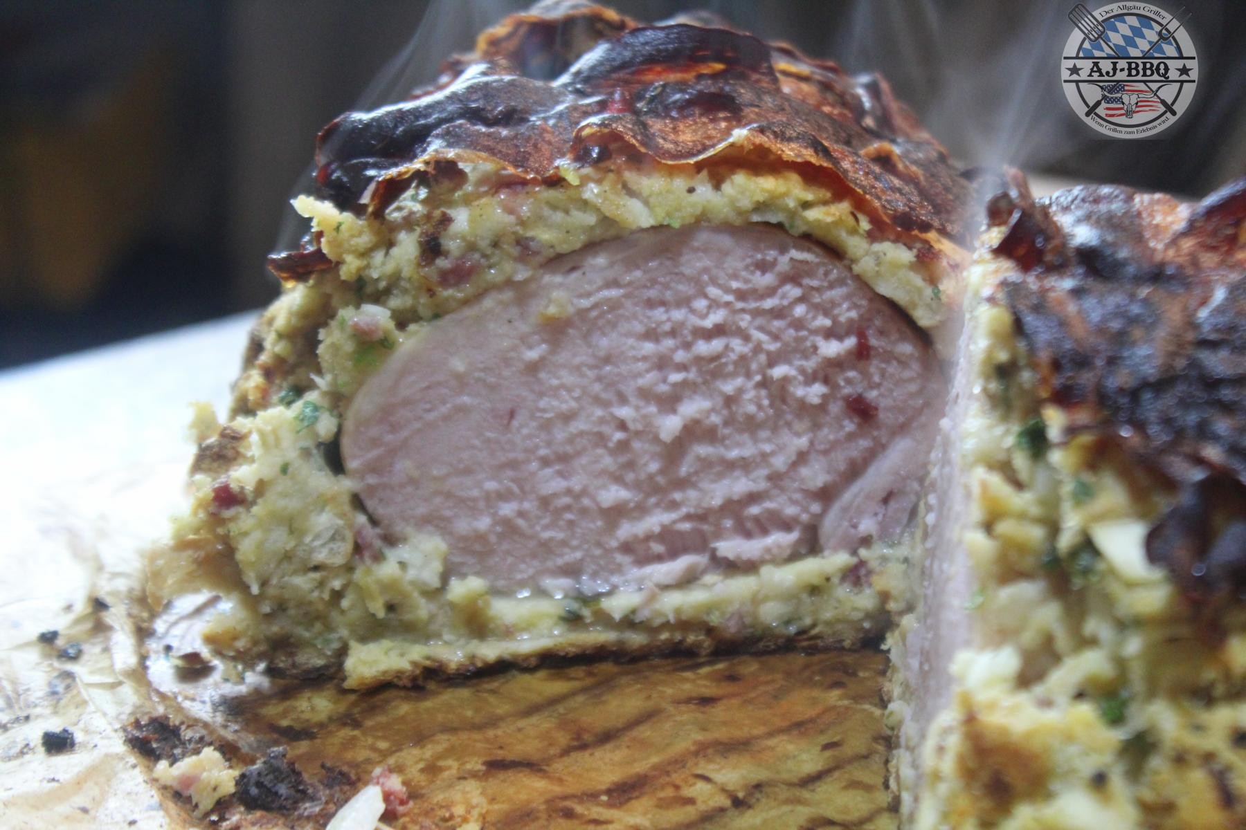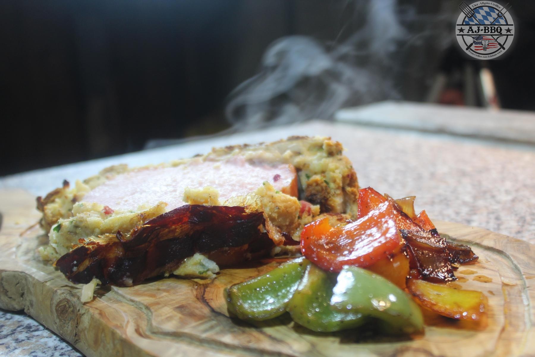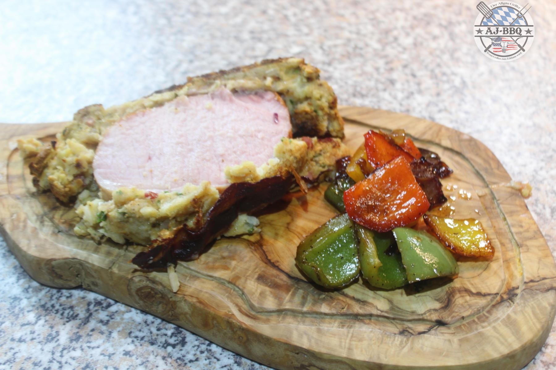 Wenn der Grill dann stabil bei 160°C steht gebe ich das Kasseler samt dem Backpapier in den indirekten Bereich und grille es für etwa 2 Stunden. In dieser Zeit verlieren das Kasseler und der Bacon natürlich Fett welches von dem Knödel aufgesaugt wird. Dadurch entsteht ein phantastisches Aroma.