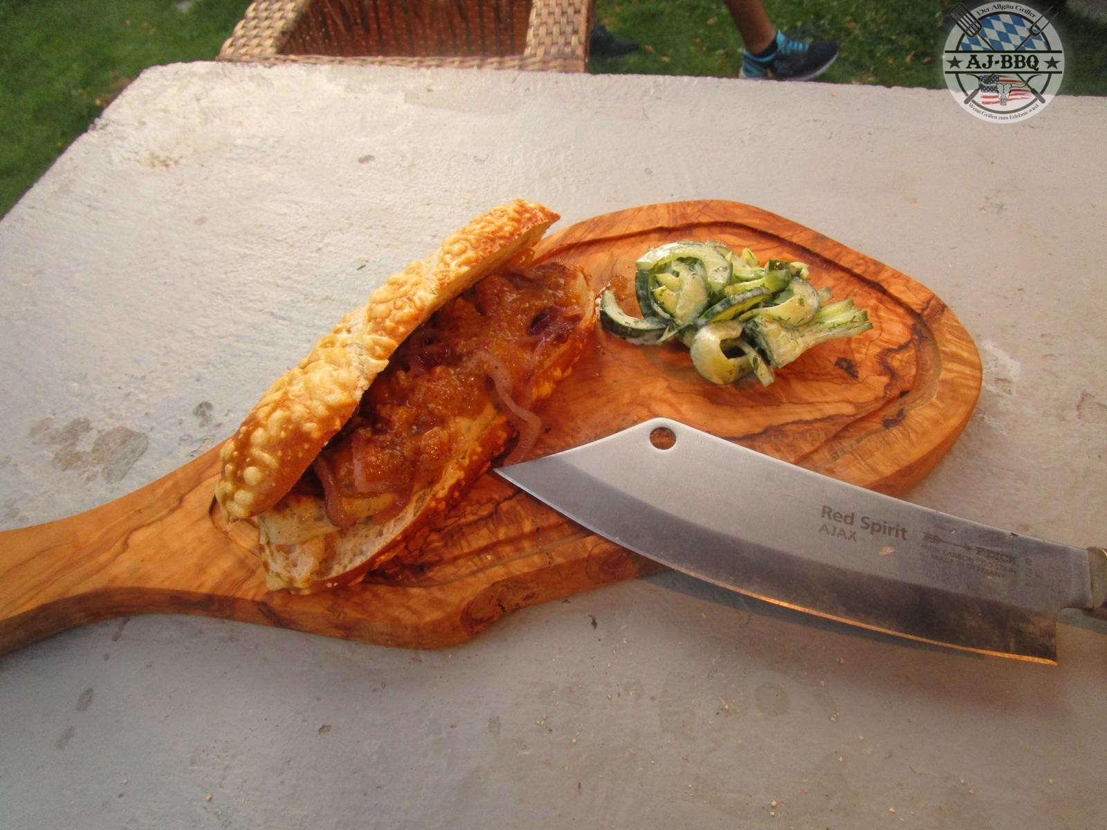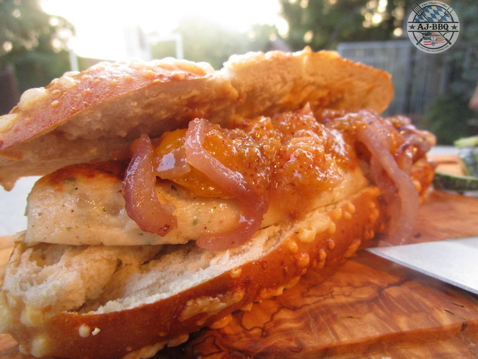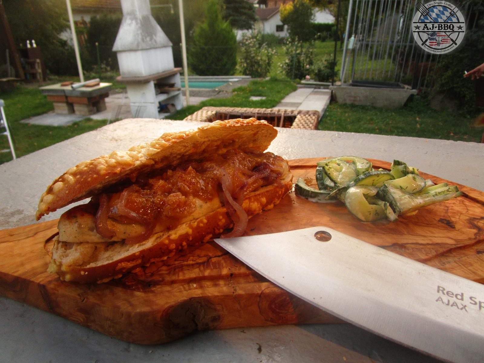 - Nun kann man den HotDog zusammenbauen. Dafür werden 2 Weißwursthälften auf den Laugenspitz gelegt, darauf verteilt man etwas Chutney, darüber die Zwiebeln und zuletzt gibt man die Sauce darauf. So einfach ist ein richtig leckerer und vor allem ausgefallener HotDog entstanden. Diesen serviert man dann mit dem feinen Gurkensalat.