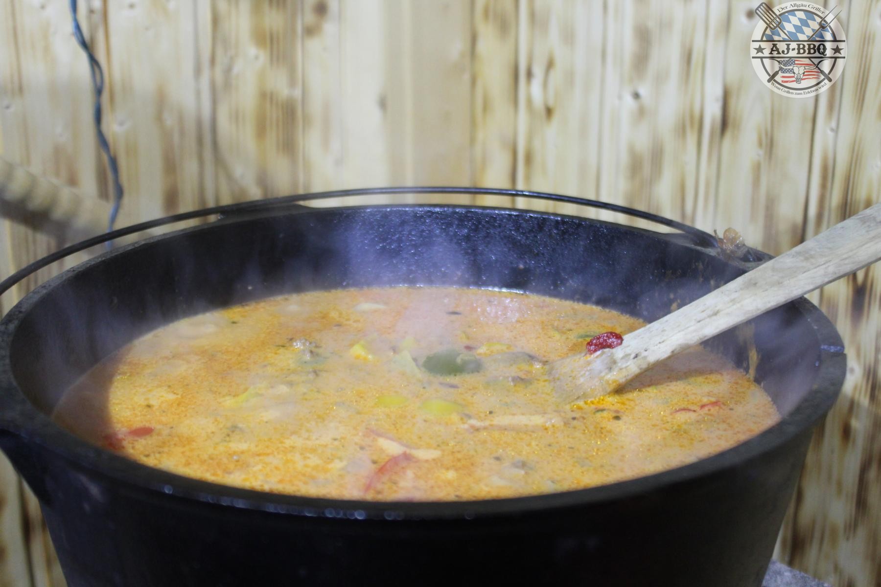 - Ist nun auch die Zwiebel weich, kommt schon die erste Flüssigkeit, die passierten Tomaten in den Dutch Oven. Außerdem gebe ich die Paprikastücke, Wasser und die Pilze noch dazu und verrühre alles sorgfältig. Auch die restlichen Zutaten gesellen sich jetzt in den Dopf und werden gekocht. Sobald die Paprikastücke weich sind wäre unsere Partysuppe jetzt schon fertig, aber es verhält sich hier, wie bei einem guten Gulasch. Je länger alles kocht, desto besser wird es schmecken. Deshalb ist dieses Partyrezept so toll. Es kann wunderbar vorbereitet werden und gart dann später von ganz allein.