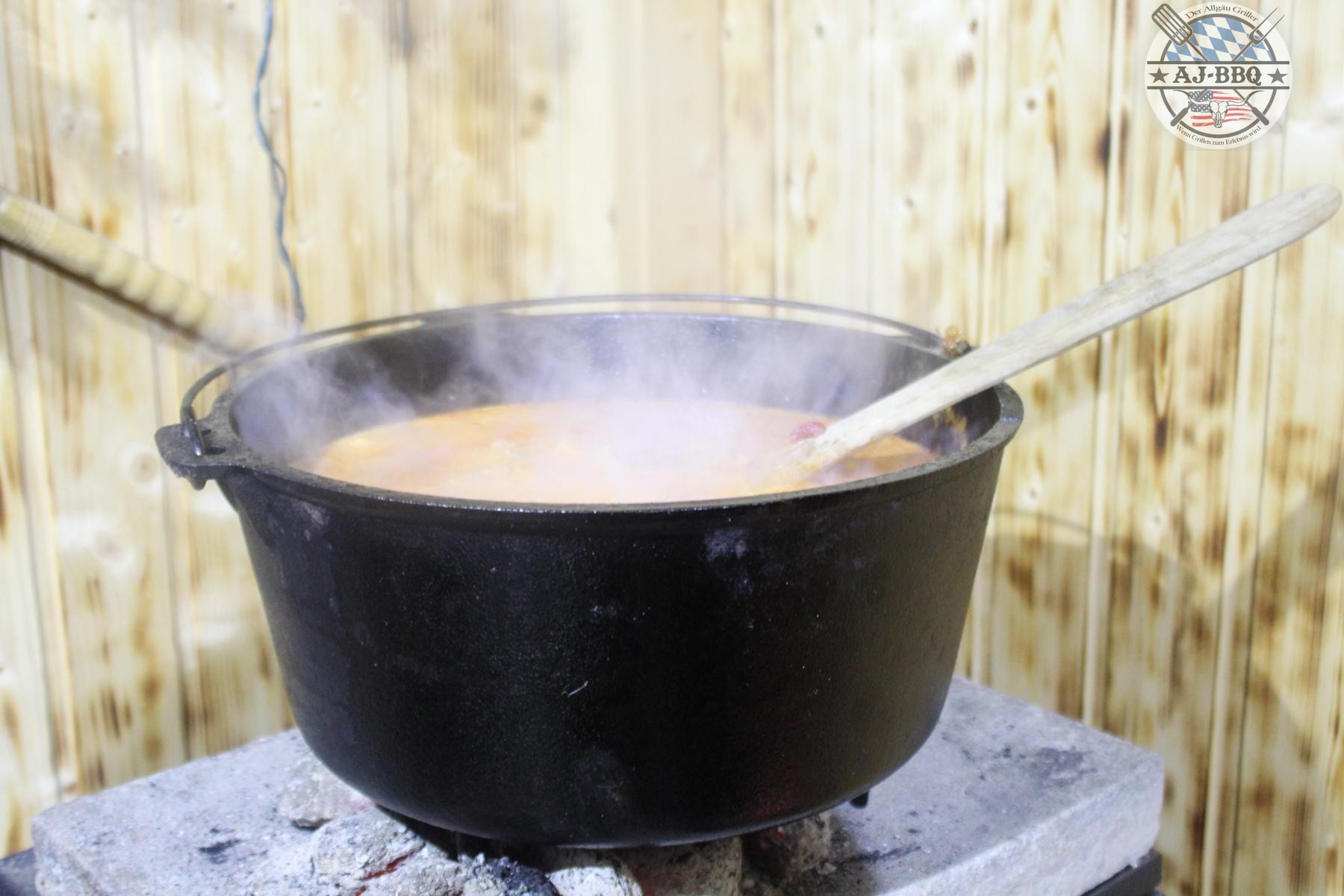 Der Dutch Oven sollte jetzt nur noch schnell vom Anzündkamin runter, da sonst alles anbrennen würde. Ich stelle meinen mit geschlossenem Deckel auf etwa 12 – 16 noch glühende Briketts und lasse es so vor sich hin blubbern.