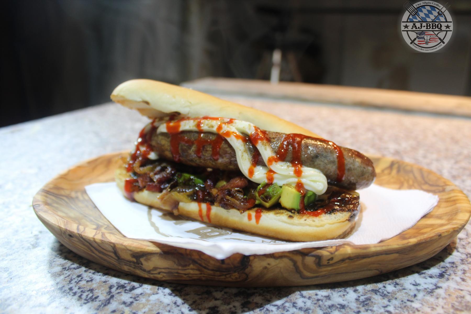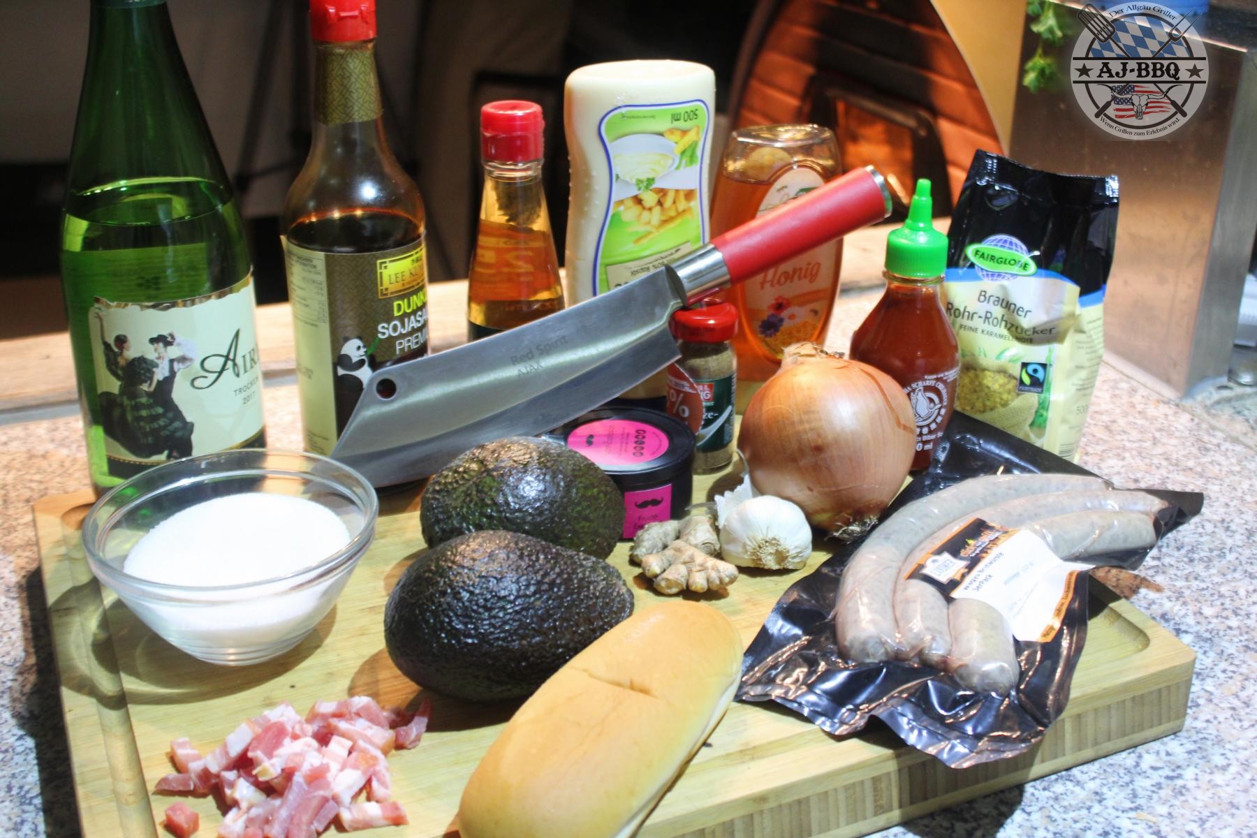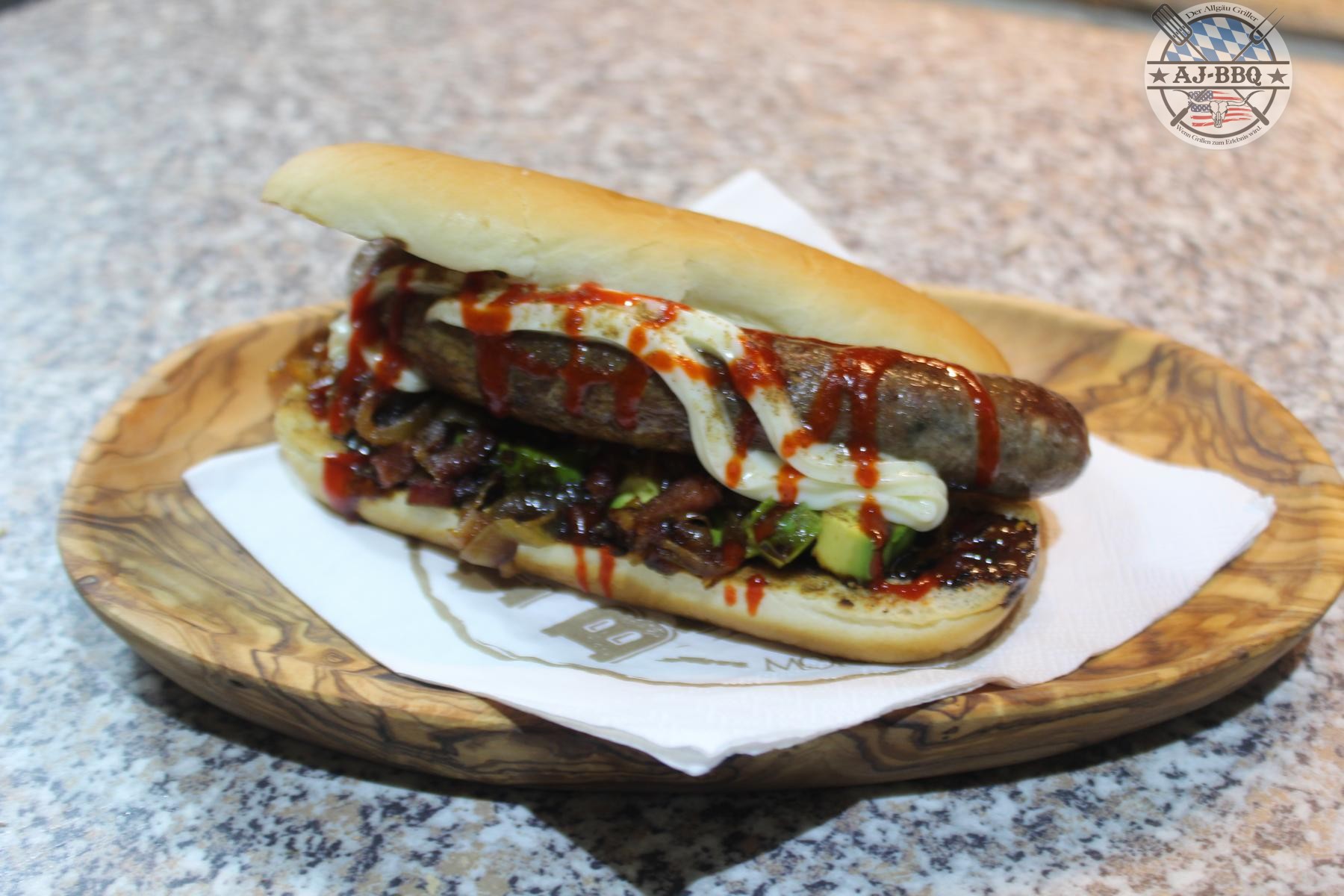 - Was jetzt noch bleibt, ist natürlich die Wurst. Diese grille ich mir ganz einfach über der direkten Hitze scharf und ringsherum an, lege sie in den indirekten Bereich bis sie fertig ist und schon können wir den Hot Dog bauen. Dafür röste ich die Brötchenhälften auch noch kurz über der direkten Hitze an, bestreiche den Boden mit der Sauce, gebe die Avocado darauf, belege alles mit den Zwiebeln, lege die Bratwurst ins Brötchen und bespritze dann noch alles mit einer Portion Mayonnaise, etwas Sriracha Sauce und würze noch mit der Furikake Gewürzmischung. Ich weiß, dass klingt alles sehr aufwändig, aber glaubt mir, dass ist es nicht und es lohnt sich absolut.