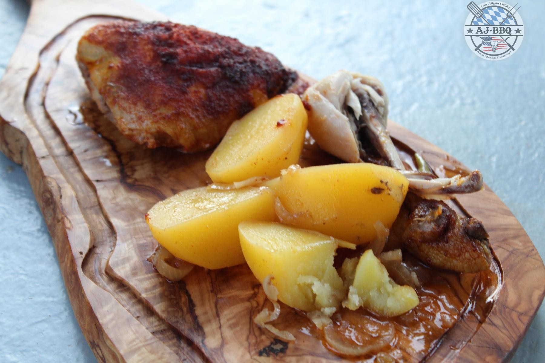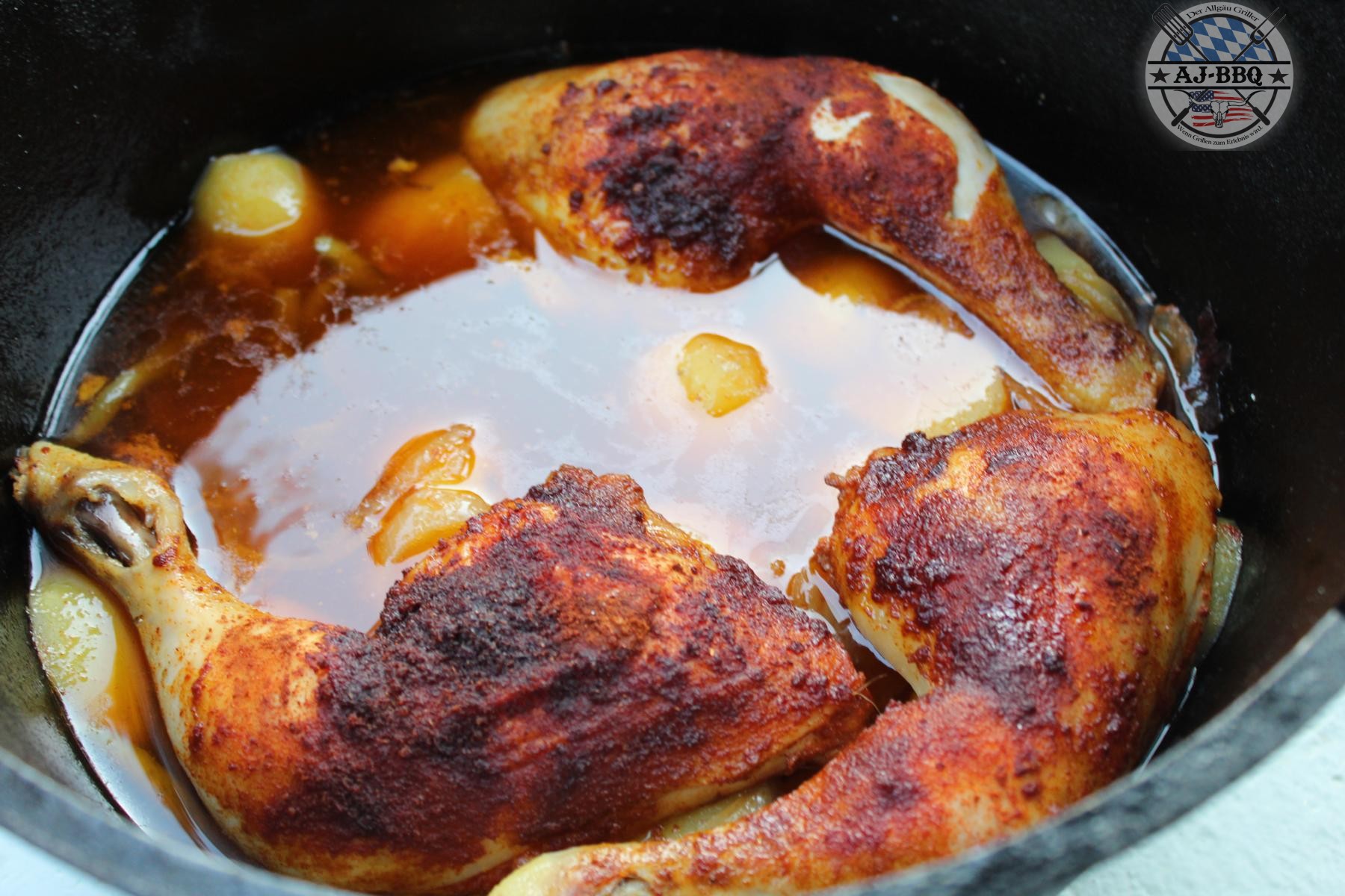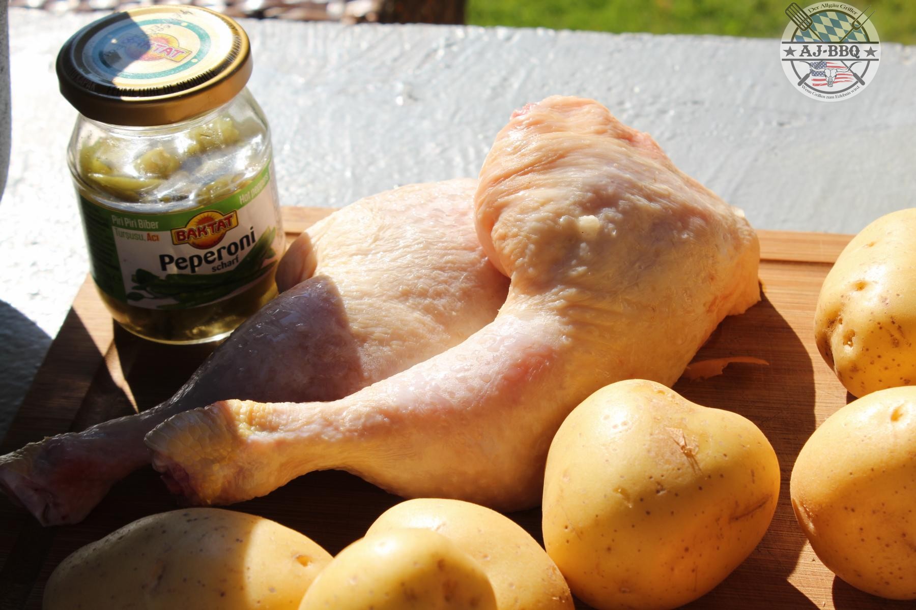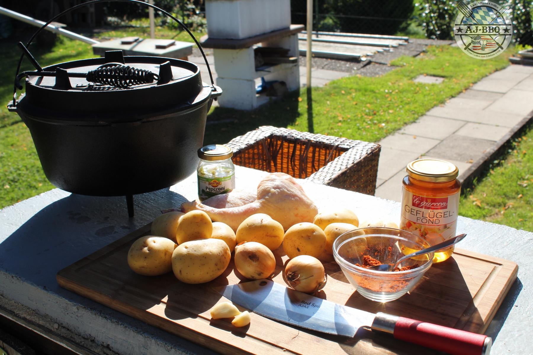 - Jetzt kann ich schon anfangen, im Dutch Oven die Zutaten zu stapeln. Auf den Boden meines DO’s verteile ich gleichmäßig die Kartoffeln, schütte den Geflügelfond in den DO, streue nun die Zwiebelringe und die Knoblauchscheiben darüber, lege die Hähnchenschlegel darauf und verteile darüber noch die Peperonis.