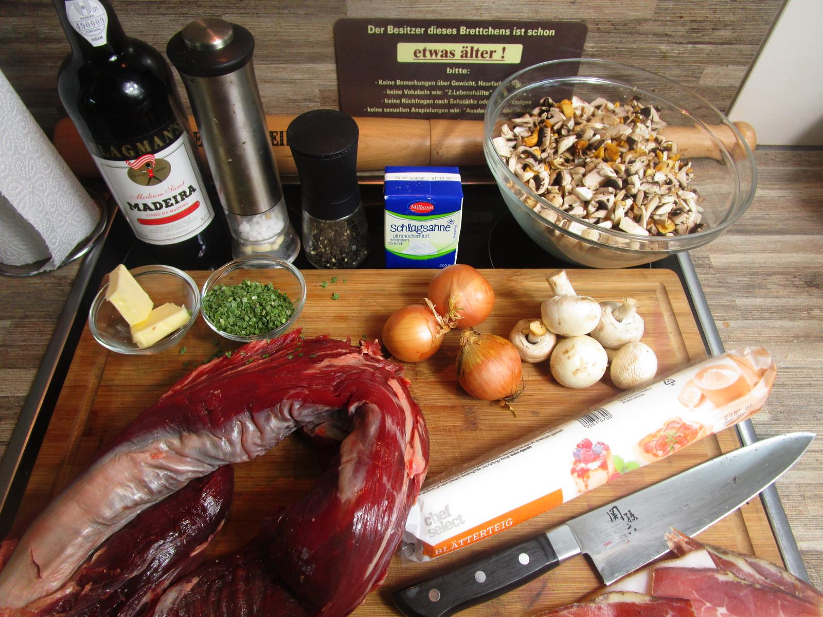 - Über dieser direkten Zone erhitze ich nun meine Gußeisenpfanne und in ihr dann die Butter. Hier werde ich jetzt die Zwiebeln und die Pilze weich dünsten. Nach ein paar Minuten wird dann alles mit dem Madeira und der Sahne abgelöscht. Die Flüssigkeit wird nun komplett eingekocht, bis sie verschwunden ist. Dadurch haben wir den Geschmack der Flüssigkeit in der Füllung und sie ist nicht zu Flüssig für den Teig. Jetzt wird nur noch mit Salz und Pfeffer gewürzt und fertig ist die Füllung.