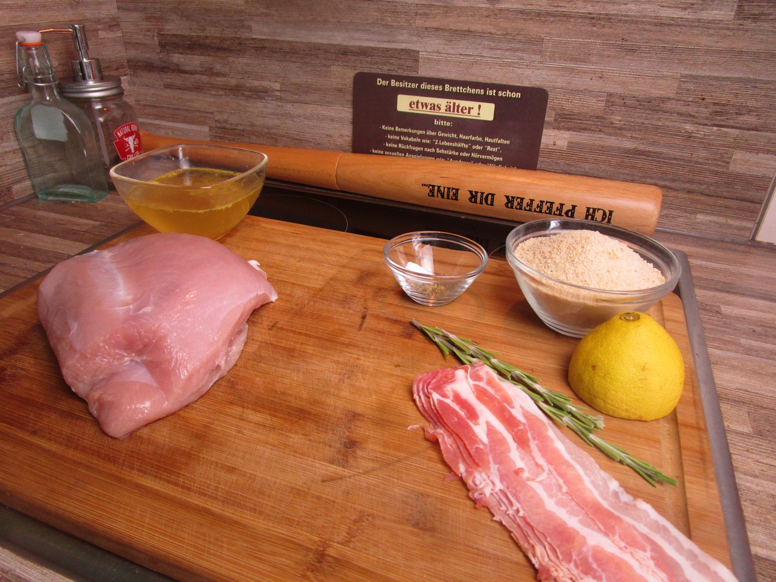 - Wenn die Füllung aufgetragen ist, rolle ich das Fleisch eng zusammen, umwickle es mit den Baconscheiben (ähnlich einem Baconnetz) und binde alles mit Küchengarn fest. Die Putenbrust ist dann bereit für den Grill.