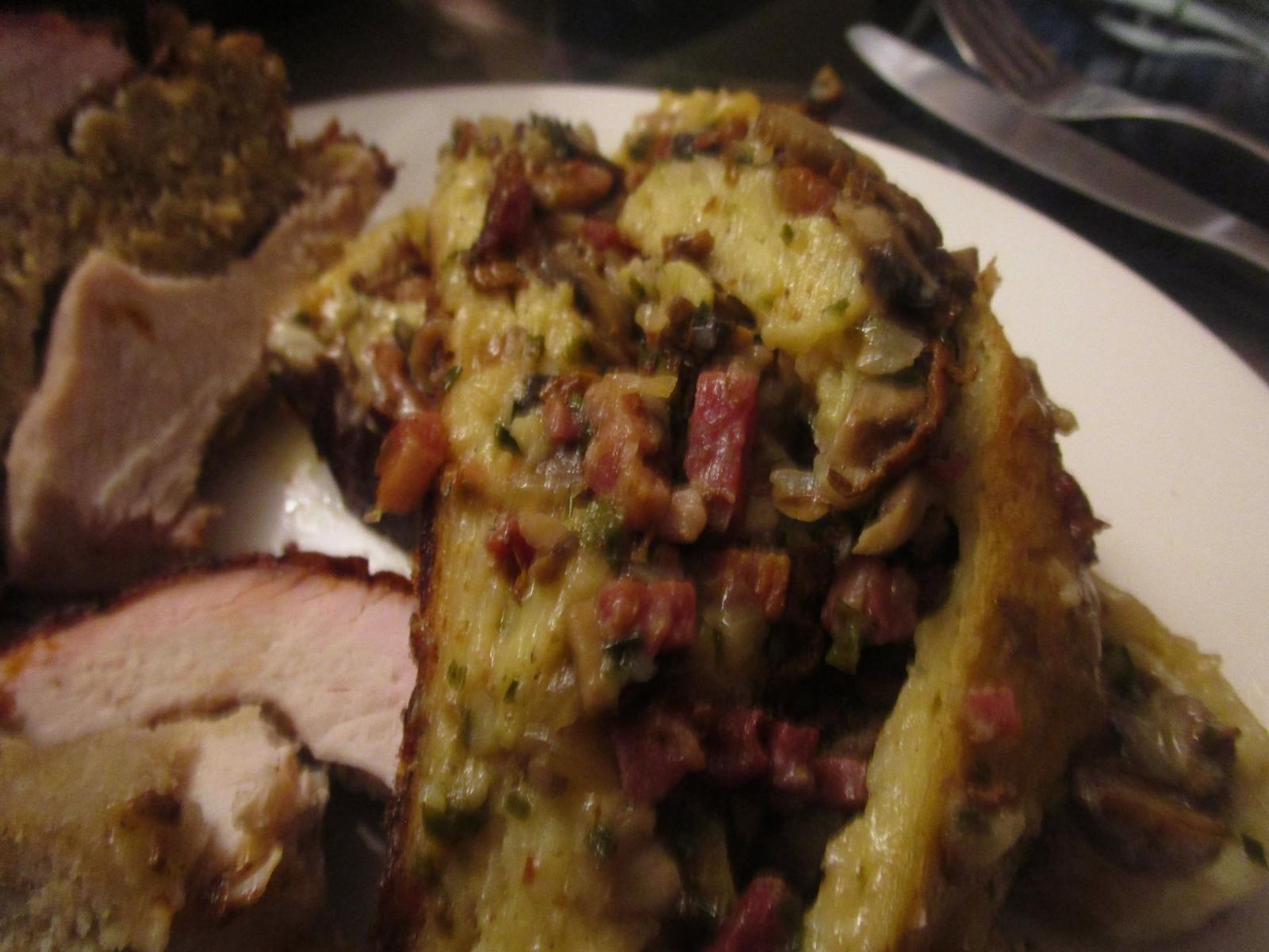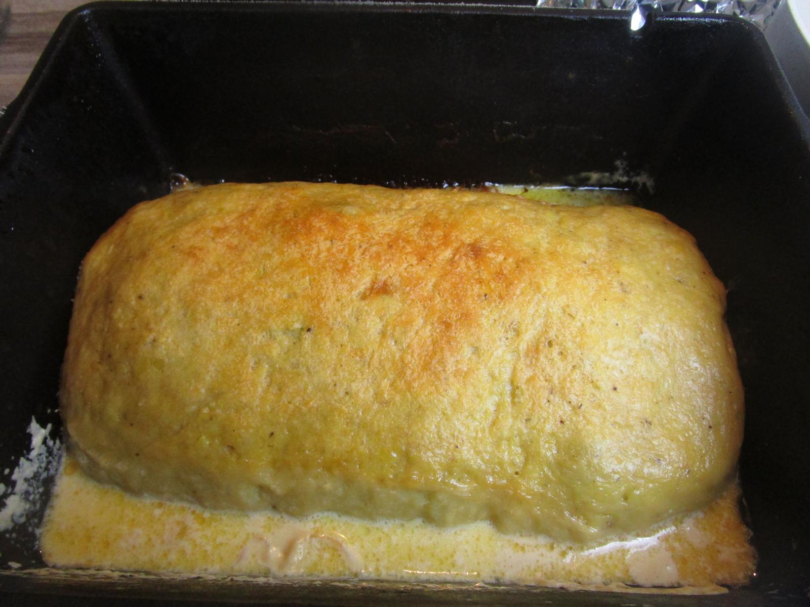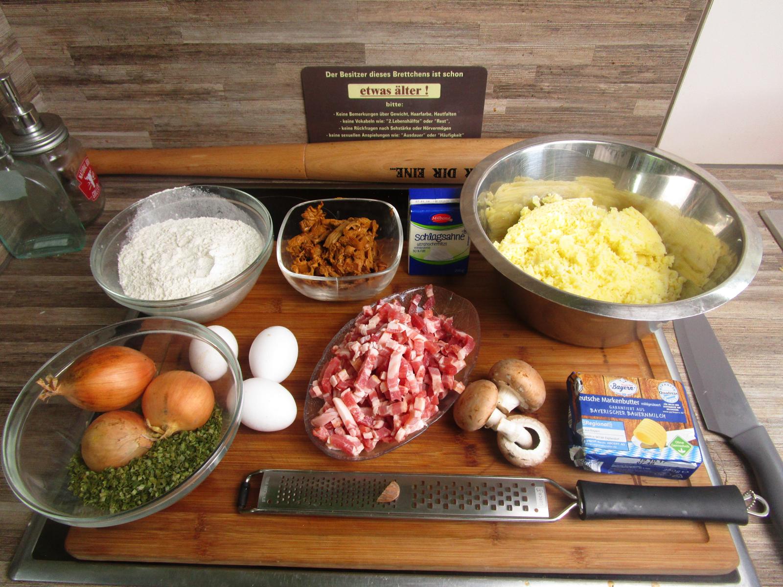 - Für den Teig würze ich nun das Kartoffelpüree vom Vortag mit Salz, Pfeffer und Muskat. Dann gebe ich das Mehl und die Eier dazu und knete alles, bis es einen schön geschmeidigen Teig ergibt. Diese Teig rolle ich auf einem Backpapier etwa Backblechgroß aus und gebe die Pilzmasse darauf. Auch hier achte ich wieder ganz besonders auf einen kleinen Rand, der frei bleibt. Dieser sorgt dafür, dass die Roulade später schön abschließt und nichts ausläuft. Nun rolle ich dein Teig auf, verschließe zuletzt die Enden und gebe alles in meine K8 Kastenform.
