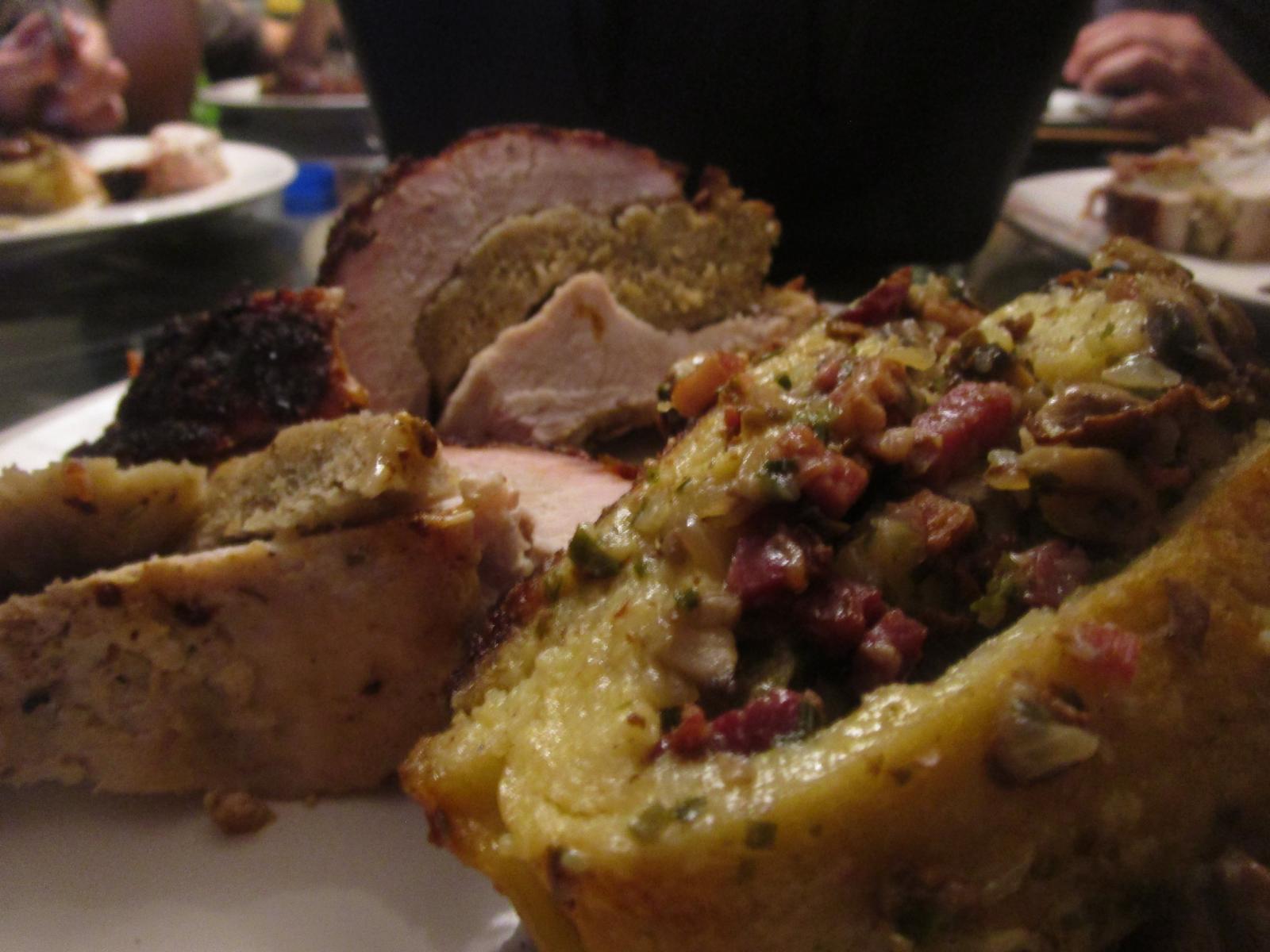 - Zuerst mache ich die Füllung für die Putenbrust. Dafür vermische ich alle Zutaten für die Putenbrust, außer den Bacon und der Pute selbst natürlich, zu einem zähen Brei. Im Anschluss wird die Pute flach mittels Schmetterlingsschnitt aufgeschnitten und ausgebreitet. Nun fülle ich die Brust mit dem hergestellten Brei und achte dabei wie immer darauf, dass die Ränder frei bleiben.