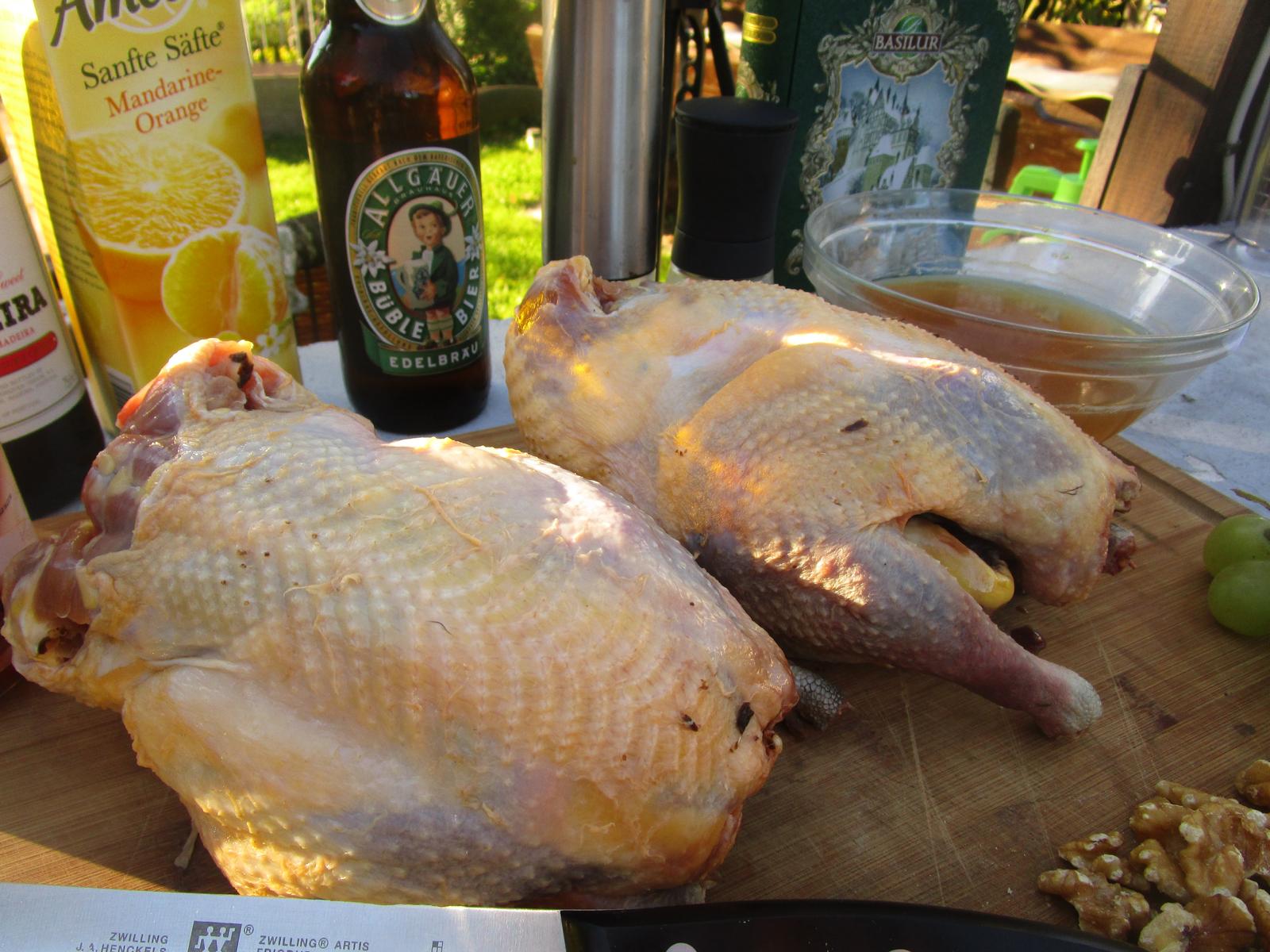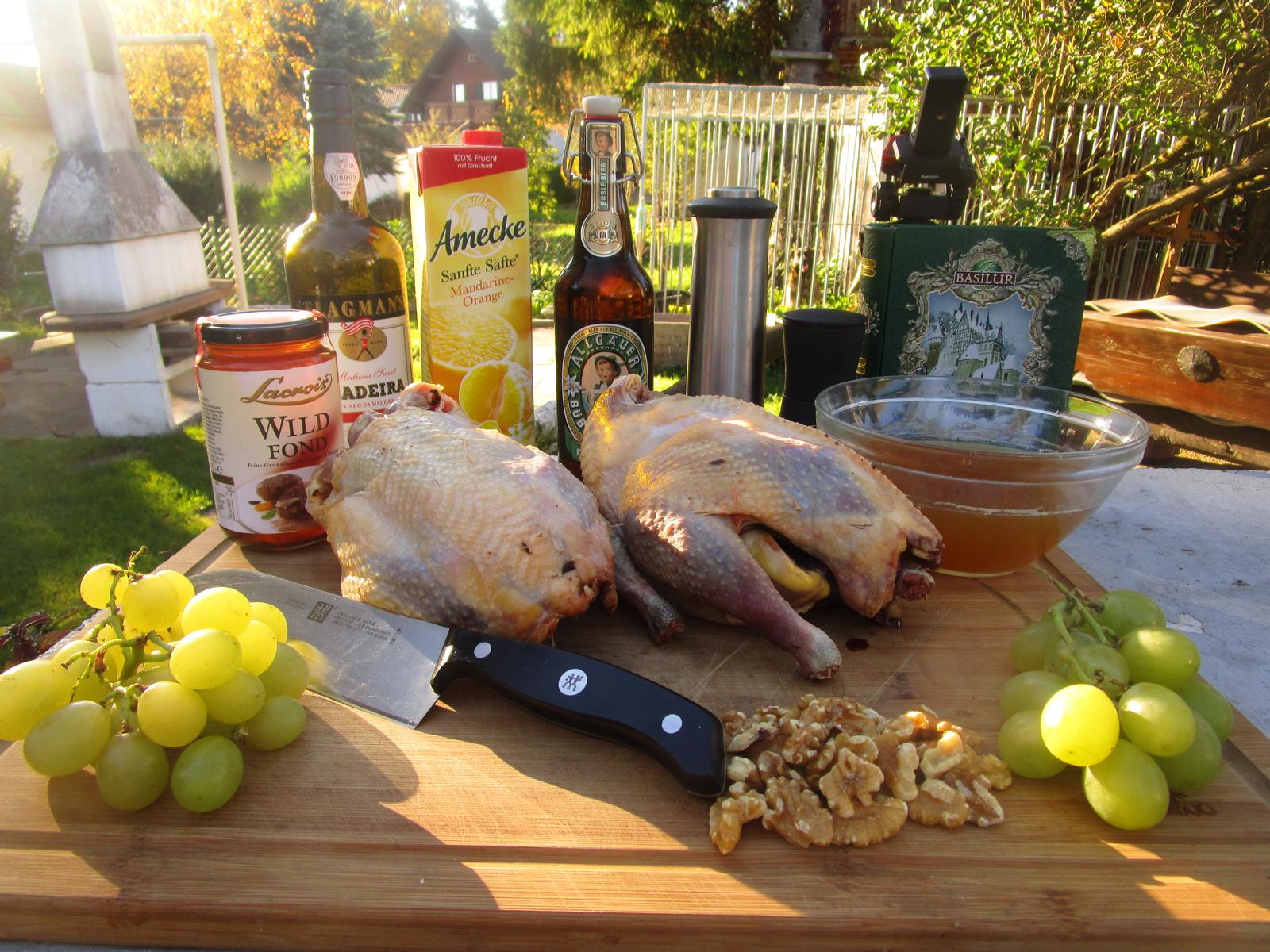 - Nun gebe ich die Vogel auf einen erhöhten Rost in einen Bräter. In diesen gebe ich nun die Flüssigkeiten, also den grünen Tee, den Wildfond, den Madeira und den Orangensaft. Das waren schon alle Vorbereitungen für unsere Wildvögel.