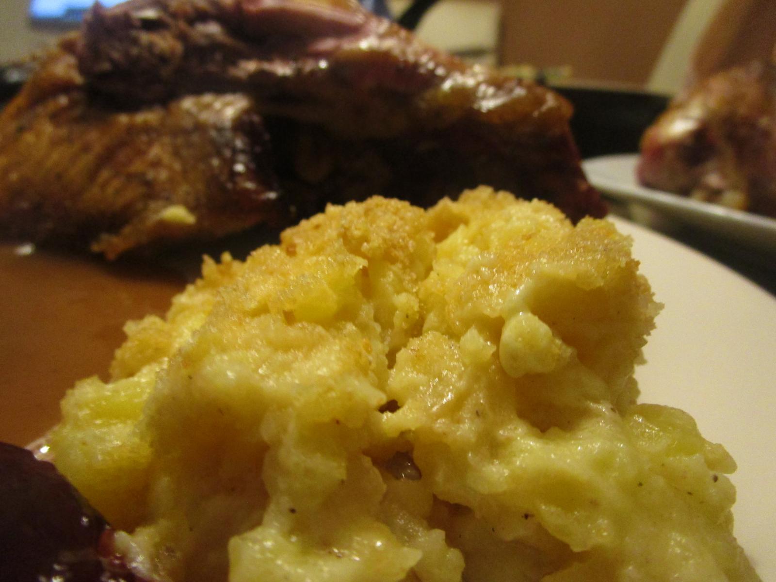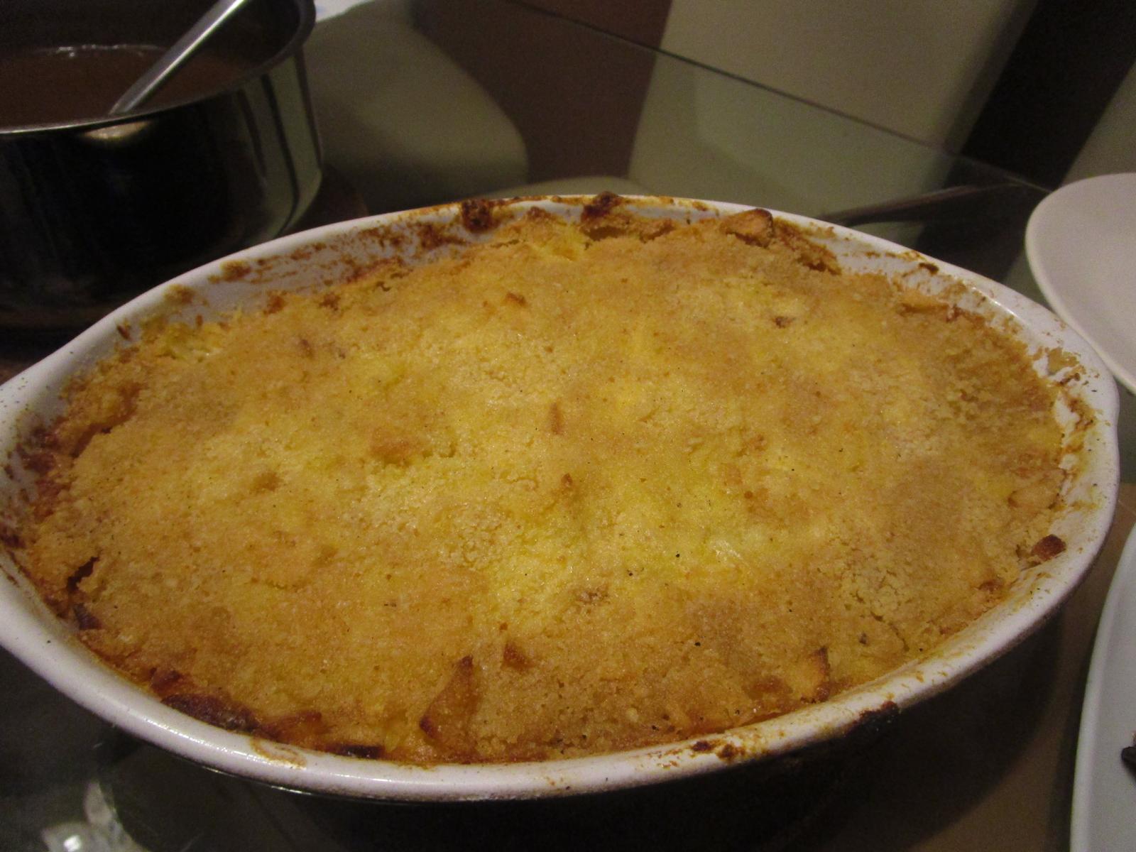 - Nun wird auf dieser Kartoffelmasse zuerst gleichmäßig die Créme double verteilt, dann die Apfelmasse. Nun wird alles nur ganz leicht untergehoben und mit dem Paniermehl bestreut. Auf diese Semmelbrösel kommen nun noch Butterflocken aus der restlichen Butter und schon kann alles zu den Fasanen in den Grill.