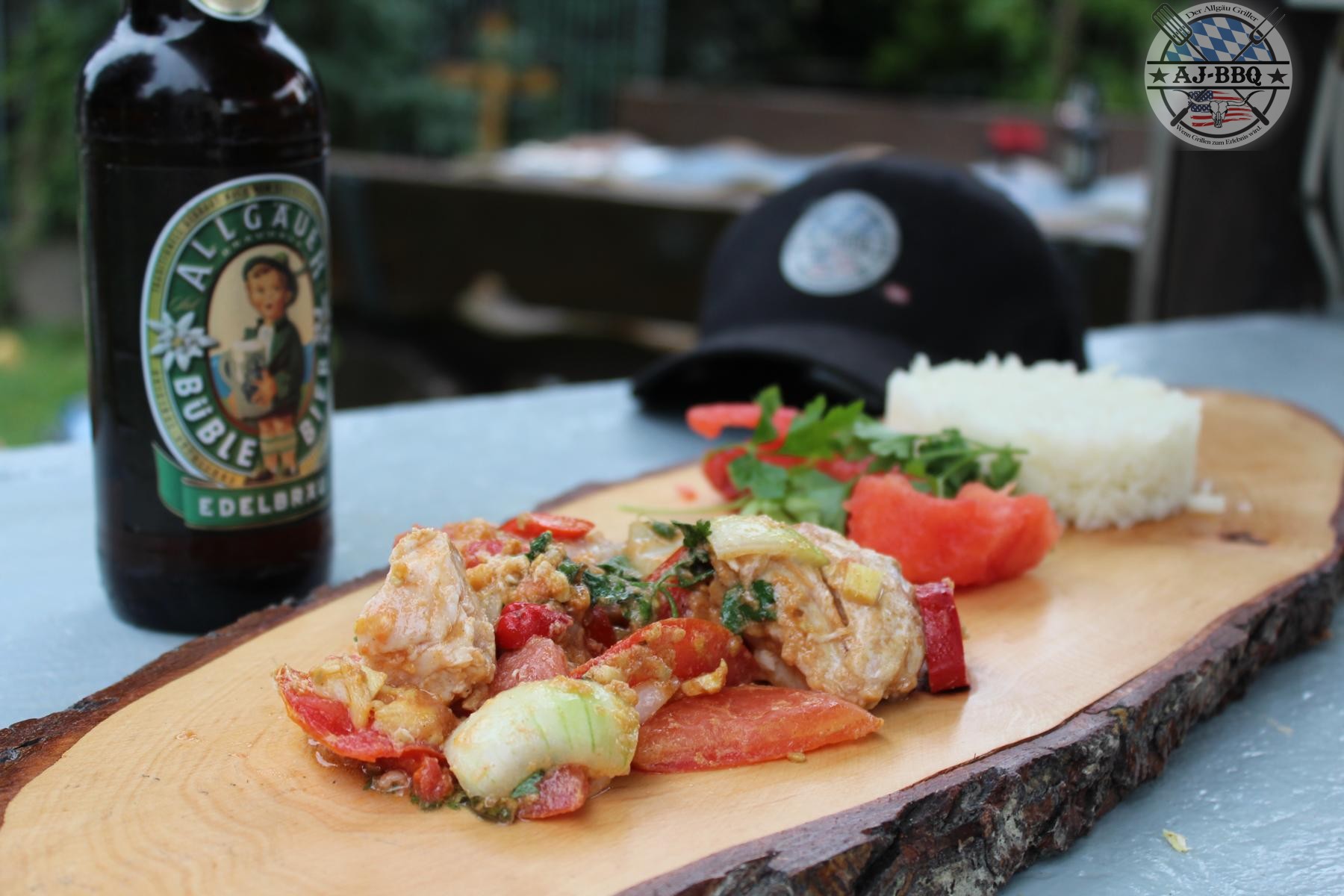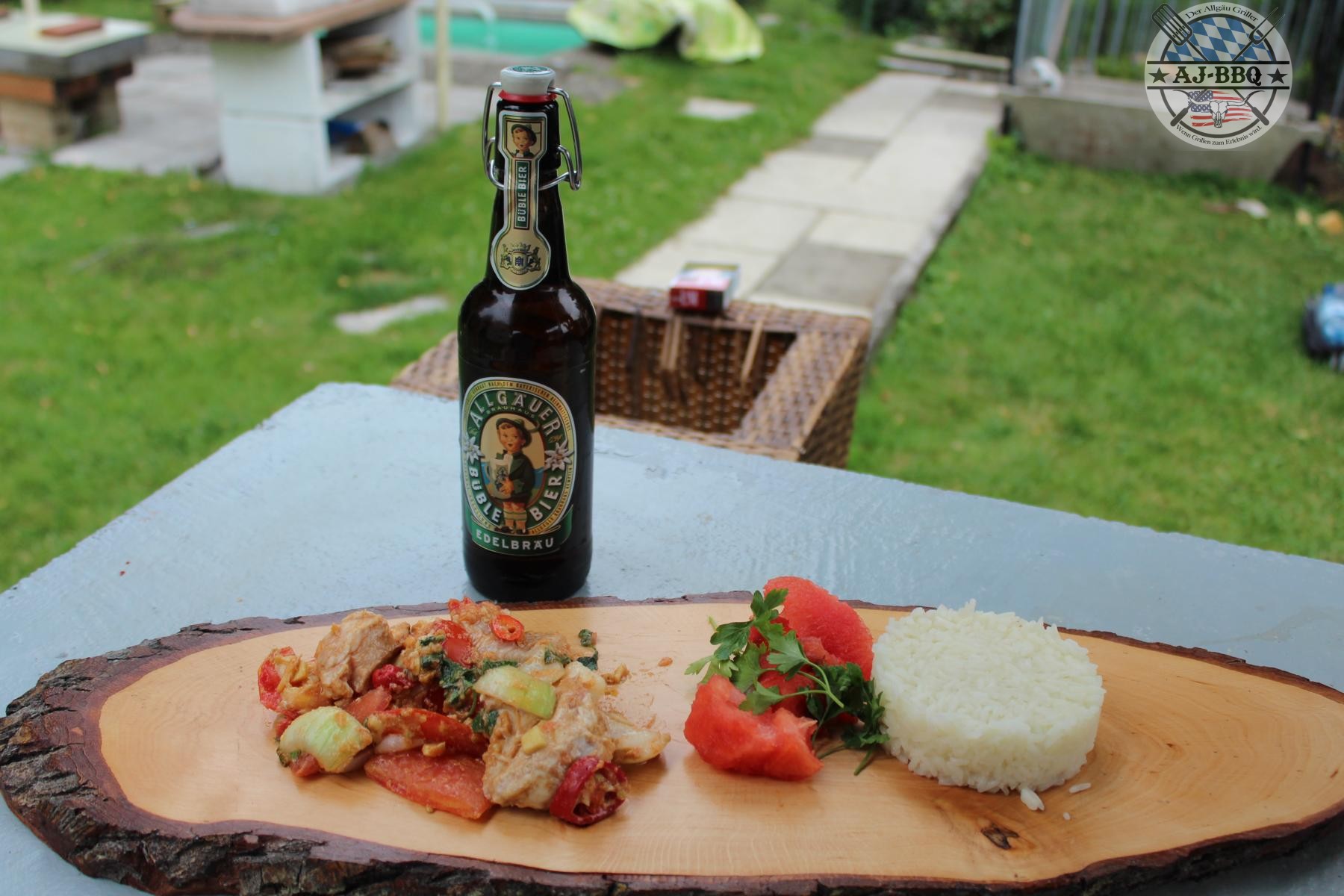 - Nach etwa 1,5 Stunden über offenem Feuer ist dann alles fertig und wird bei uns mit Reis und den restlichen Melonenstücken vom aushöhlen serviert.