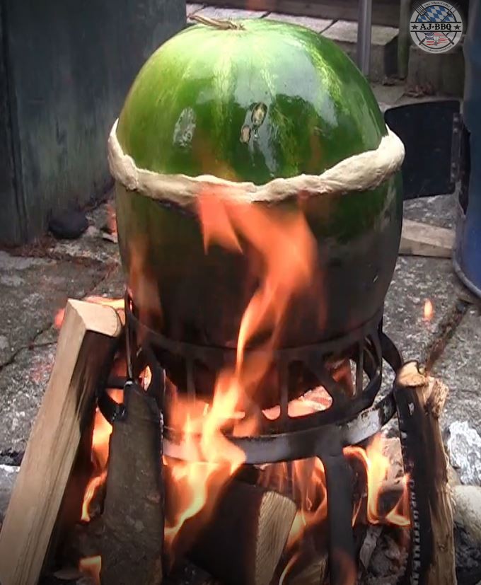 - Nun ist es soweit! Die ersten Holzscheite werden zusammengelegt und mit Hilfe meines Feuerkorbständers und des Ringes der Feuerplatte baue ich mir einen Stand für die Melone. Hierfür eignen sich auch ohne weiteres Steine oder ähnliches. Ist die Melone dann richtig platziert, wird das Feuer entzunden.