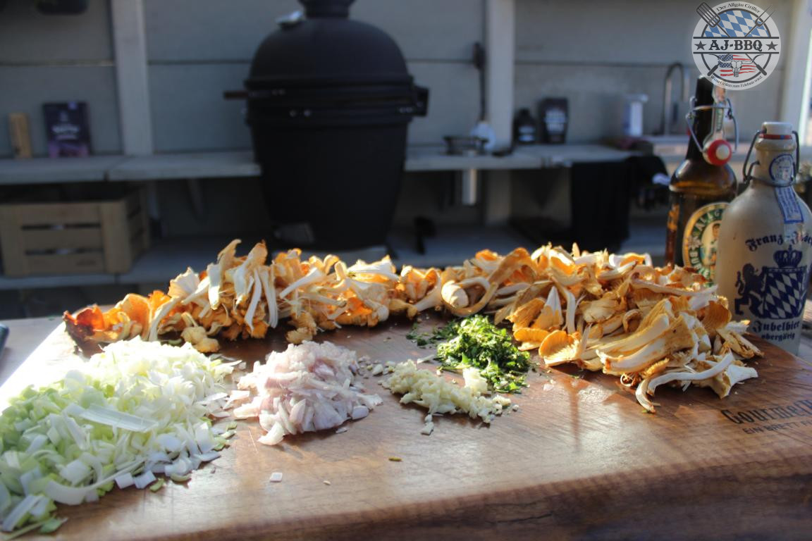 Solange das geschieht wird noch ruck zuck eine Pfifferlingspfanne gemacht. Dafür stelle ich meine Gußpfanne, die Petromax fp35, über die Flammen und dünste darin die Zwiebeln, den Knoblauch und den Lauch an. Sobald dieser weiche ist, gebe ich die Pfifferlinge dazu und brate diese ebenfalls an.