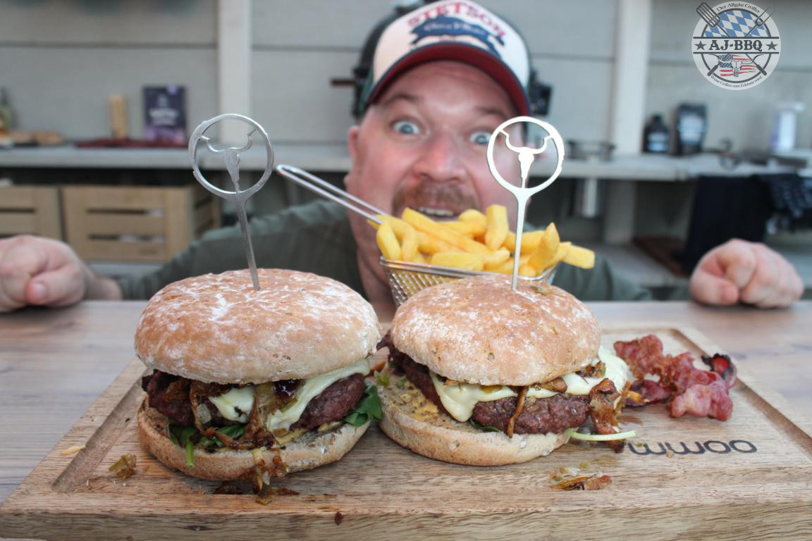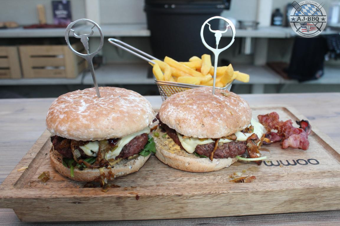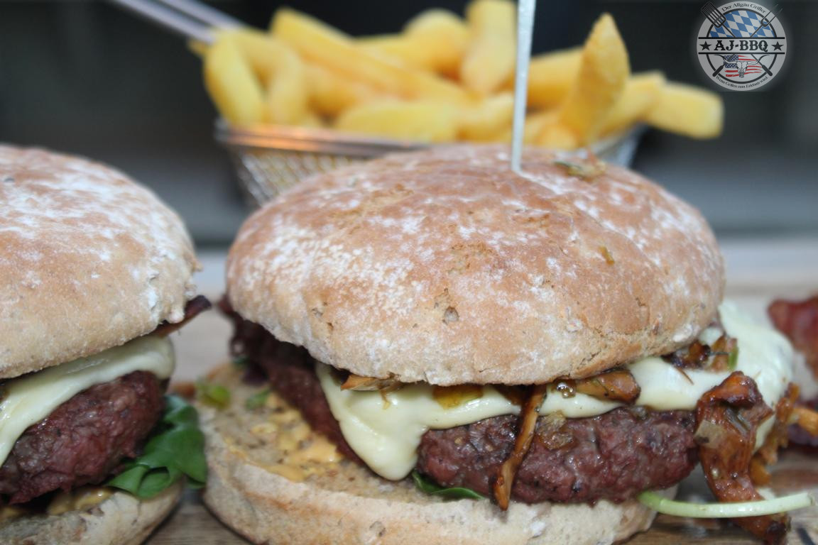 Jetzt geht alles ganz schnell. Die Pfifferlinge sollten inzwischen fertig sein und brauchen nur noch warmgehalten werden. Dann kommen die Hackfleischpattys ungefähr 3 – 4 Minuten beidseitig über die direkte Hitze, werden dann in den indirekten Bereich gezogen und mit einer Scheibe Käse belegt. Dieser kann nun schön schmelzen und über dem Fleisch verlaufen. Gleichzeitig grille ich noch kurz die Innenseiten der Burgerbrötchen an und schon ist es geschehen. Bei einer Kerntemperatur von ca. 55°C nehme ich alles vom Grill und baue den Burger zusammen.