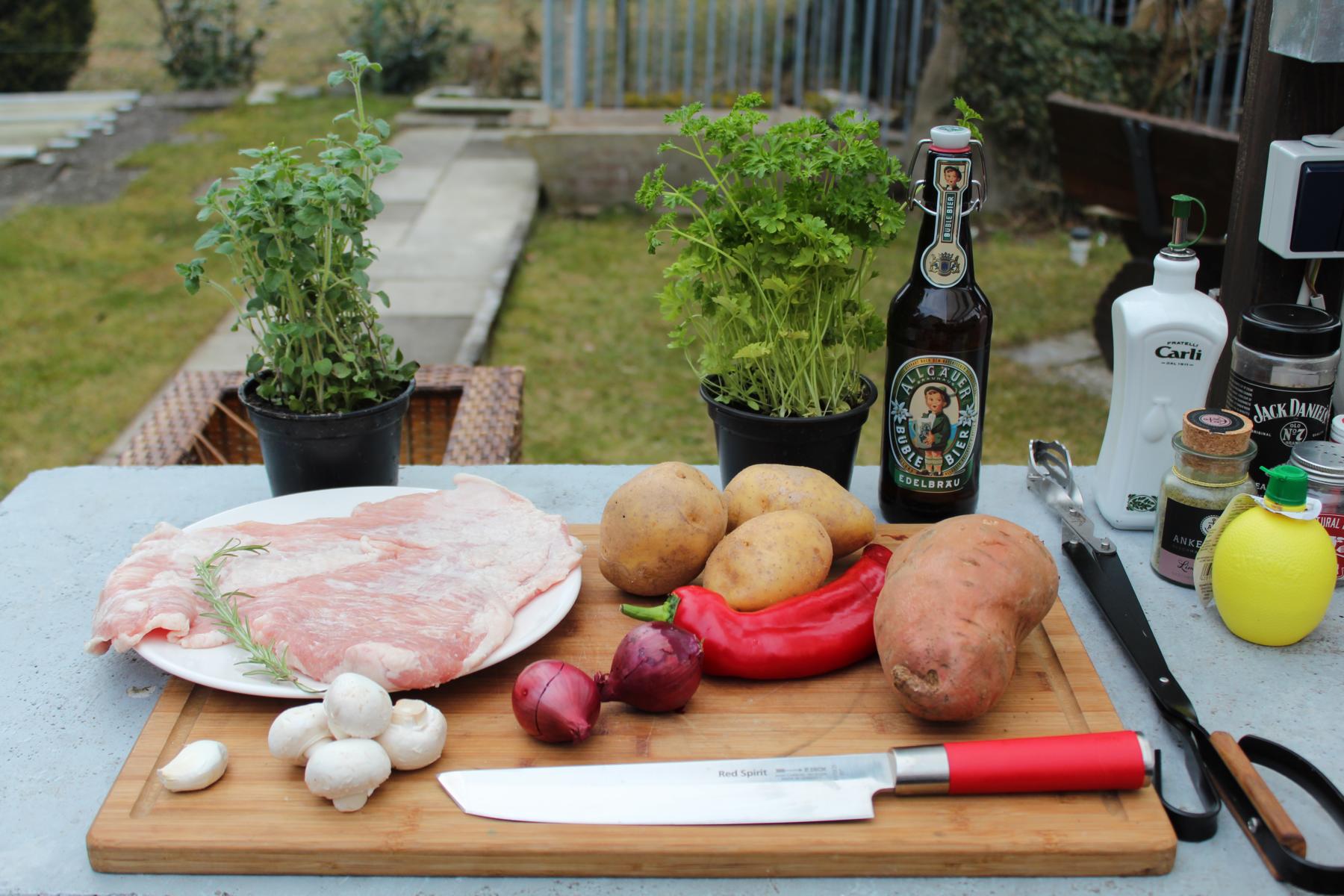 - Nun ist es an der Zeit, dass ich mich um die Pilze kümmere. Diese bleiben im ganzen un werden nur geputzt. Während ich eine weitere Zwiebel in Würfelchen hacke, lasse ich eine Pfanne über der Kohle auf dem Rost heiß werden.