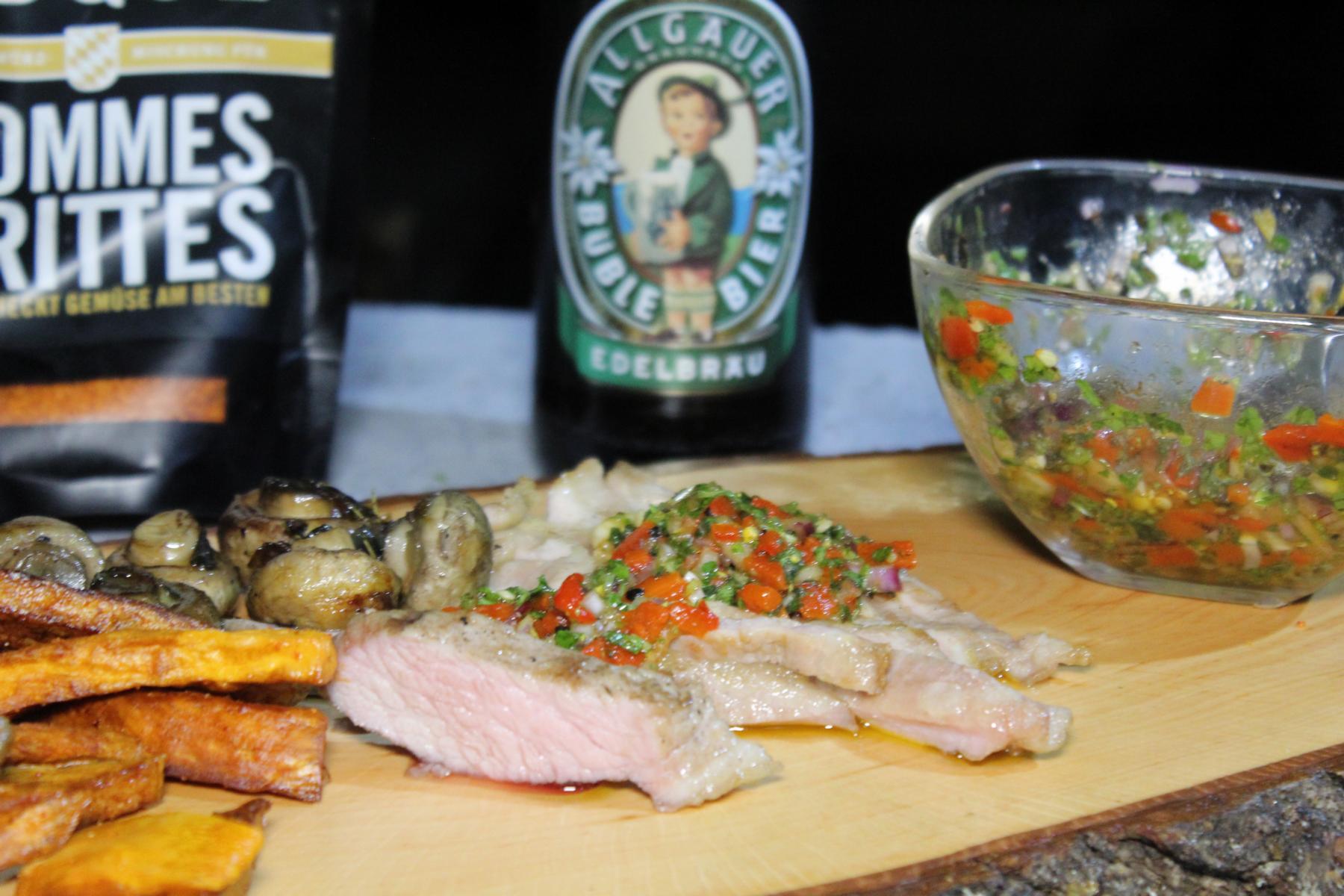 Wenn alles richtig getimet wurde, ist es gleichzeitig fertig. Nun noch das Fleisch in Tranchen schneiden, mit der Chimichurri überträufeln, die Pommes würzen und alles mit den Pilzen servieren. Viel Spaß beim Nachmachen und probieren,