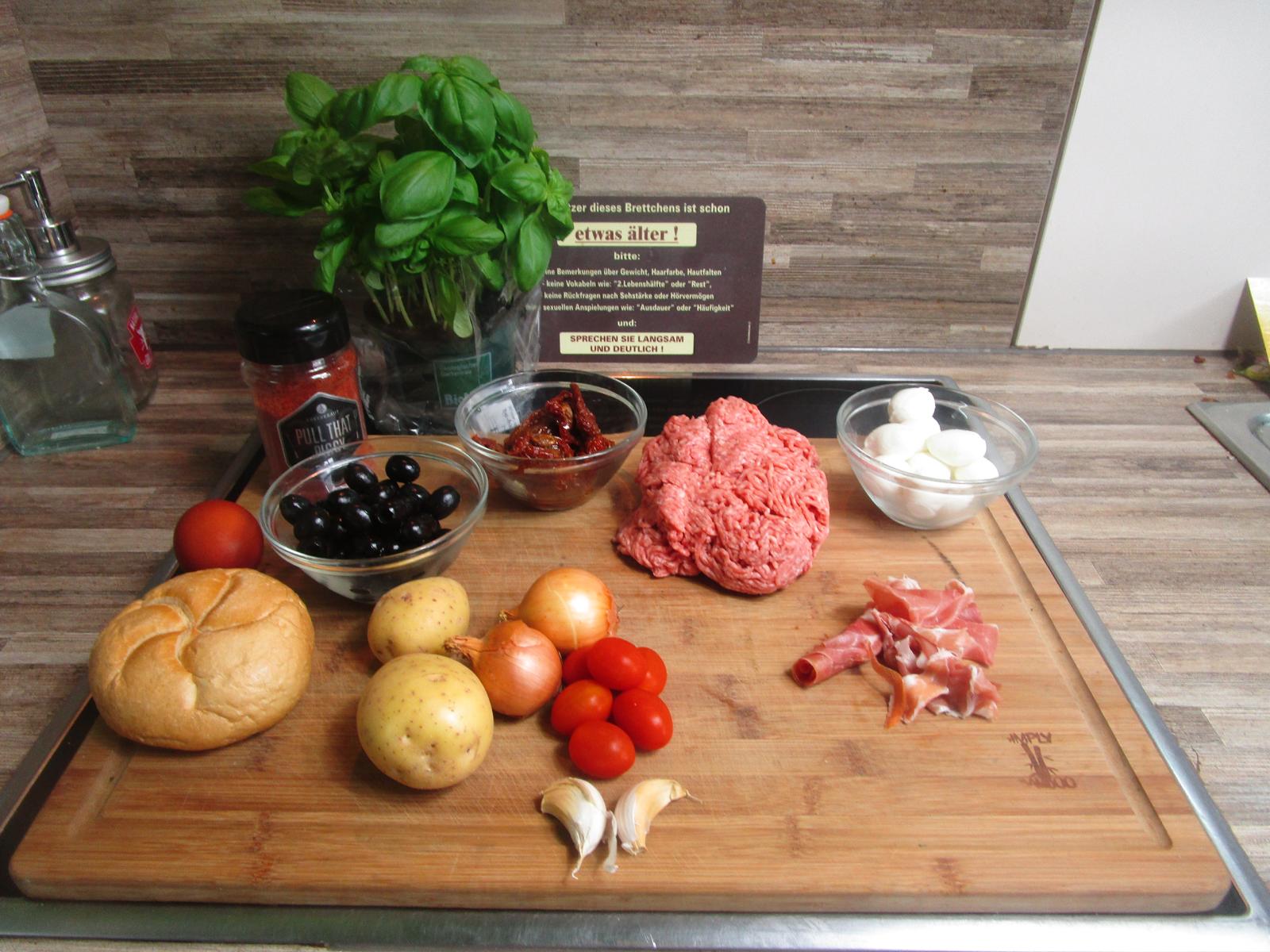 Als nächstes wird die Füllung hergestellt. Dafür Hacke ich den Knoblauch, schneide die getrockneten Tomaten in streifen und zerkleinere die Oliven und den Mozzarella. Im Anschluss wird alles in einer Schüssel miteinander vermengt.