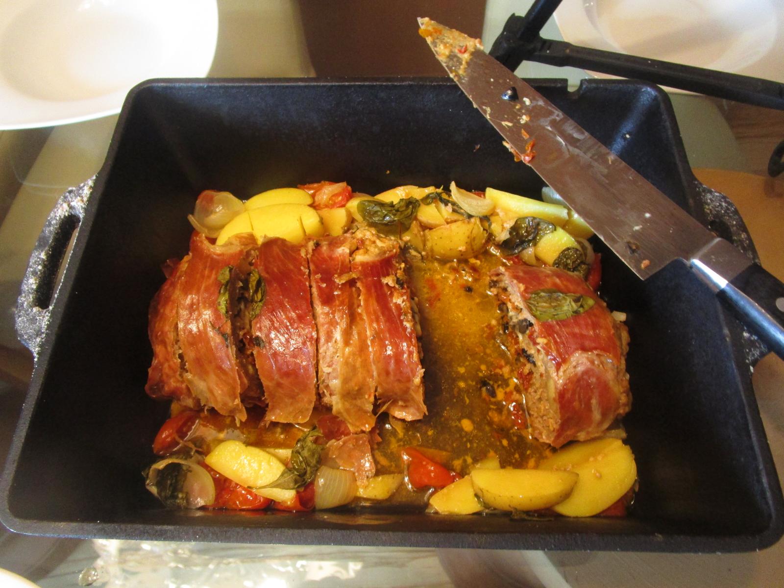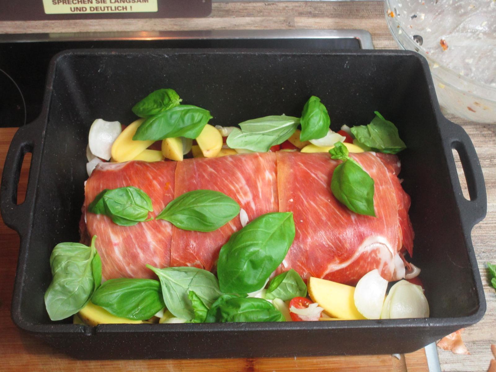 Ist jetzt alles zu einer Rolle geformt und sind die Enden verschlossen, wird der Braten noch mit Parmaschinken eingewickelt und kann somit in den Dutch Oven. Zur Sicherheit lege ich den Boden des Dutch Ovens auch noch mit Schinken aus.