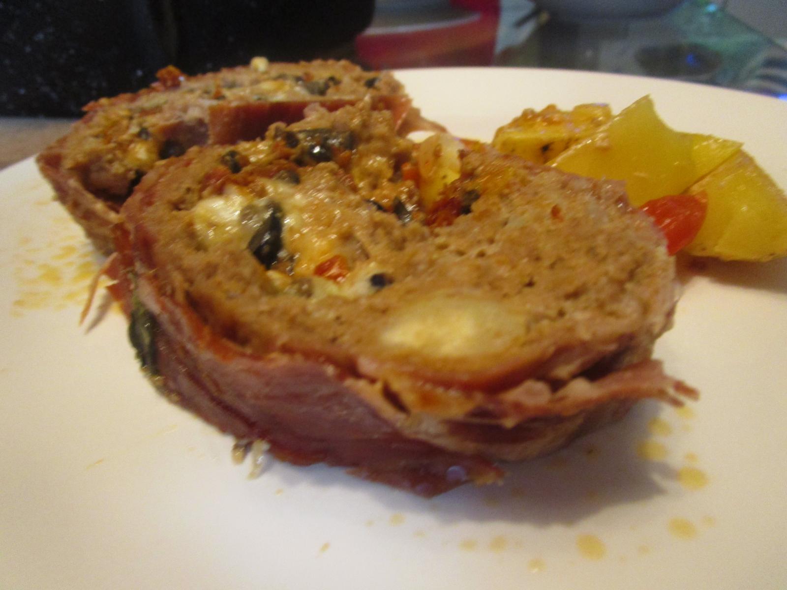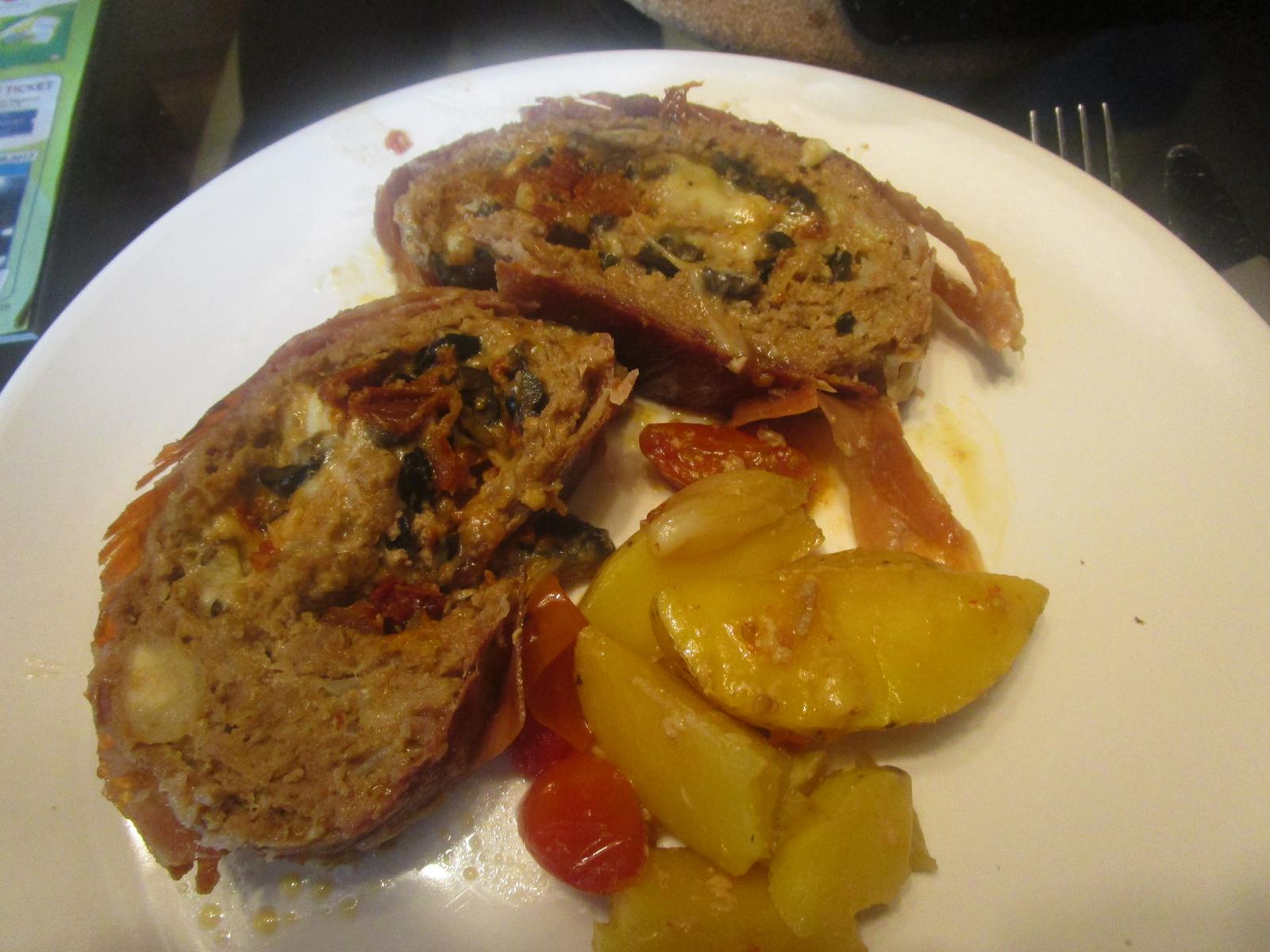 Nach dieser Stunde ist der wunderbare Hackbraten auch schon fertig. Die zugegebenen Kartoffeln, Zwiebeln und Tomaten sind eine sehr leckere Beilage für den Hackbraten.