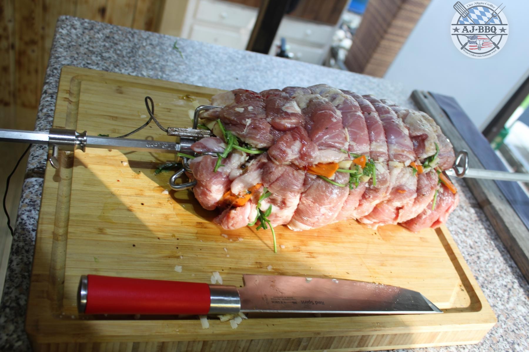 - Ich mache diesen Rollbraten dieses Mal auf der Rotisserie. Dafür stecke ich den Drehspieß mittig durch den Braten und befestige diesen mit den zwei Fleischklammern auf dem Spieß. Nun heize ich den Grill vor. Dafür glühe ich einen ganzen Anzündkamin Briketts vor, gebe diese links und rechts in den Kugelgrill und schaffe mir somit einen indirekten Bereich in der Mitte des Grills, über dem ich später den Rollbraten drehen lasse. Die Temperatur im Grill regle ich bei 180°C ein. So bleibt der Braten nun für etwa 2,5 Stunden oder bis zu einer Kerntemperatur von 60°C auf dem Grill.