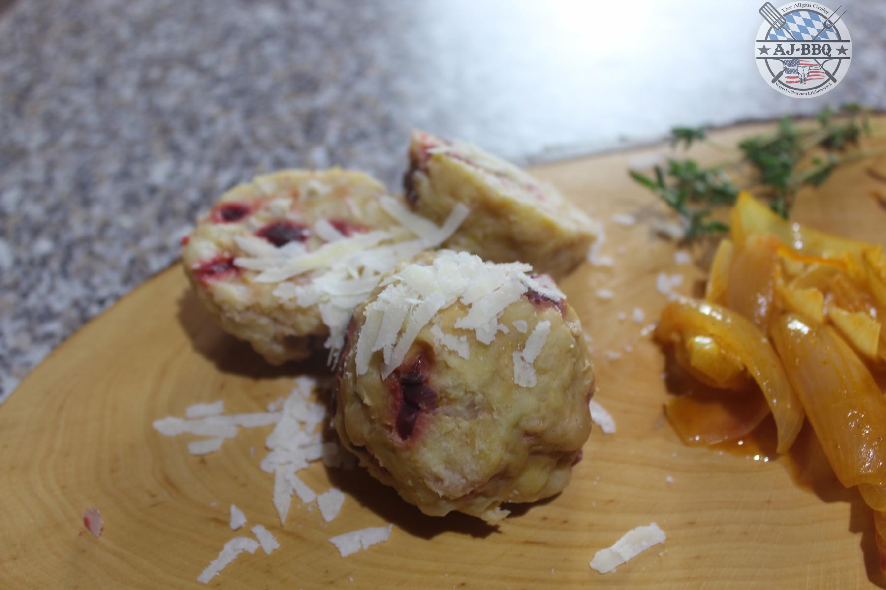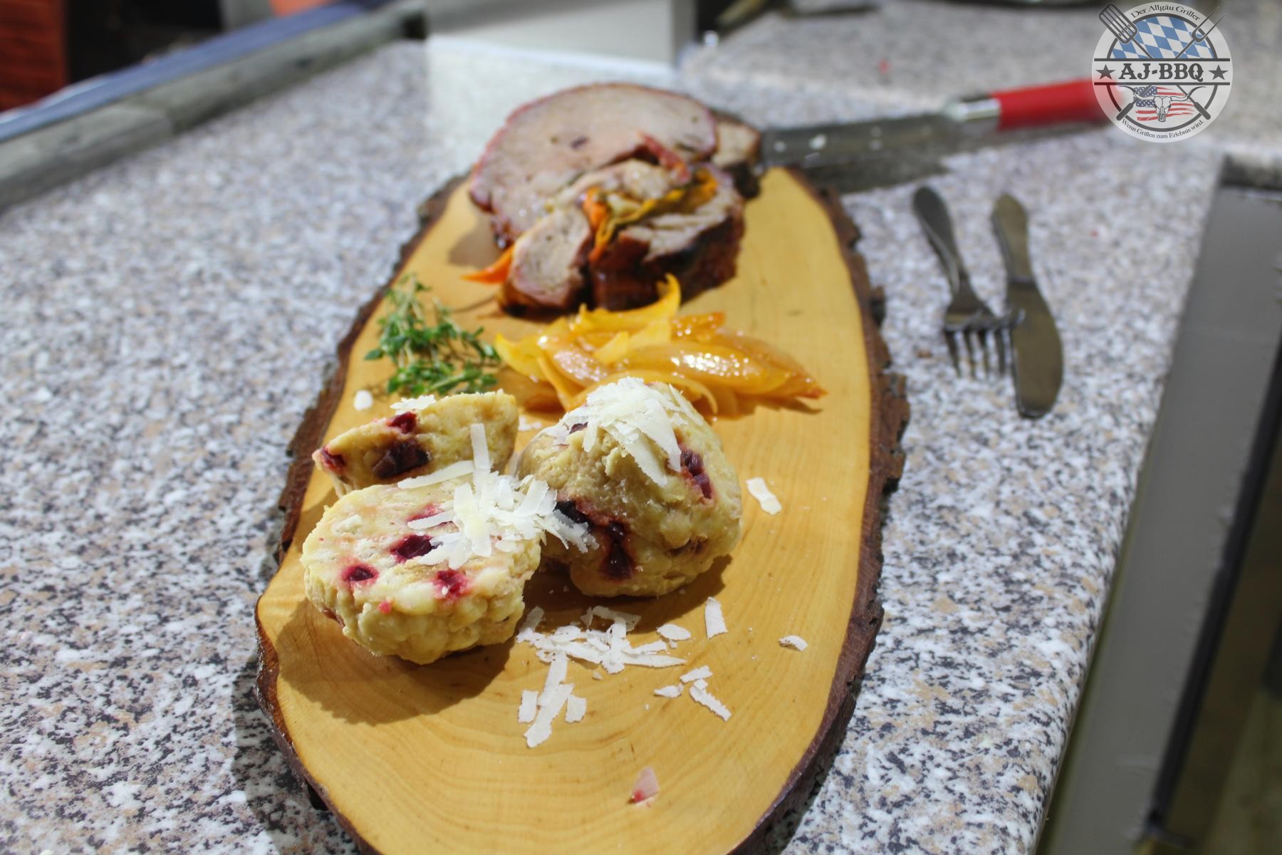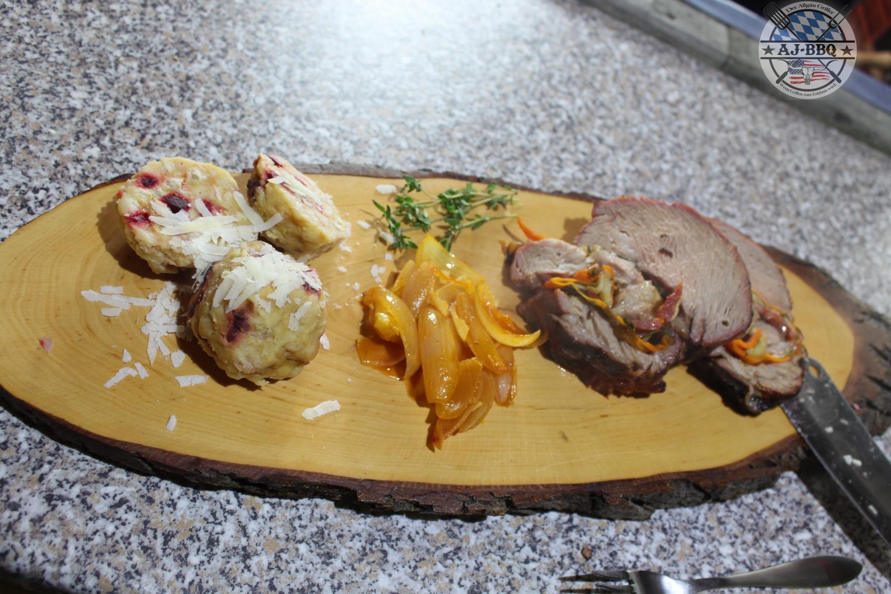 - Nach wie gesagt etwa 2,5 Stunden oder bei einer Kerntemperatur von 60°C ist dann auch der Braten fertig. Die Knödel können entweder gleich heiß dazu serviert werden oder, sofern ihr noch Platz auf dem Grill habt, in Scheiben geschnitten leicht angegrillt werden. Egal für was ihr euch entscheidet, diese Knödel sind super lecker.