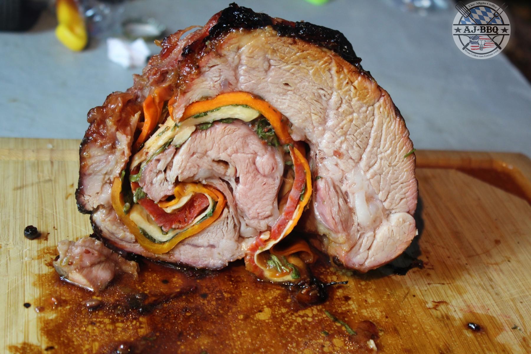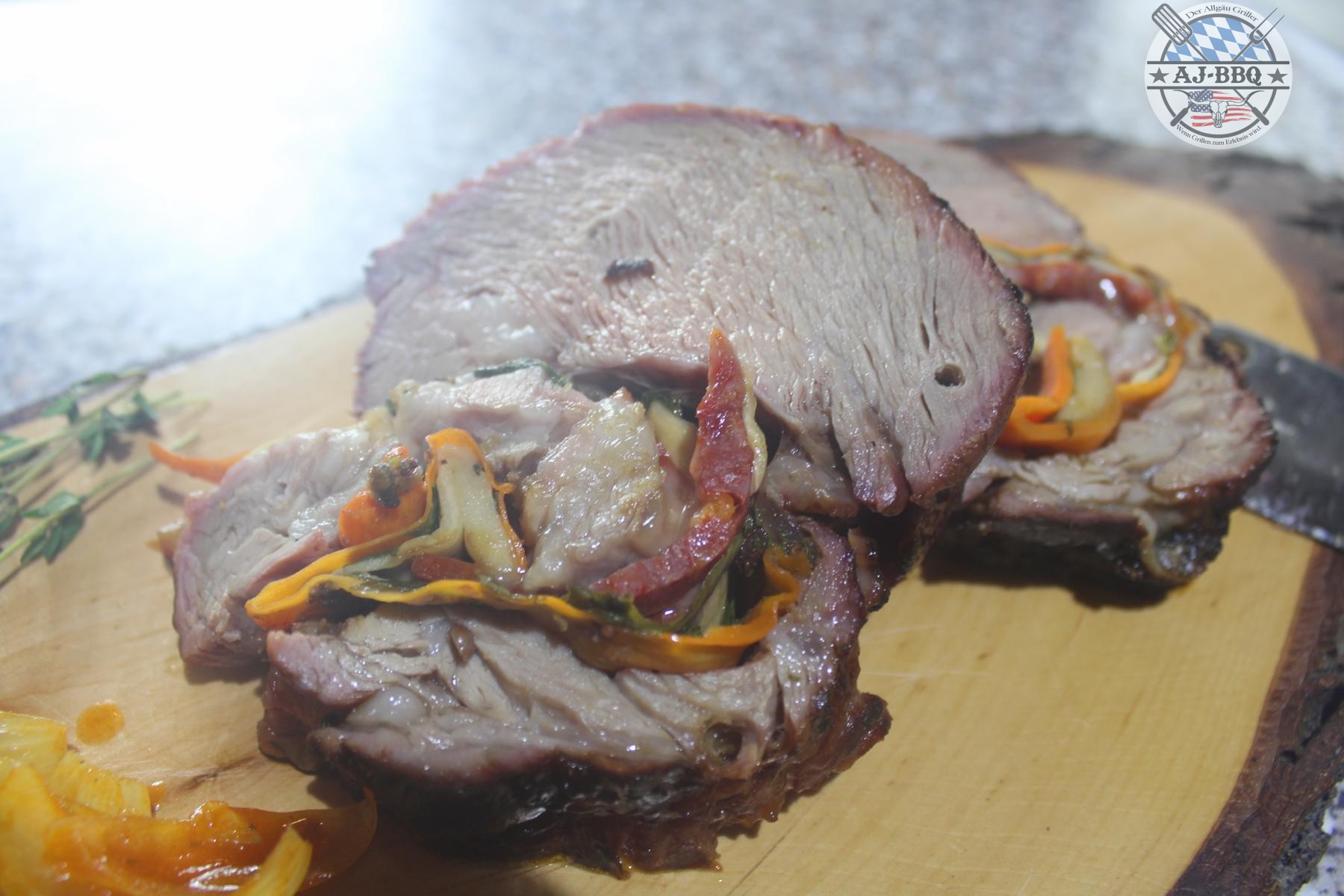 fest zusammen, damit sich die Rolle nicht wieder öffnet und nichts der Füllung herausfällt. Solltet ihr nicht wissen, wie man einen Rollbraten bindet, schaut ihr euch am besten das Video (https://youtu.be/-GW8S4D-LB0) an, darin erkläre ich euch ab Minute 4:50 meine Methode.