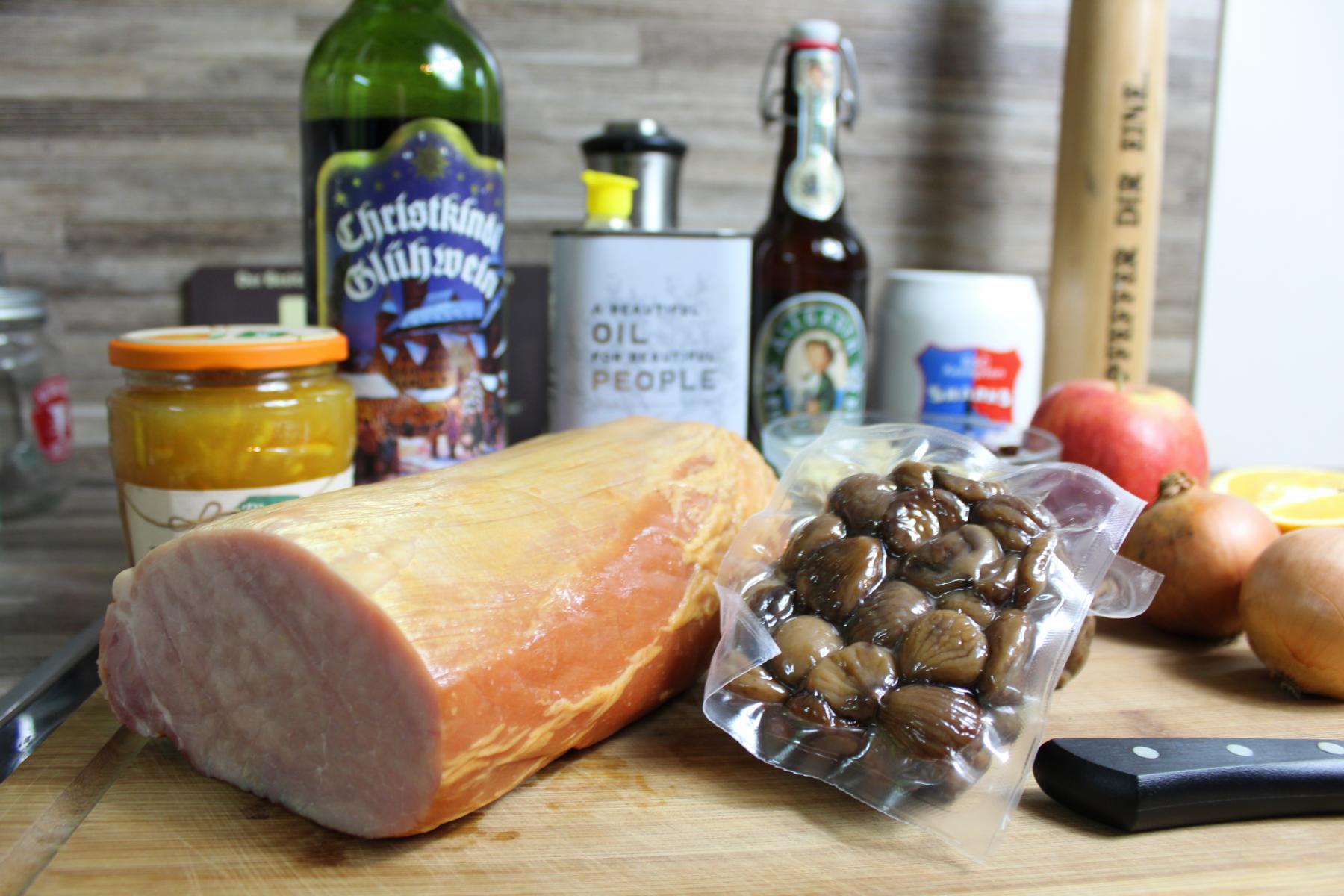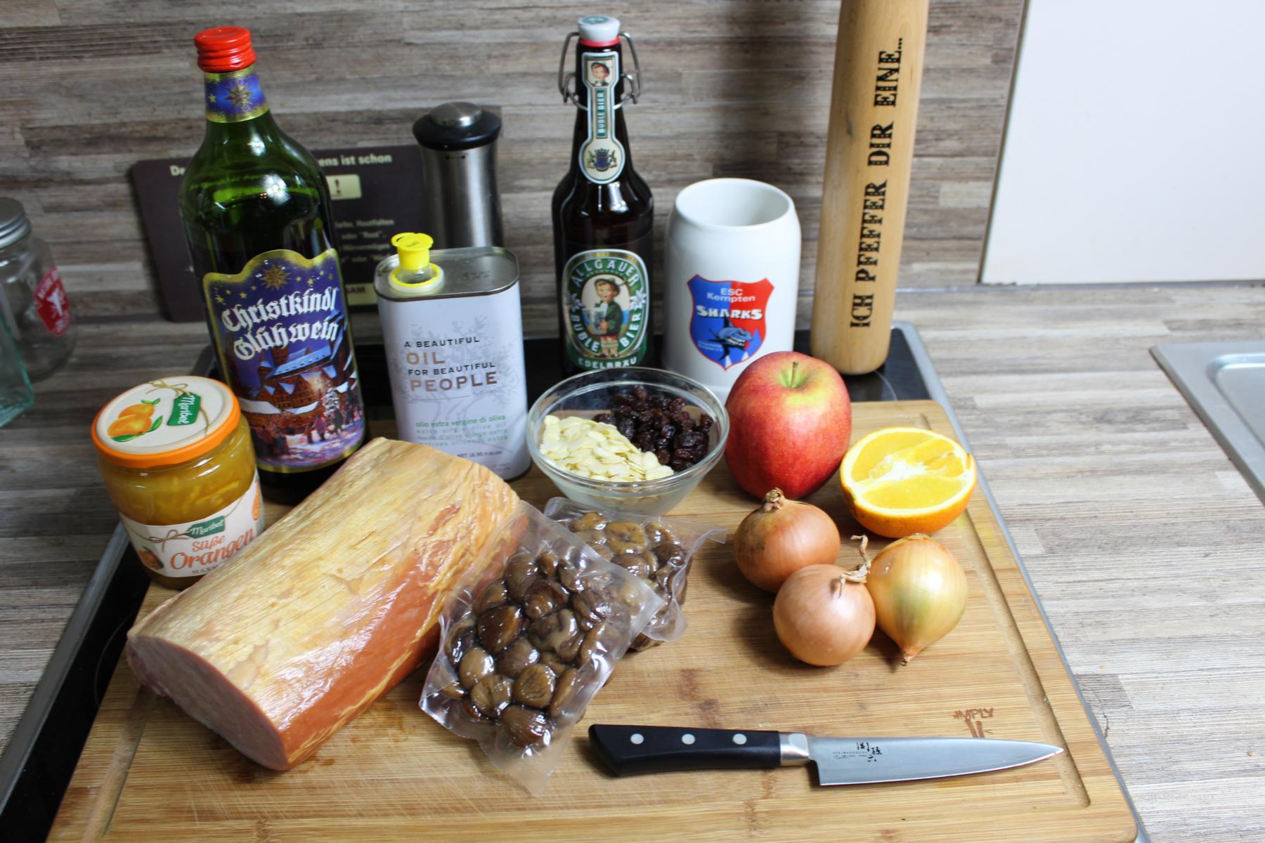 - Nach 30 Minuten kommen dann die restlichen Zutaten dazu. Ich gebe also den Saft der halben Orange, die Maronen, die Rosinen und die Mandelsplitter dazu. Außerdem muss schon etwas Glühwein nachgegossen werden. Nun wird alles noch miteinander vermischt, wieder verschlossen und weitere 60 Minuten gegart. In dieser Zeit muss ich nur ab und zu nach dem Flüssigkeitsstand schauen und ggf. mit Glühwein auffüllen.