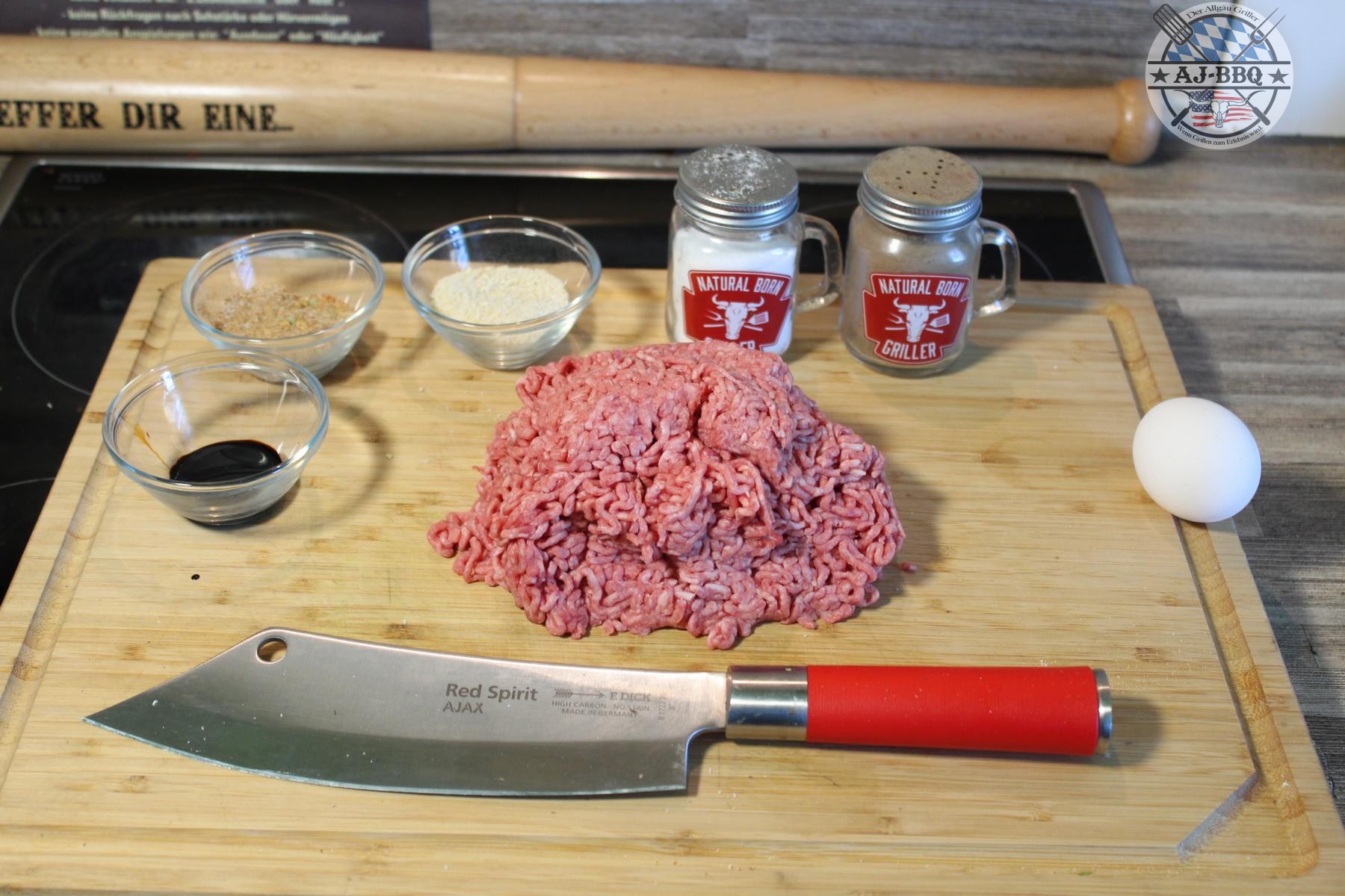- Dazu kommen dann das Hackfleisch, das Ei, das Paniermehl, die Sojasauce, Salz, Pfeffer und die