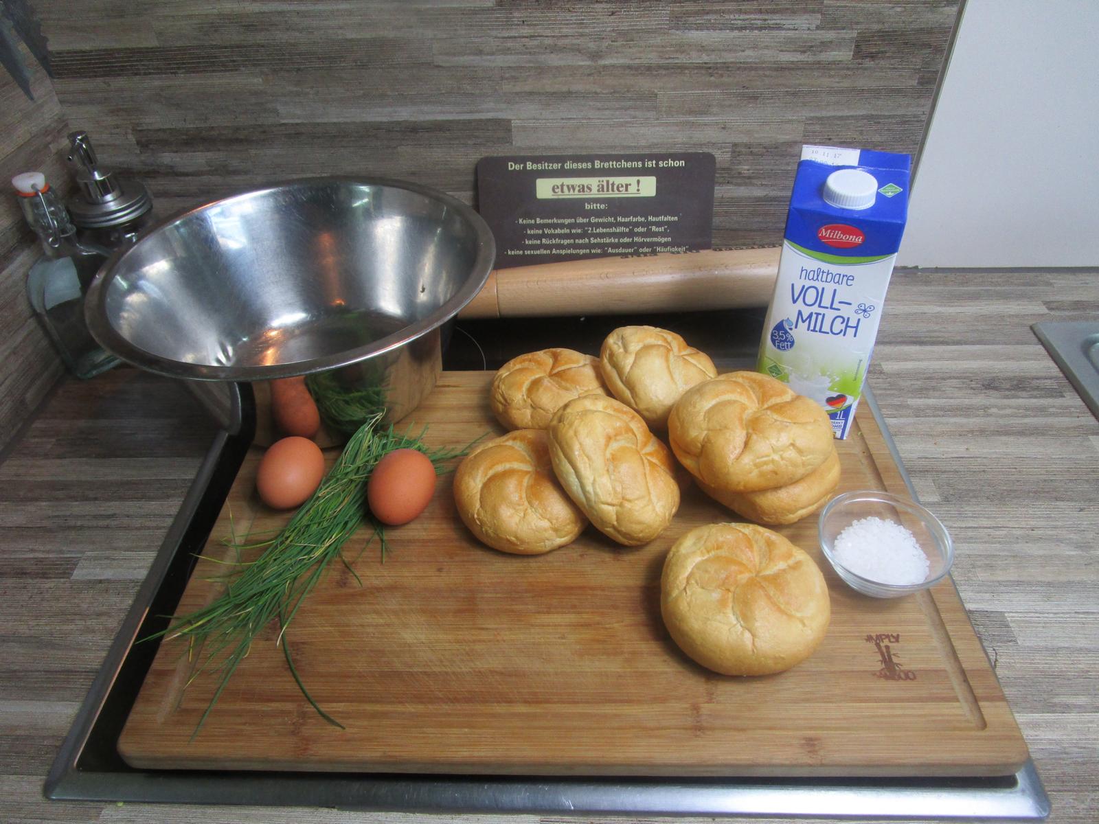 - So bleibt nun alles im Grill bis zu einer Kerntemperatur von 65°C. In der Zwischenzeit kümmere ich mich um die Knödel. Dafür schneide ich die Semmeln in Würfel und gebe diese in eine Schüssel. Dann kommt die lauwarme Milch, der gehackte Schnittlauch, die Eier, Salz und Pfeffer dazu. Aus diesen Zutaten knete ich nun den Knödelteig. Sollte dieser noch zu feucht sein, kann er mit Semmelbröseln angedickt werden. Da der Knödel heute gegrillt werden soll, brauch ich auch einen etwas festeren Teig.