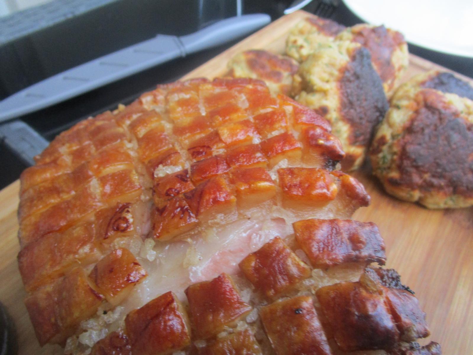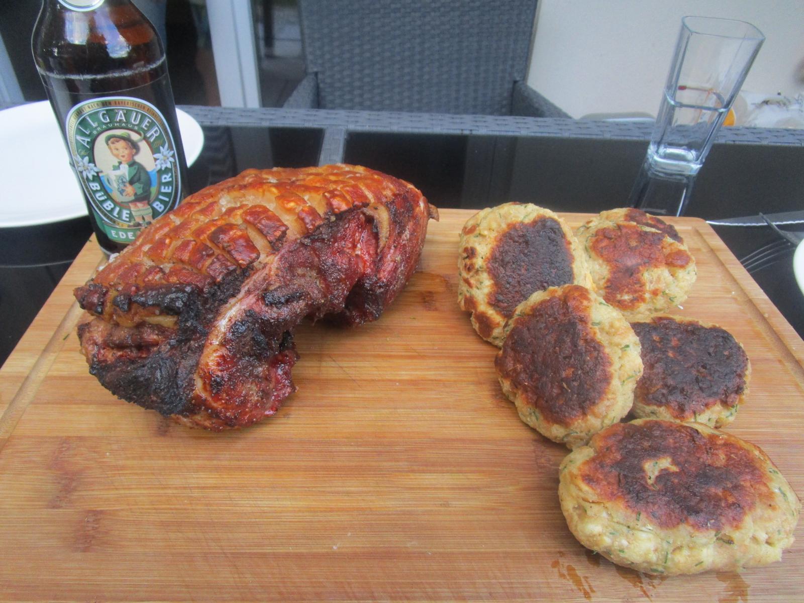 - Nach Ablauf der 2 Stunden habe ich die Schwarte abgetrocknet und die Einschnitte mit Salz eingerieben. Dann kommt alles in einen Bräter auf ein Gitter und schon kann der Grill vorgeheizt werden. Wer eine Soße zu seinem Braten herstellen möchte, der gibt jetzt einfach Wurzelgemüse unter ihn in den Bräter und später wird daraus eine fantastische Soße.