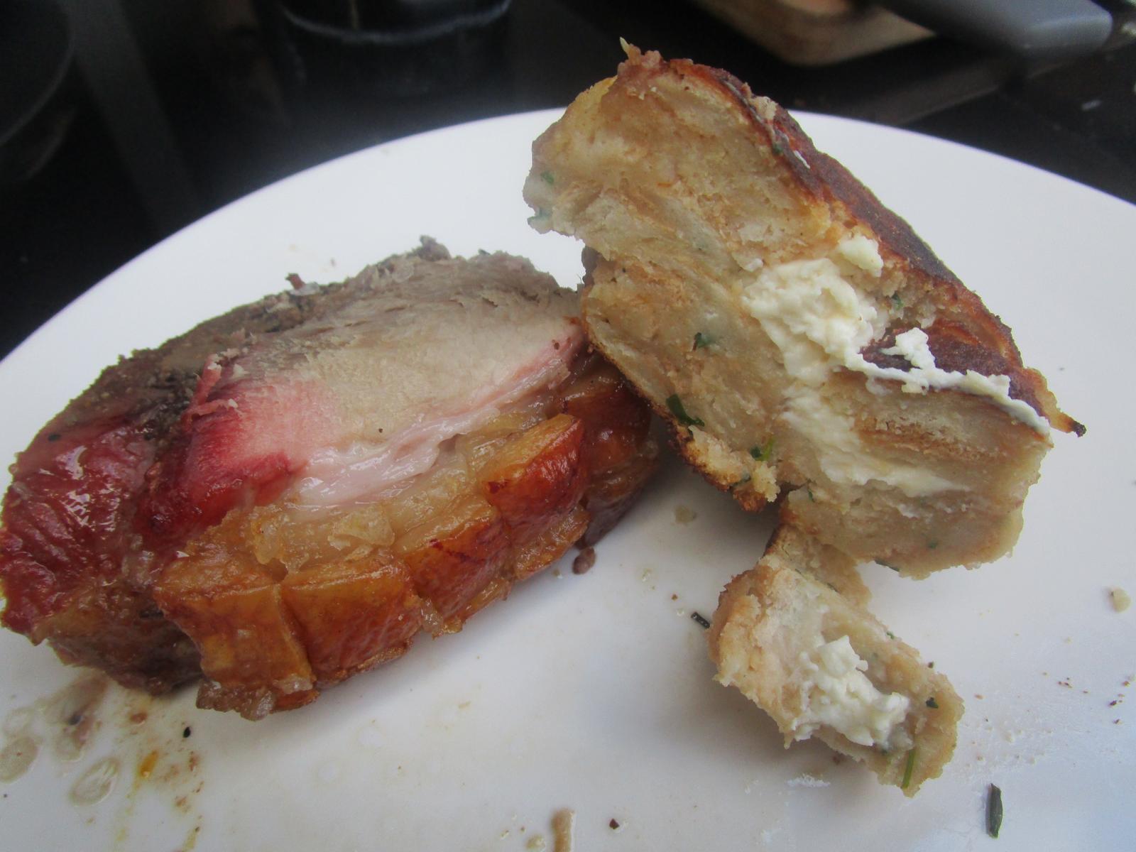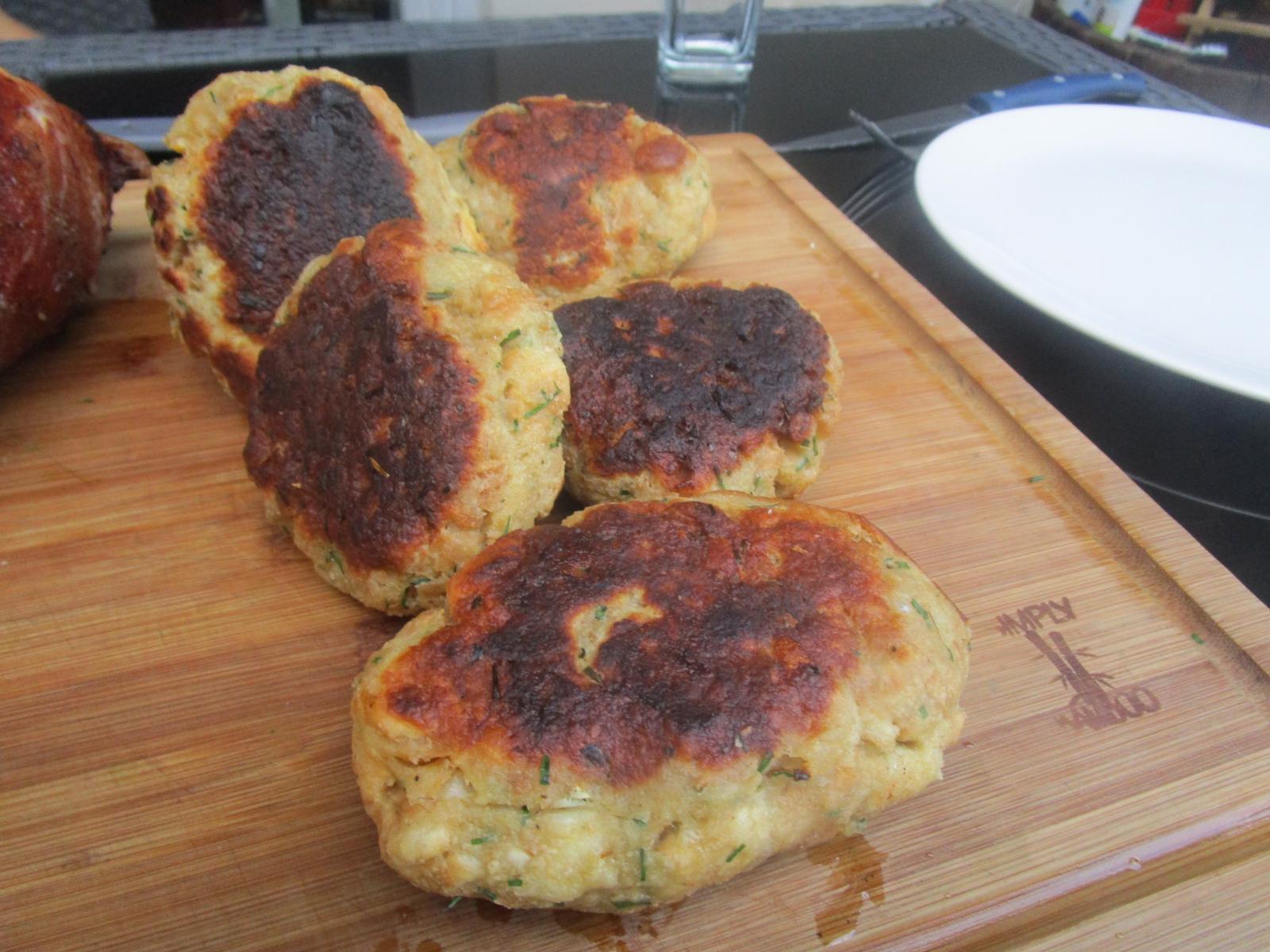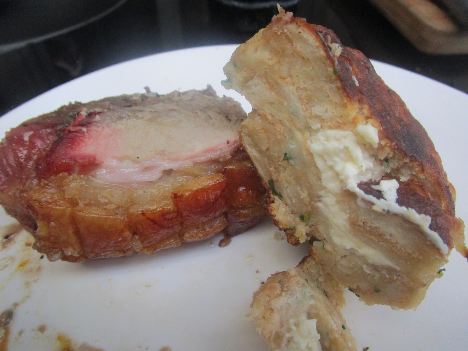 - Etwa 20 Minuten vor dem Ende der Grillzeit heize ich mir im Kugelgrill über direkter hoher Hitze eine Eisenpfanne vor, gebe Olivenöl hinein und grille dort meine Semmelknödel. Das dauert etwa insgesamt 15 Minuten. Dabei mehrmals wenden, damit nichts anbrennt.