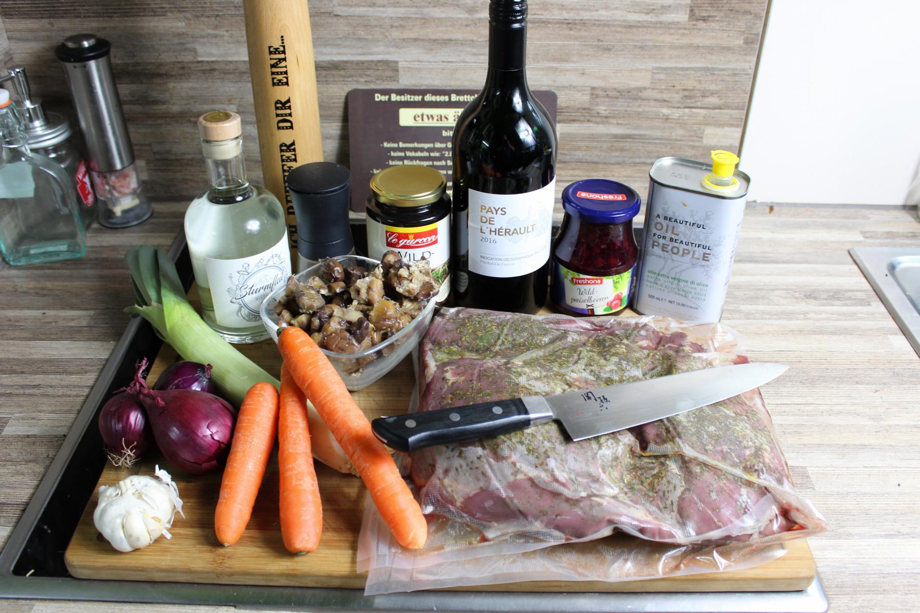 - Als nächstes kommt noch der Wildfond, der Rotwein und 2 EL Preiselbeeren in den Dutch Oven und schon kann der Deckel drauf.