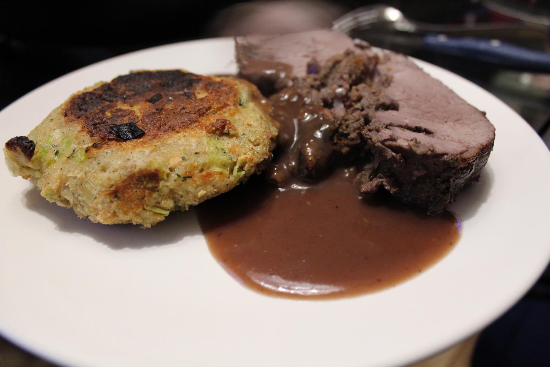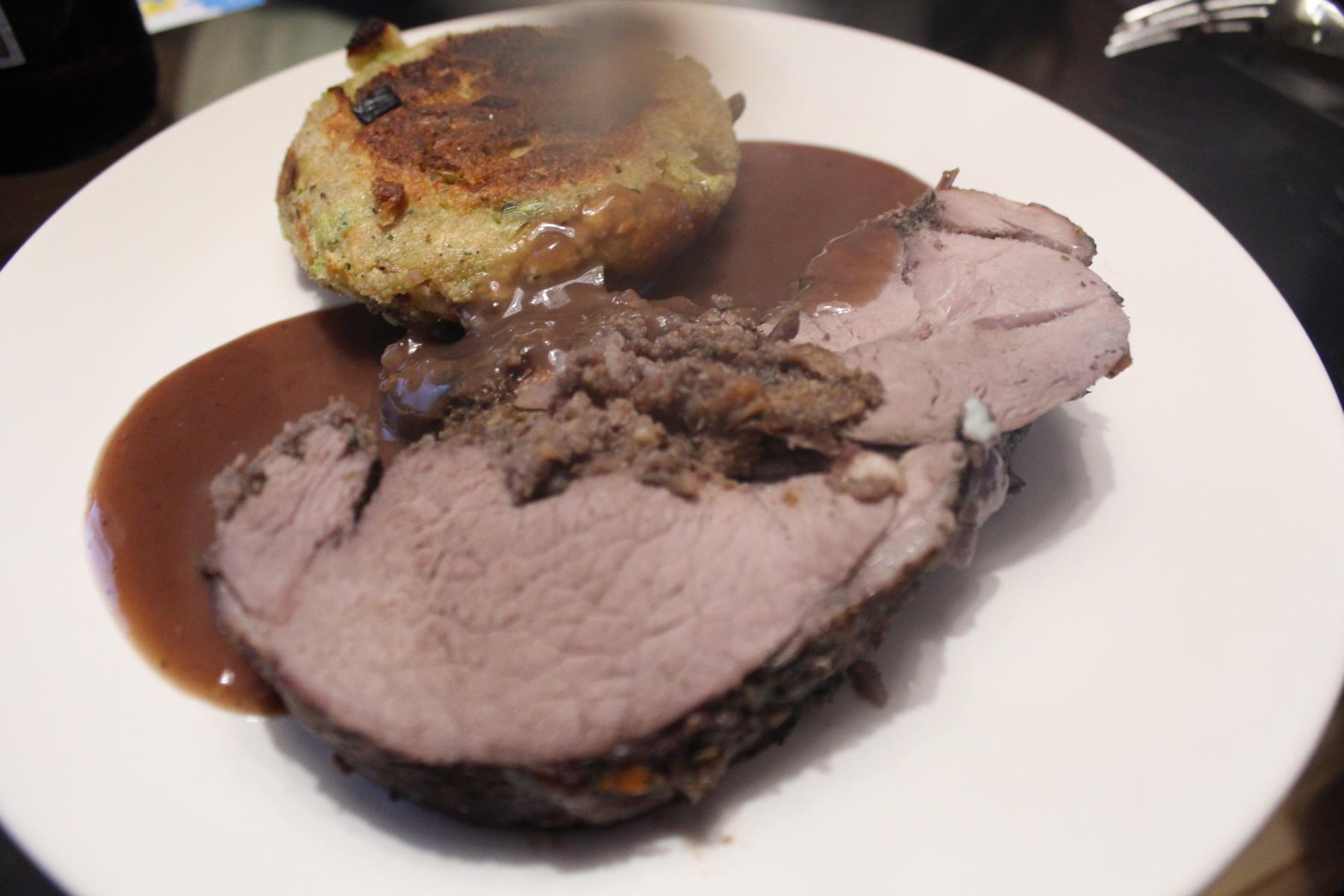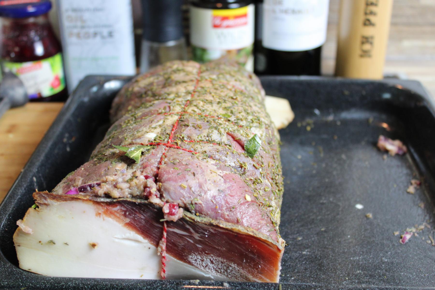 - Jetzt gebe ich die Füllung auf die Wildschweinkeule und lasse dabei wie immer beim Füllen am äußeren Rand etwas frei. Wenn ich nun das Fleisch zusammengeklappt habe und keine Füllung mehr austreten kann, binde ich den so entstandenen Braten mit Küchengarn zusammen. Die Stöße verschließe ich noch mit jeweils einer dicken Scheibe Bacon.