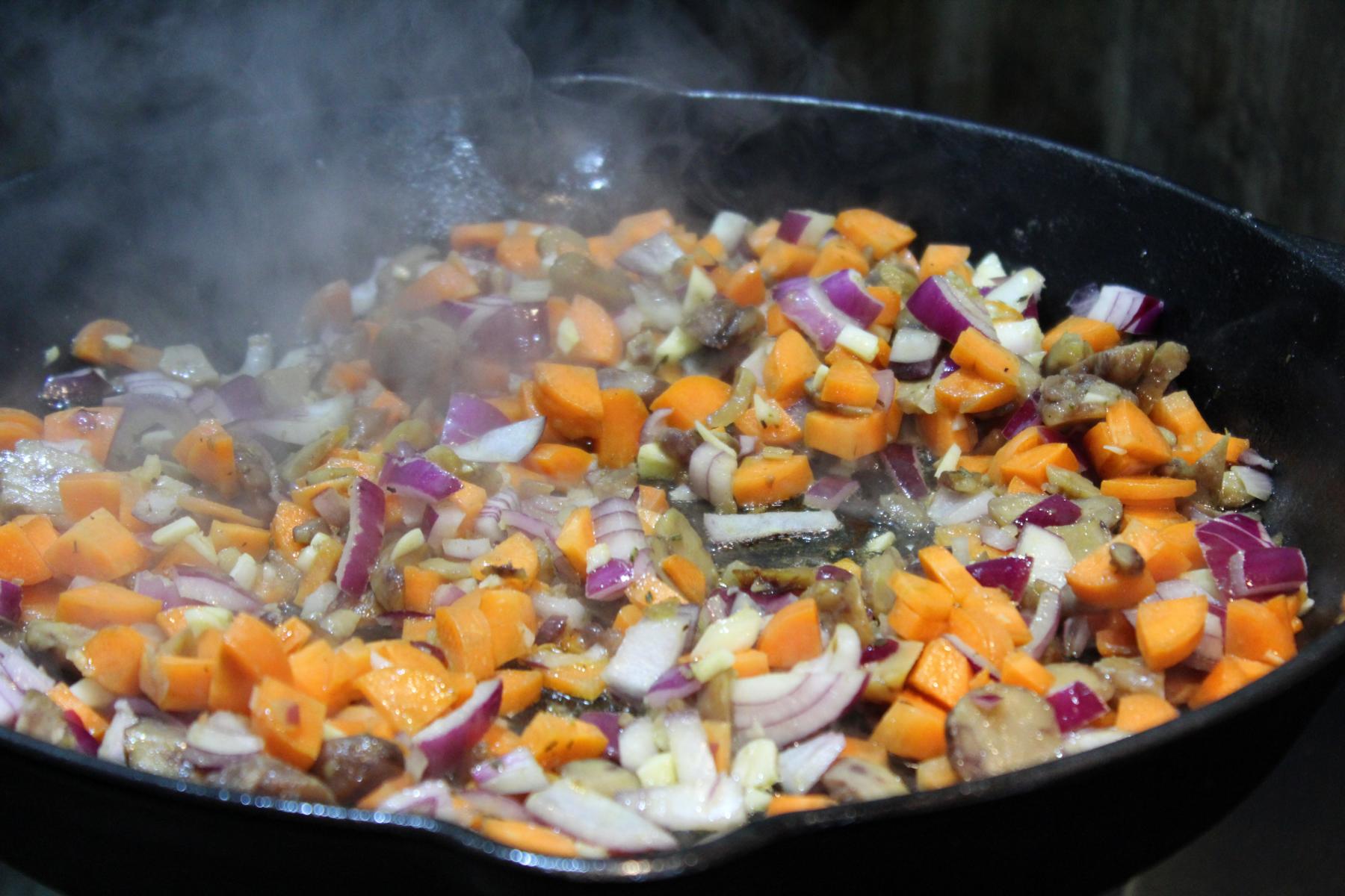 - Wenn dies getan ist, lege ich die Keule schon mal in die Kastenform und dünste in der Pfanne noch das Gemüse an. Dieses gebe ich dann unter die Keule in den Dutch Oven.