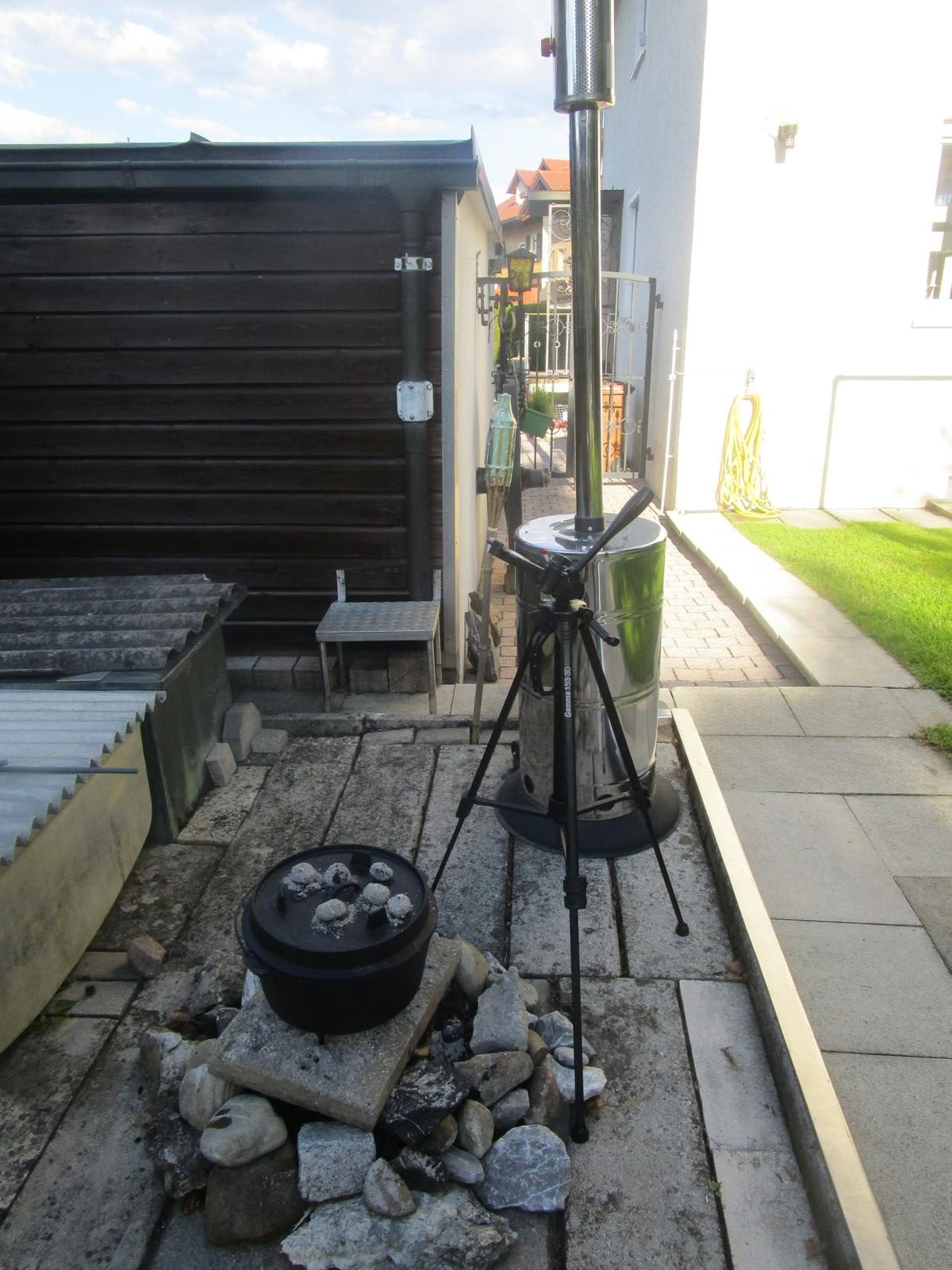 - Jetzt schließe ich den Dutch Oven und lege noch ein paar heiße Briketts auf den Deckel. So lasse ich dann alles für ca. 50 Minuten köcheln. Nach Ablauf der 50 Minuten gebe ich noch die grünen Bohnen hinein, decke alles wieder ab und lasse es weitere 10 Minuten kochen.