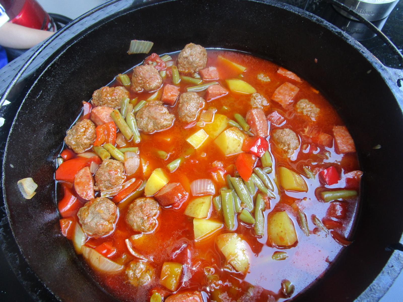 - Als nächstes lösche ich alles mit dem Kaffee, den Tomaten und der Brühe ab. An dieser Stelle kommen auch noch die Kartoffeln in den Dutch Oven. Jetzt rühre ich alles durch, damit sich alles gleichmäßig verteilt und dann dürfen auch die Hackbällchen wieder zurück in den Dopf.
